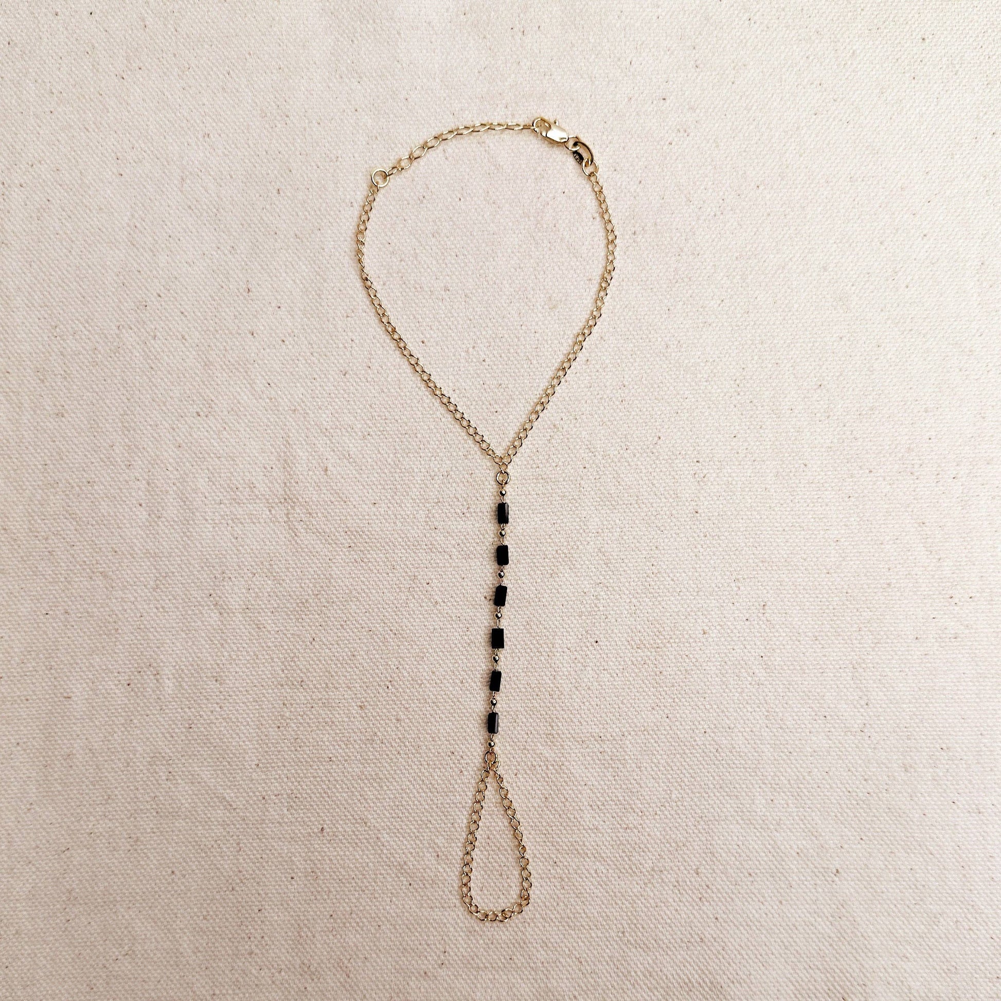 Make a bold statement with this striking hand chain adorned with black crystals. Its daring design adds a festive edge and instantly elevates any outfit. Crafted from 18k gold-filled metal with black glass crystals, this accessory measures 6 inches with a 1.5-inch extender. Hypoallergenic, waterproof, and meticulously handcrafted in Brazil, it lets you shine confidently wherever you go.