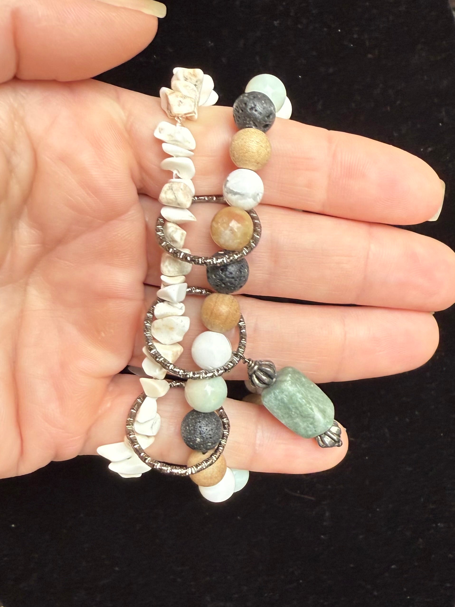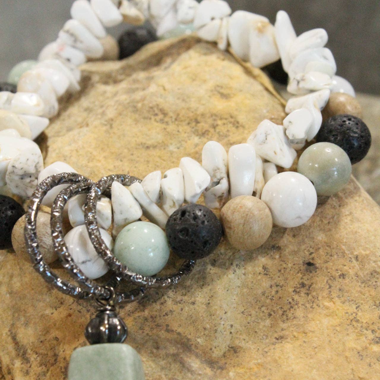 Elemental Balance embraces a fearless spirit by combining raw natural materials with a touch of bohemian charm. White stone chips, rugged lava beads, and earthy accents come together around a bold rectangular green stone pendant framed by a shimmering loop. Made in the USA, this beautiful piece blends blue, bronze, and green tones using bronze, glass, gunmetal, shell, and stones like amazonite and aquamarine. Enhance your everyday look with this thoughtful accessory that brings texture, balance, and a gentle confidence to your style.