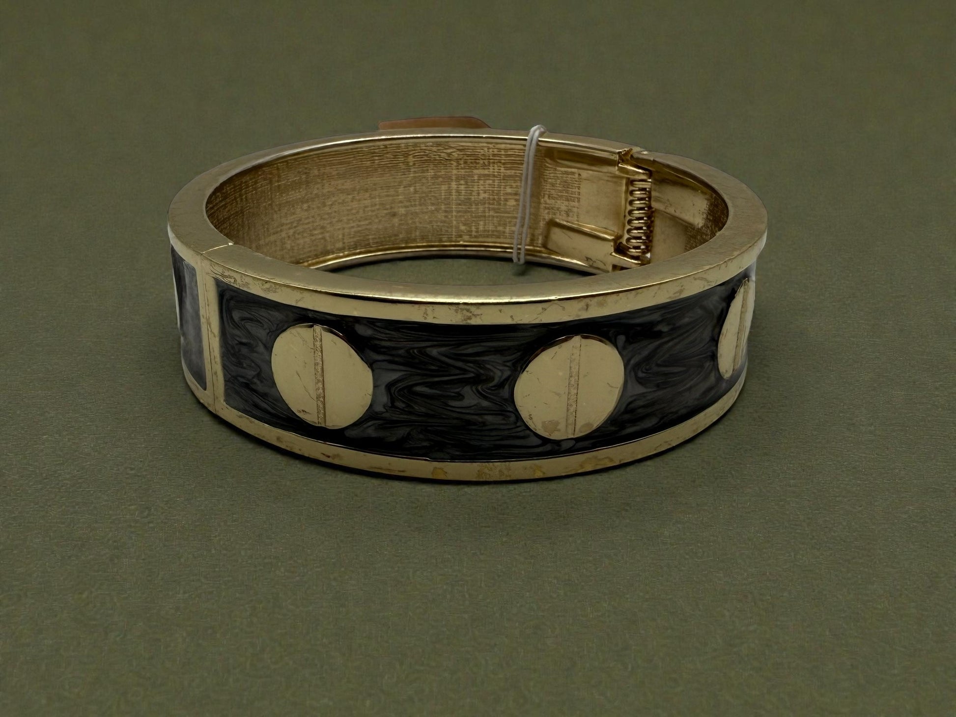 A bold statement with a refined edge. This vintage cuff bracelet features a rich gold-tone frame accented by a smoky marbled resin inlay and sleek circular stud details. The wide silhouette delivers effortless impact, while the neutral palette makes it endlessly versatile—from denim and knits to elevated evening looks.