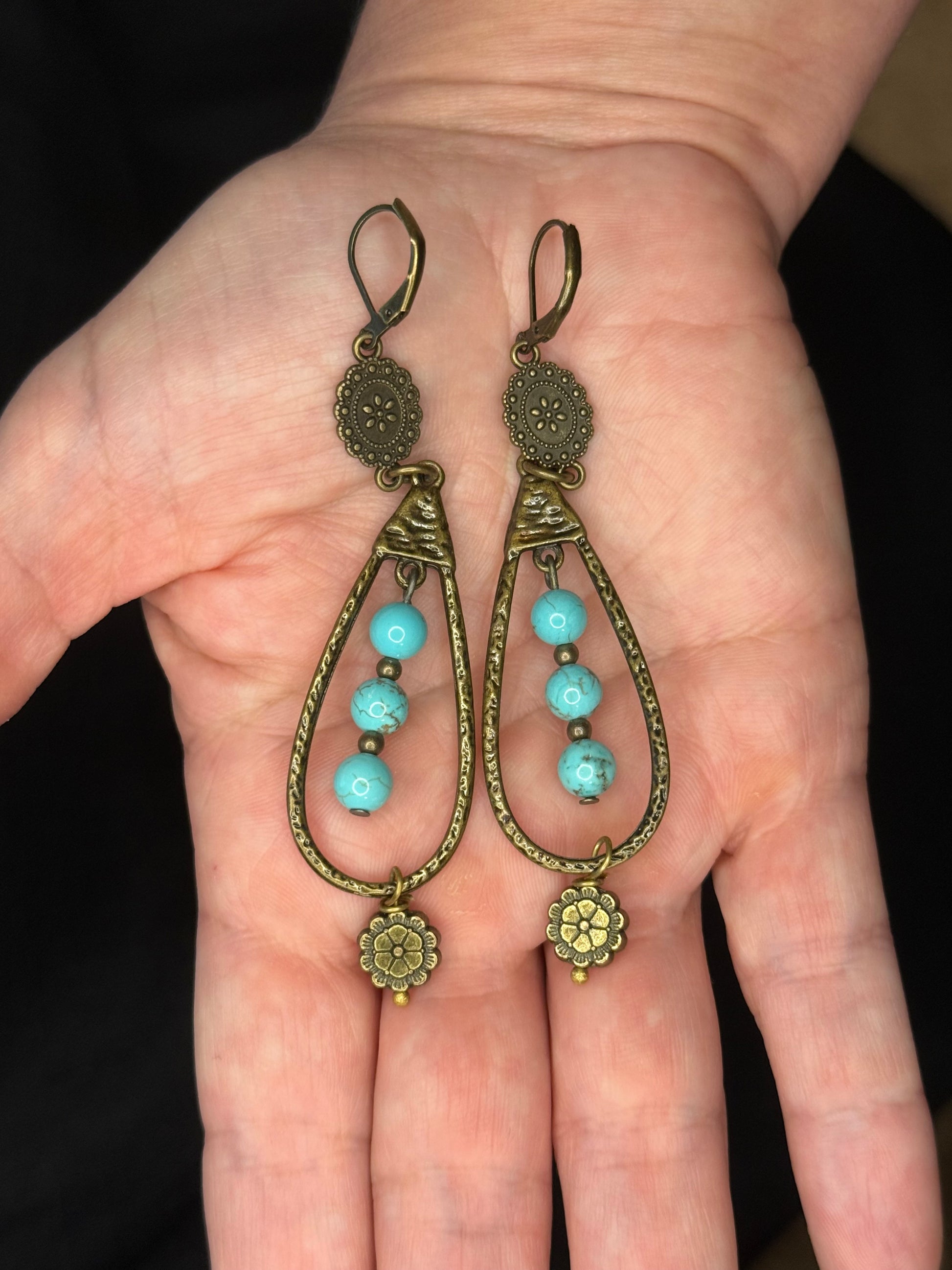 Bring a bold touch of nature's magic to your style with Wildflower Sky! These earrings feature antique brass teardrop frames paired with vibrant turquoise-like beads and delicate floral charms inspired by desert blossoms swaying under the endless sky. Lightweight and effortlessly cool, they inject a fearless boho edge into any look. Proudly crafted in the United States from brass and turquoise stones.