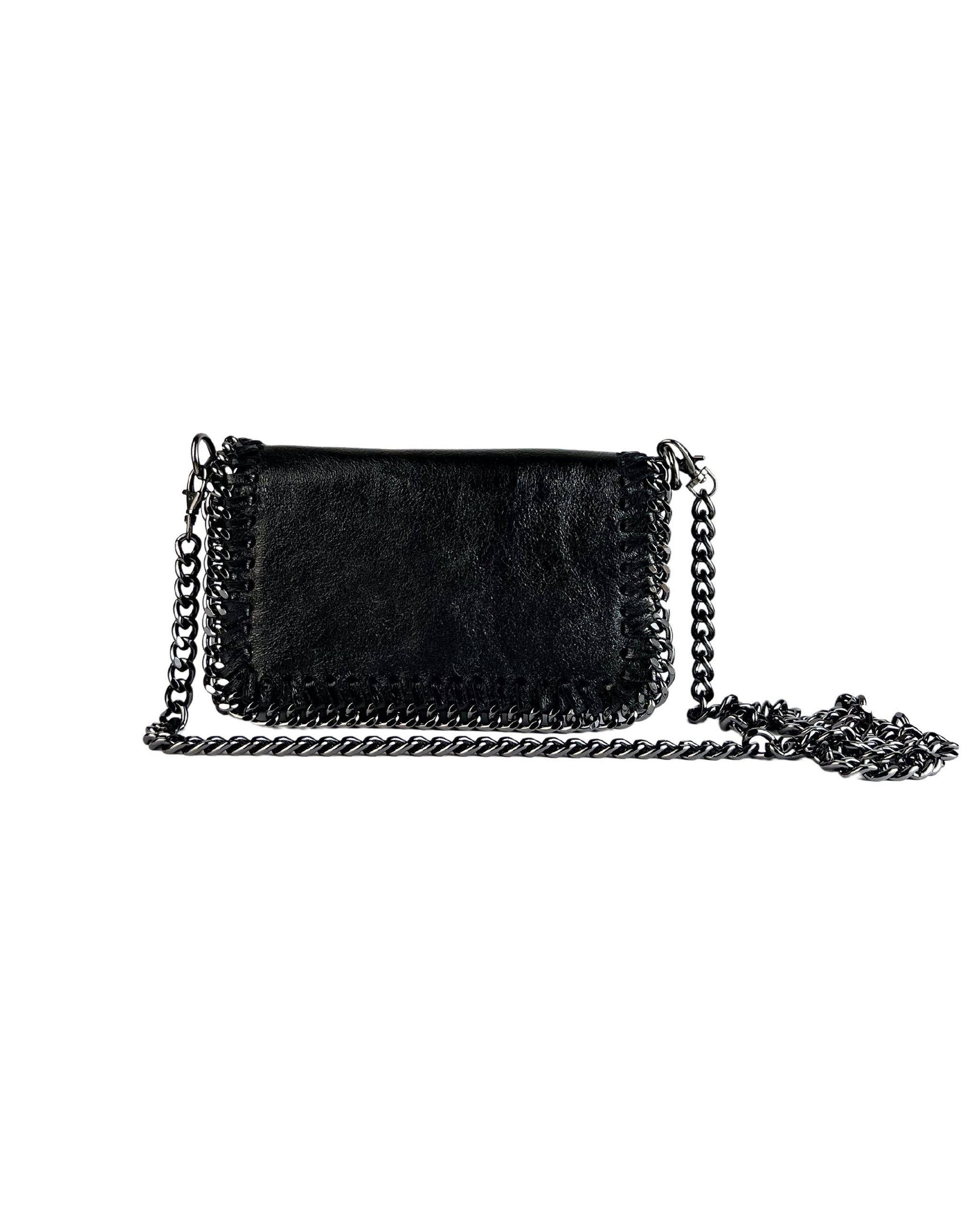 Meet the Midnight Edge Crossbody with Chains—a daring metallic black leather bag made in Italy. Sized at 22 cm x 14 cm x 7 cm, it features black zipper and metal accents, paired with a bold black chain strap that lets you rock a confident crossbody look.