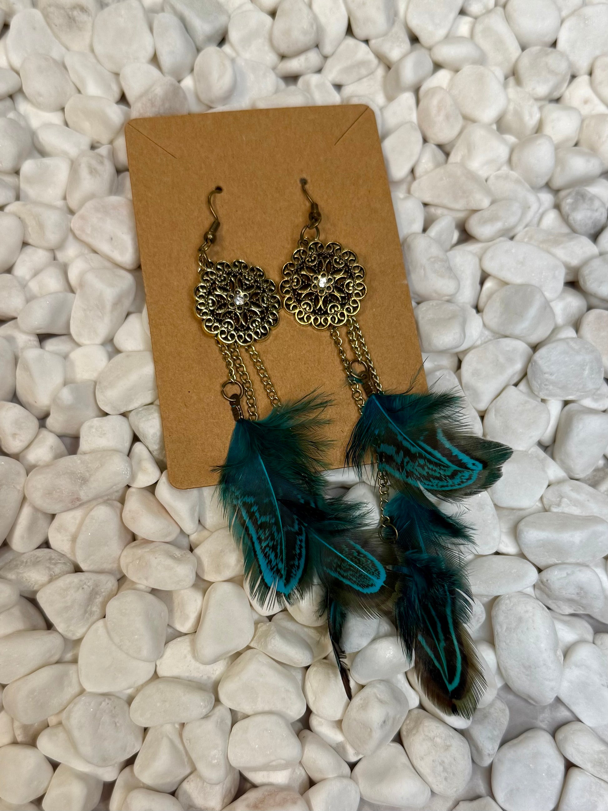 Unleash your bold spirit with these striking Boho Dreamcatcher Feather Earrings. Showcasing detailed bronze filigree inspired by traditional dreamcatchers, they cascade with vivid teal and rich green feathers that command attention. Suspended from fine chains, their dynamic sway adds an edgy flair, making them the ultimate statement piece for anyone ready to elevate their boho style with fearless charm.