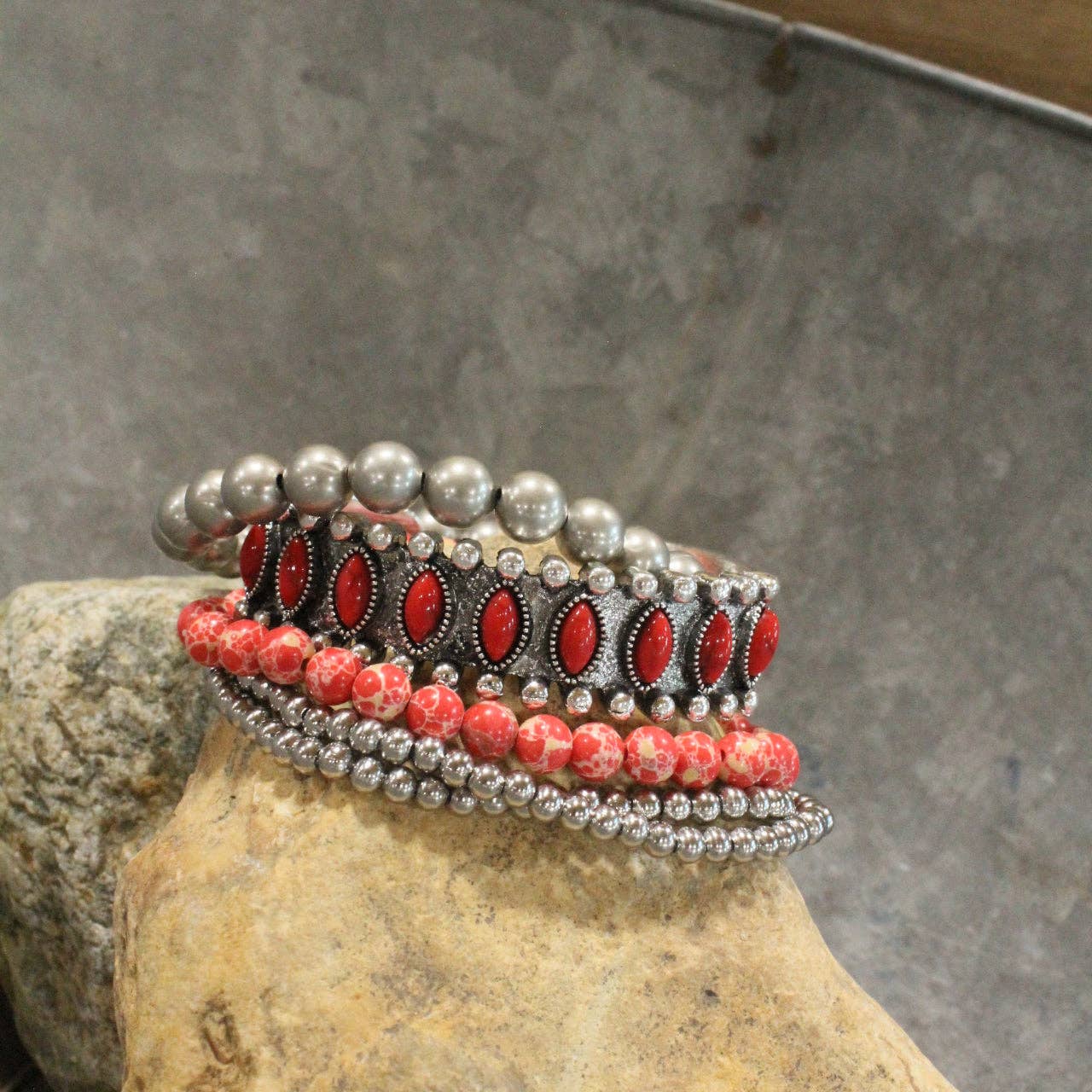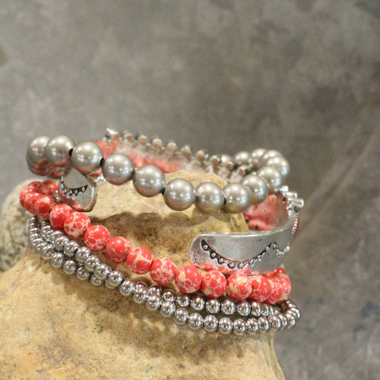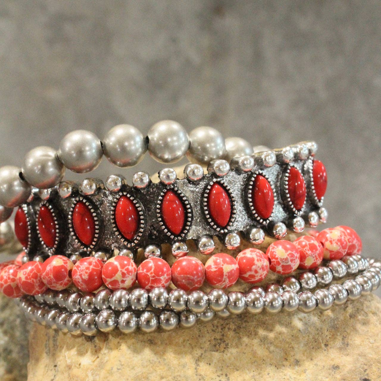 Fire & Steel stands out with unapologetic boldness and effortless style, created to be layered for maximum impact. This collection showcases shining silver beads, rich marbled red stones, and a meticulously crafted vintage-inspired bracelet, blending boho spirit with a fearless, modern attitude. Wear the entire set to command attention or combine pieces to express your audacious personality. Made in the USA from materials like acrylic, brass, bronze, clay, and sterling silver plating, this vibrant assortment of stones is made for those who dare to wear boho-chic every day.
