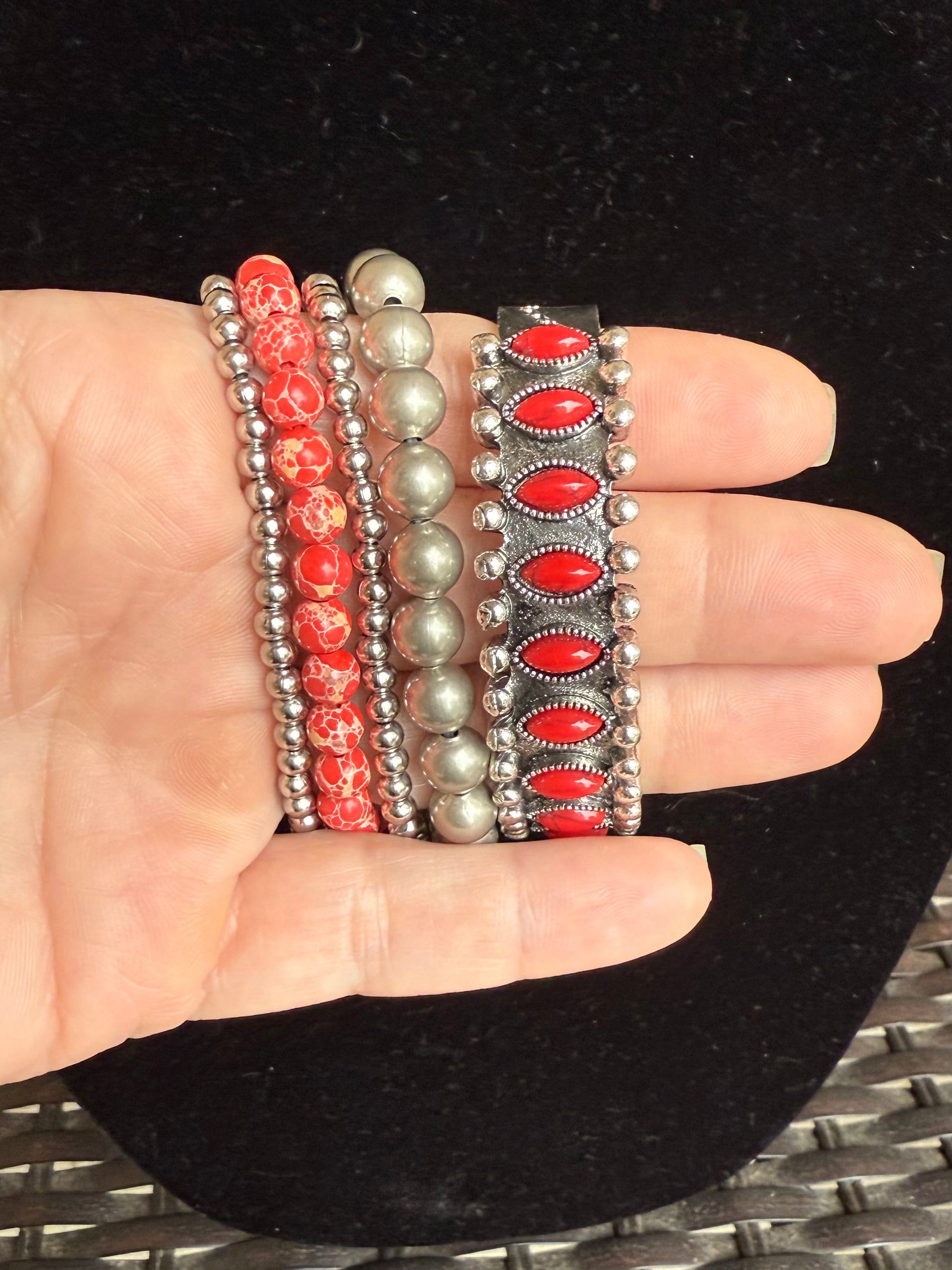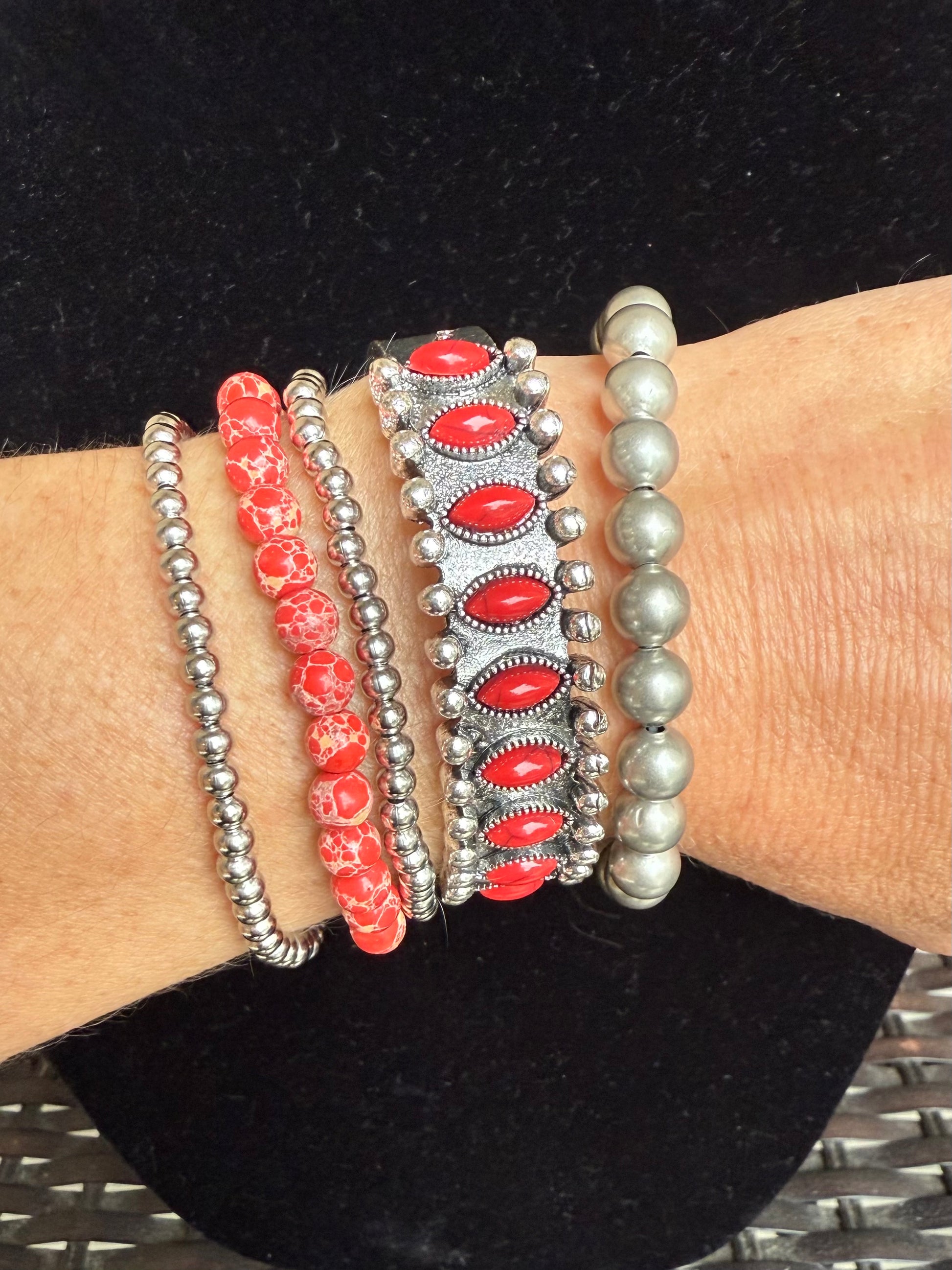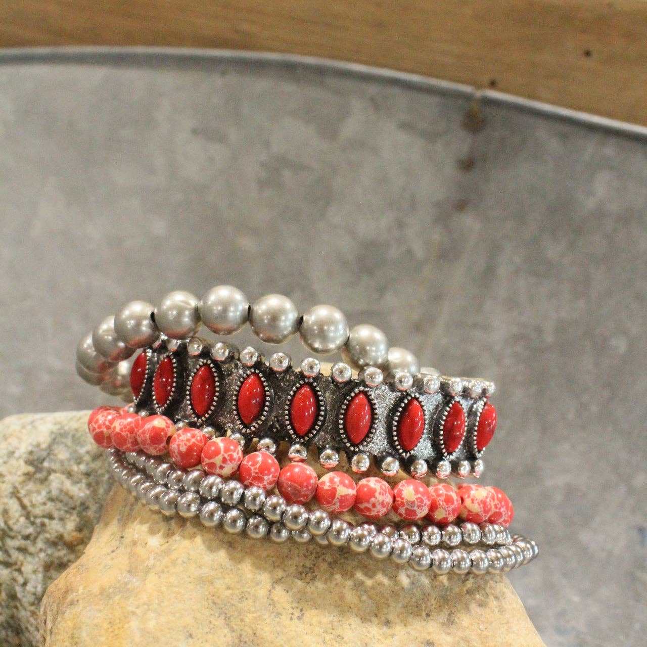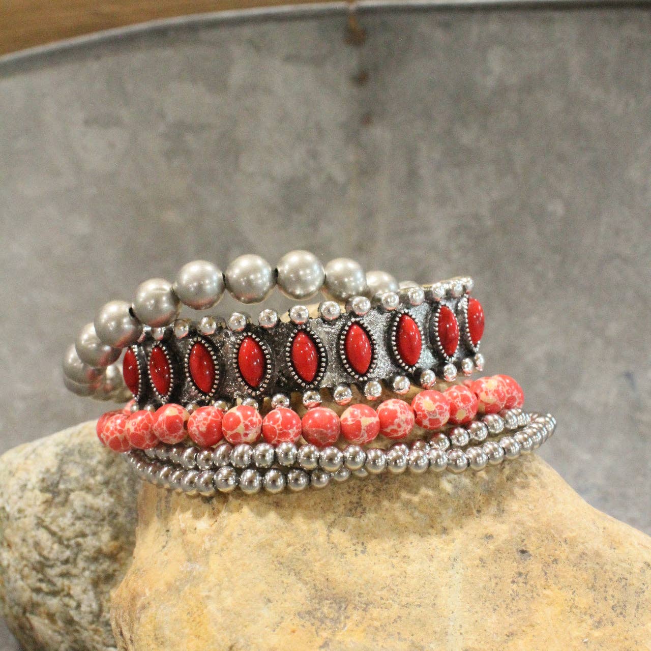 Fire & Steel stands out with unapologetic boldness and effortless style, created to be layered for maximum impact. This collection showcases shining silver beads, rich marbled red stones, and a meticulously crafted vintage-inspired bracelet, blending boho spirit with a fearless, modern attitude. Wear the entire set to command attention or combine pieces to express your audacious personality. Made in the USA from materials like acrylic, brass, bronze, clay, and sterling silver plating, this vibrant assortment of stones is made for those who dare to wear boho-chic every day.