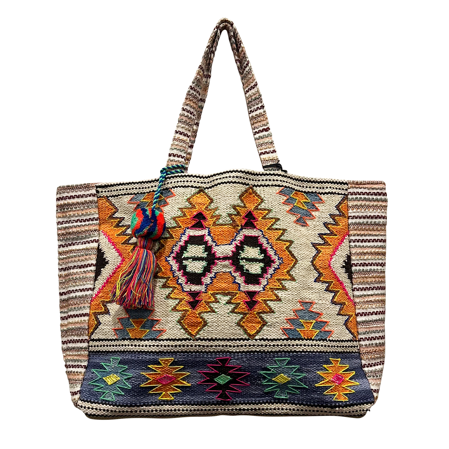 Add bold style to your everyday with the Geo Aztec Tapestry Tote Bag. Crafted from 100% cotton, this striking orange and beige tote showcases a daring Aztec-inspired pattern that demands attention. Its roomy interior fits all your essentials, whether you're hitting the market, beach, or on the move. With comfortable 12” handles and durable construction, this tote combines fearless fashion with practical function—perfect for those who aren’t afraid to stand out. Dimensions: 17" tall, 20" wide, 6.5" deep.
