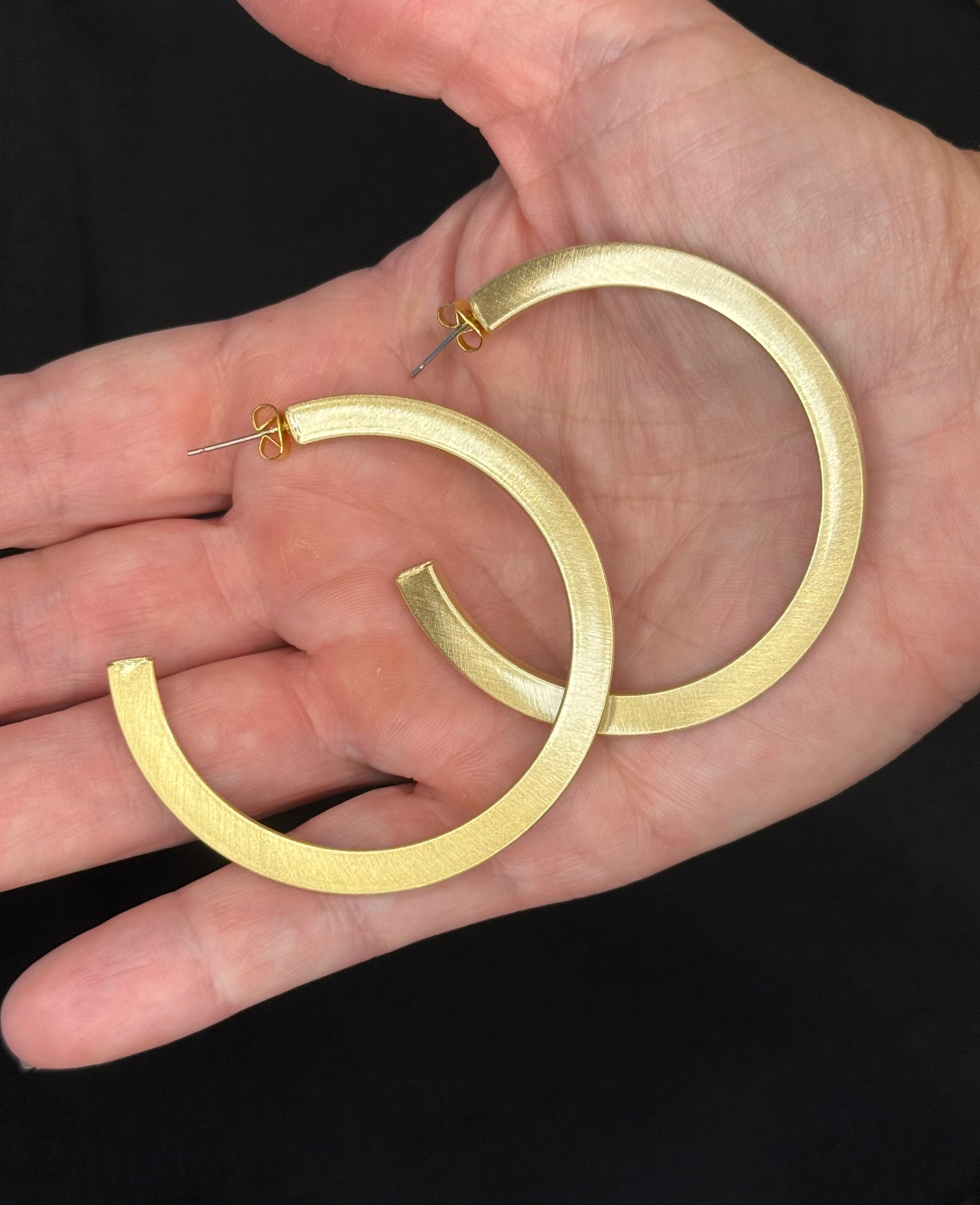 Bold in their understated design, the Golden Eclipse Earrings reinvent the classic gold hoop with a sleek open-circle form and gleaming golden sheen. Lightweight and versatile, they radiate effortless confidence. These earrings make a subtle yet striking statement, perfect for elevating everyday style. Crafted with a satin-finished, gold-plated open square shape and a refined tube detail, measuring about 2 in x 2 in x 0.15 in, they blend timeless elegance with a modern twist.