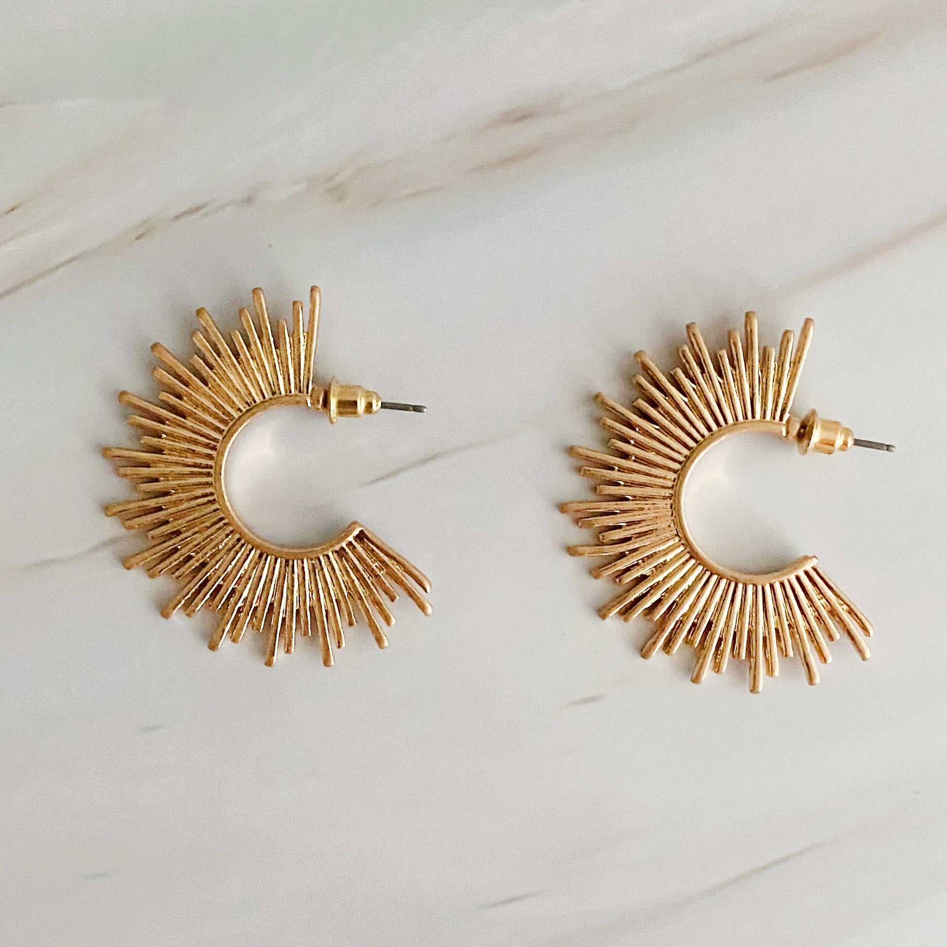 Turn heads with the Radiant Sunburst Earrings—bold gold hoops that embody the sun’s fierce energy. With their striking sunburst pattern and polished gold finish, these earrings blend cosmic strength with edgy style. Light on your ears but heavy on impact, they ignite any outfit instantly. Ideal for making a statement day or night. At about 1.5” in diameter, made from plated metal, and fully safe with lead and nickel compliance.