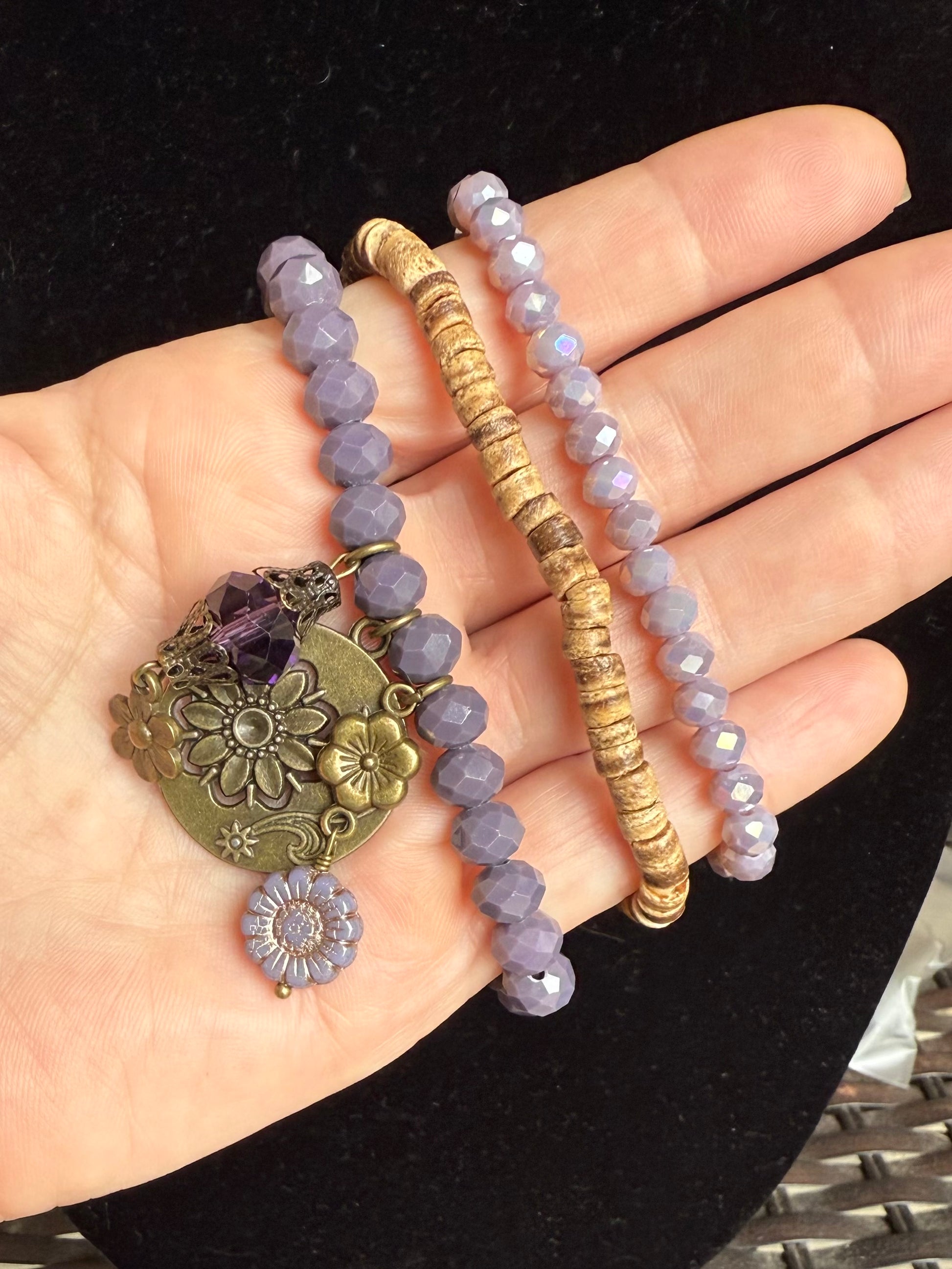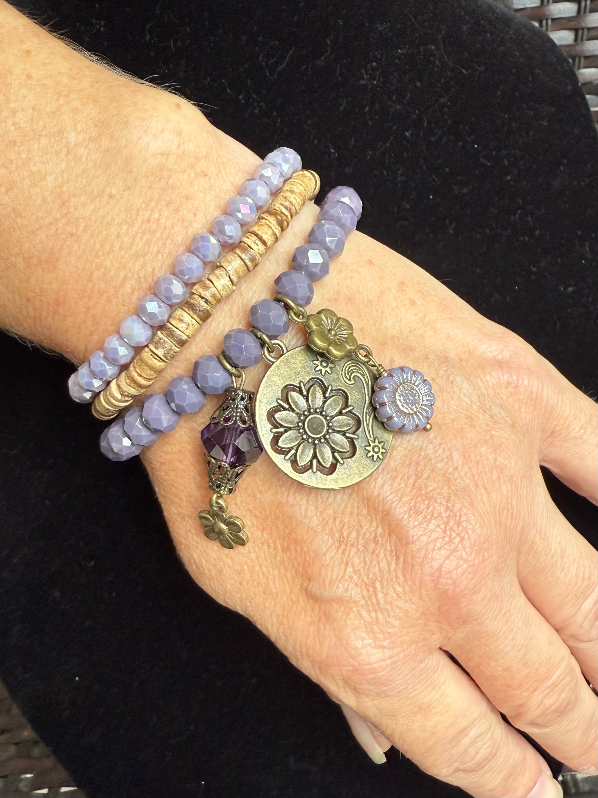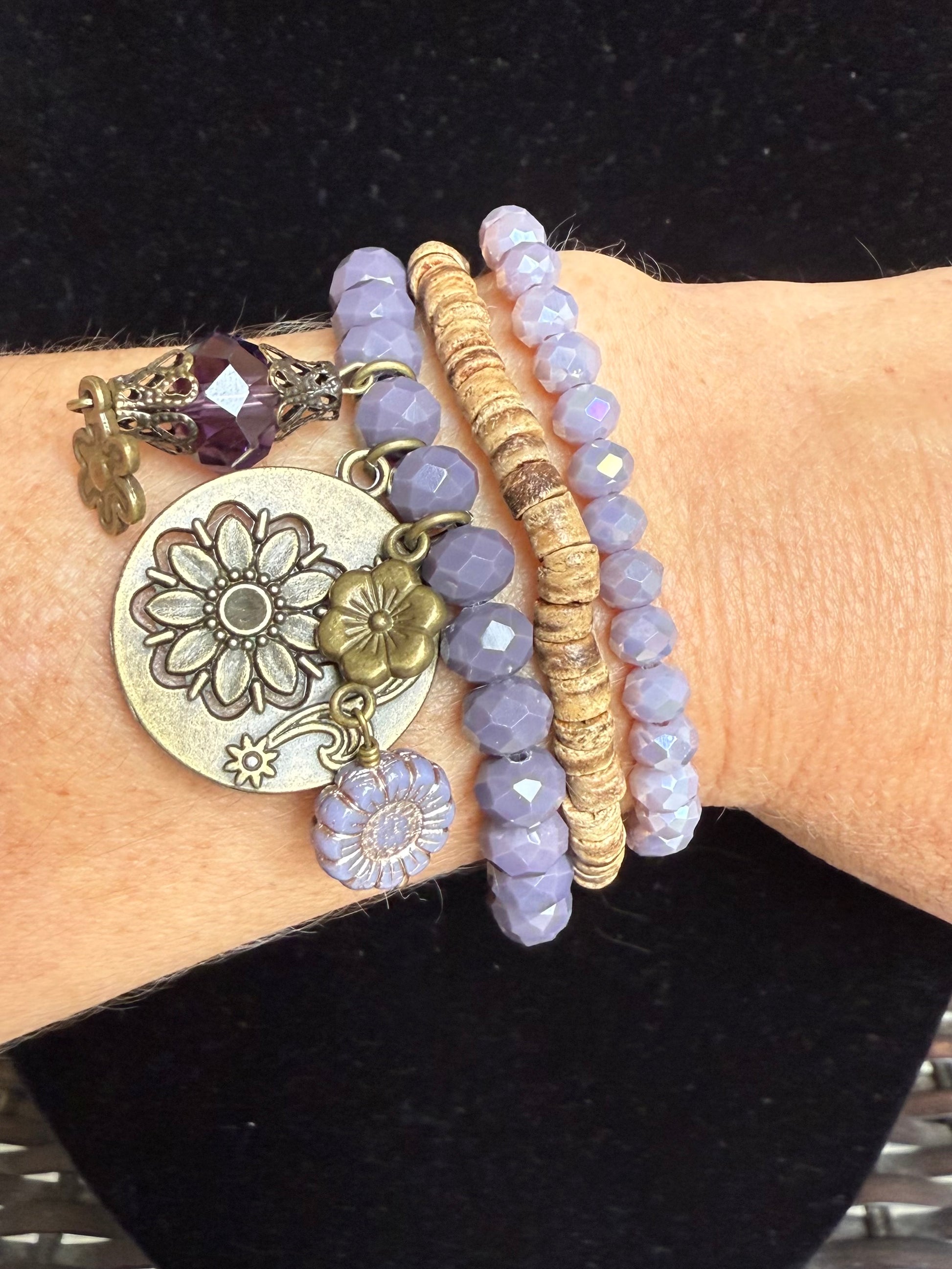 The Lavender Bloom Bracelet Set is a playful mix of soft, earthy vibes and floral fun. Showcasing sparkling lavender beads, cozy wood-like touches, and charming antique gold floral details, this stack shines whether layered or worn alone. Each bracelet sprinkles a bit of carefree boho flair with a dash of everyday glam. Made in the USA, this set blends bronze, glass, shell, and stone for a delightful pop of bronze and purple.