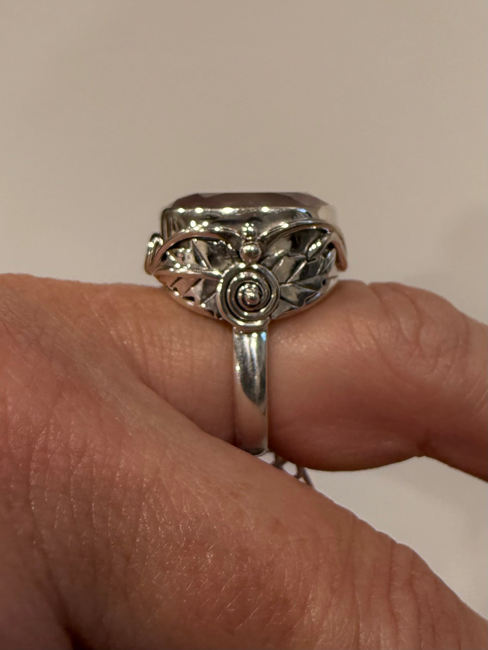 This stunning faceted Rose Quartz ring, embellished with detailed leaves and vines, captures the allure of a magical fairy tale. Made from sterling silver, it perfectly blends refined elegance with expert artistry. Explore more designs like this by searching ‘Enchantment’.