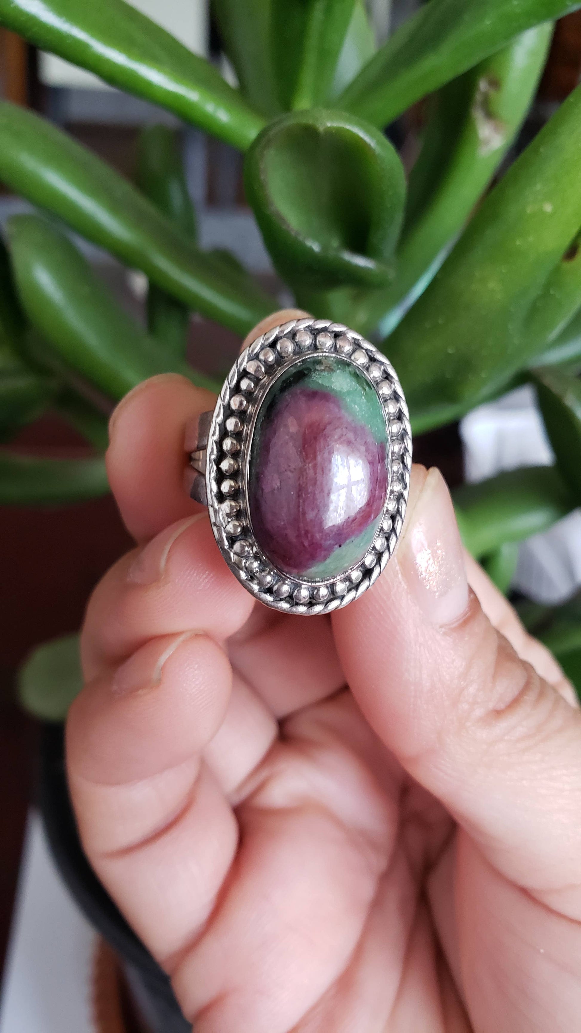 Discover the captivating beauty of this unique Ruby Zoisite gemstone, set in a timeless sterling silver ring. Known as "anyolite," this naturally occurring stone features a striking contrast of deep red ruby inclusions within a vibrant green zoisite matrix.