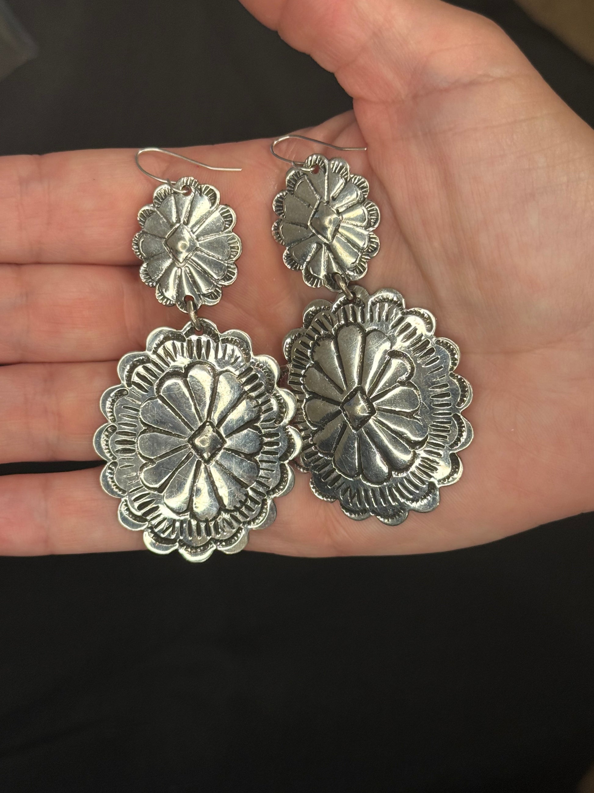 Embrace the charm with these silver double concha drop earrings, a perfect complement to western-inspired attire. Featuring an elegant scalloped floral pattern, this design showcases a double drop resembling the iconic southwestern buckle beloved by cowgirls. Finished in polished silver plating and handcrafted in India, these earrings measure approximately 1 1/2" by 3 1/2" and are crafted from silver-tone metal.