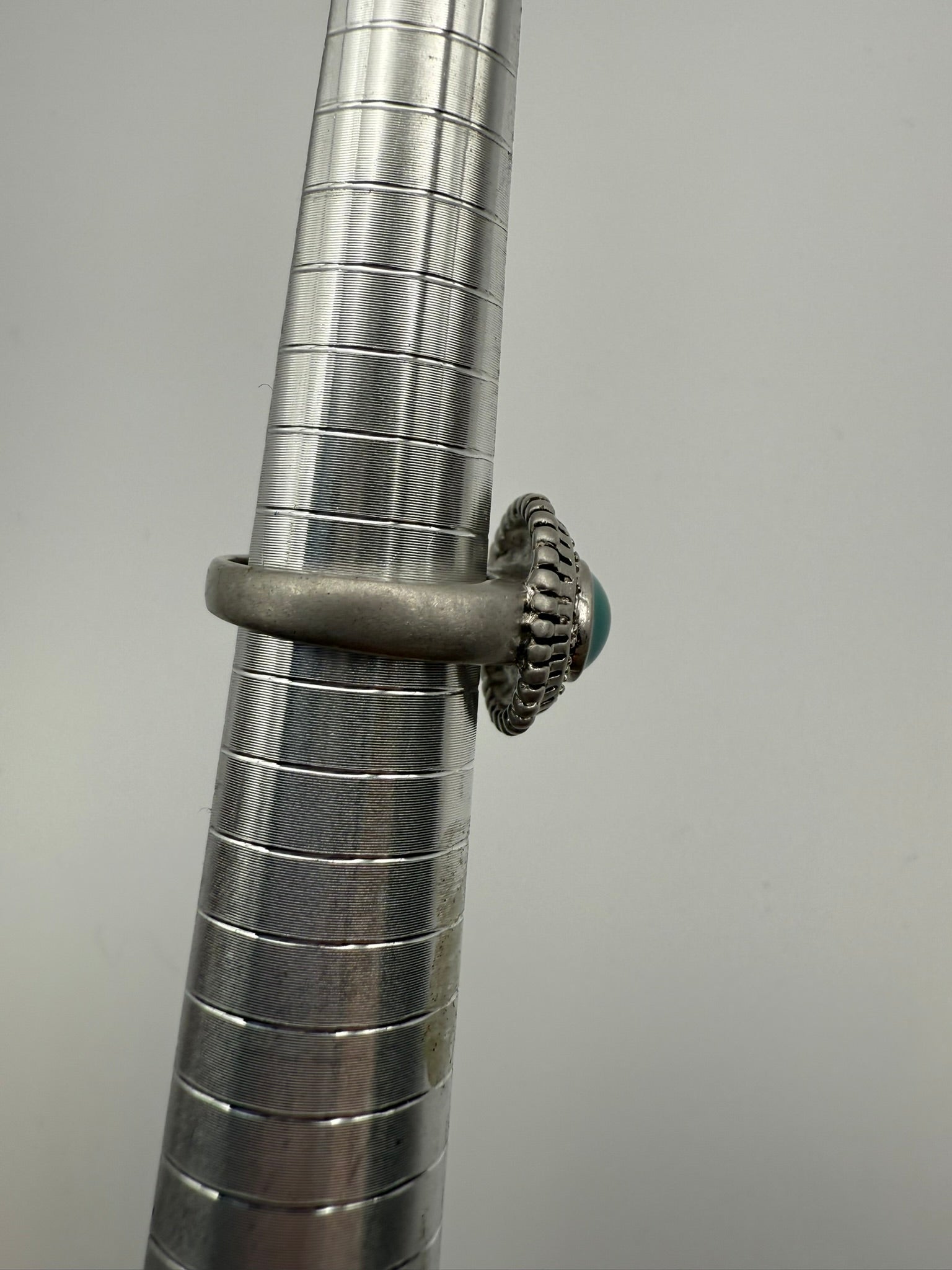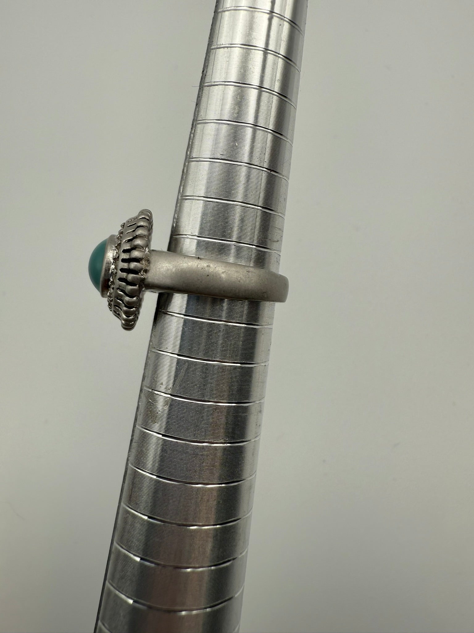 This vintage aqua halo cabochon ring features a smooth, glossy blue-green center stone framed by a sparkling ring of clear rhinestones, all set in a silver-tone bezel with subtle textured detailing. The soft cabochon finish gives the stone a calm, luminous glow, while the surrounding halo adds just the right touch of vintage glamour without feeling overdone. Elegant yet wearable, this ring is perfect for everyday styling or as a timeless accent piece for special occasions, offering classic vintage charm with an easy, polished feel.