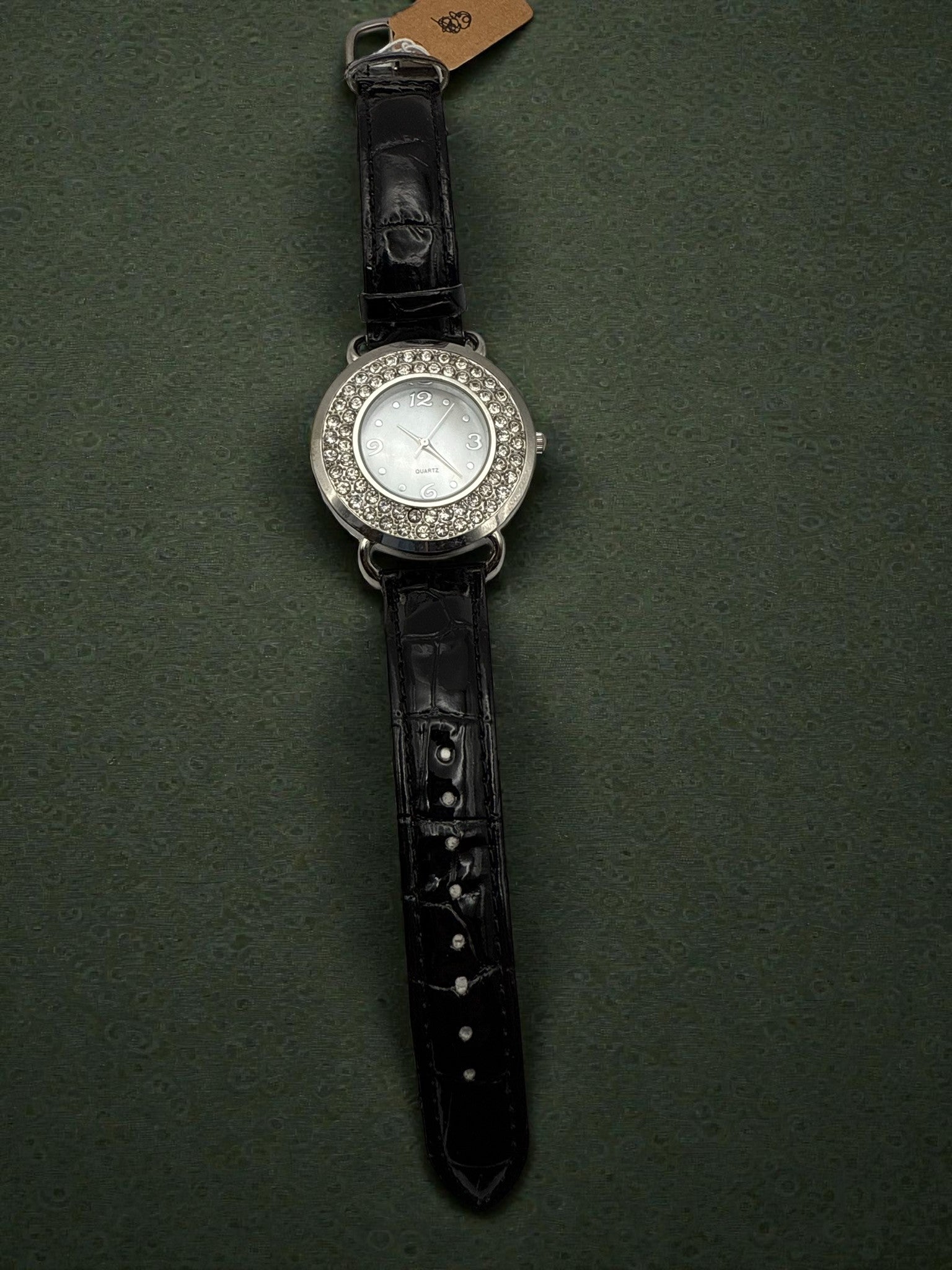 Vintage Black Patent Leather Bejeweled Quartz Watch 6.5-8" - *Needs Battery*