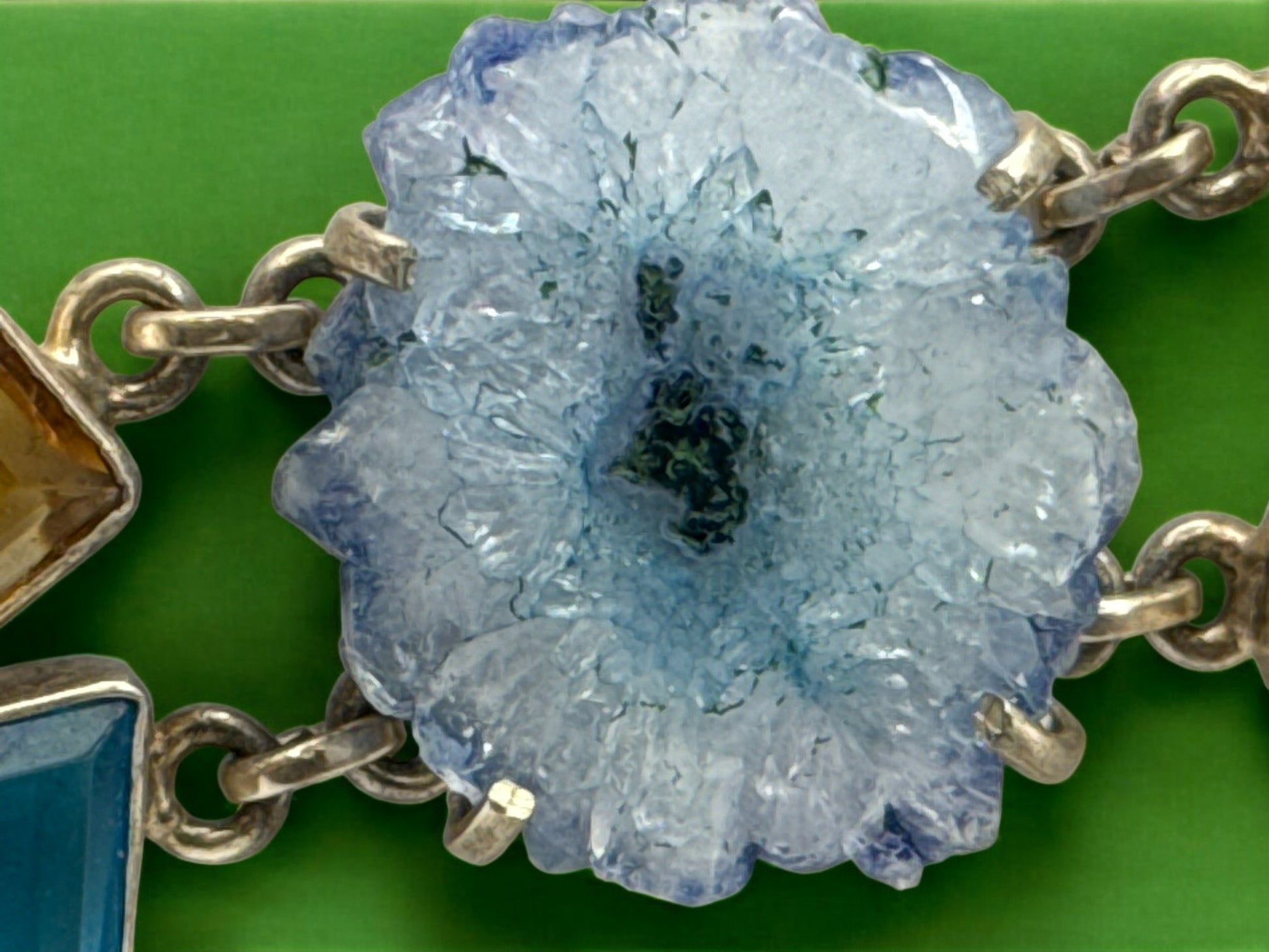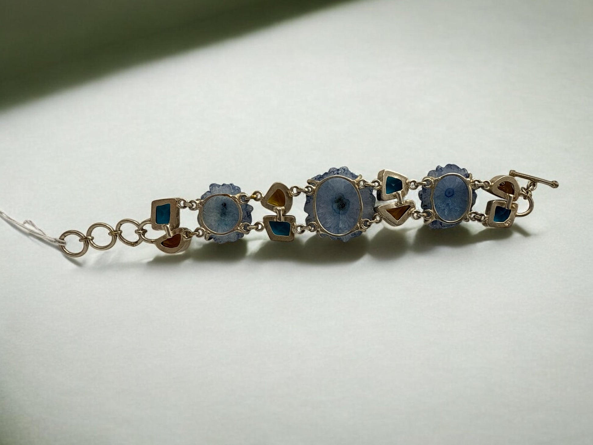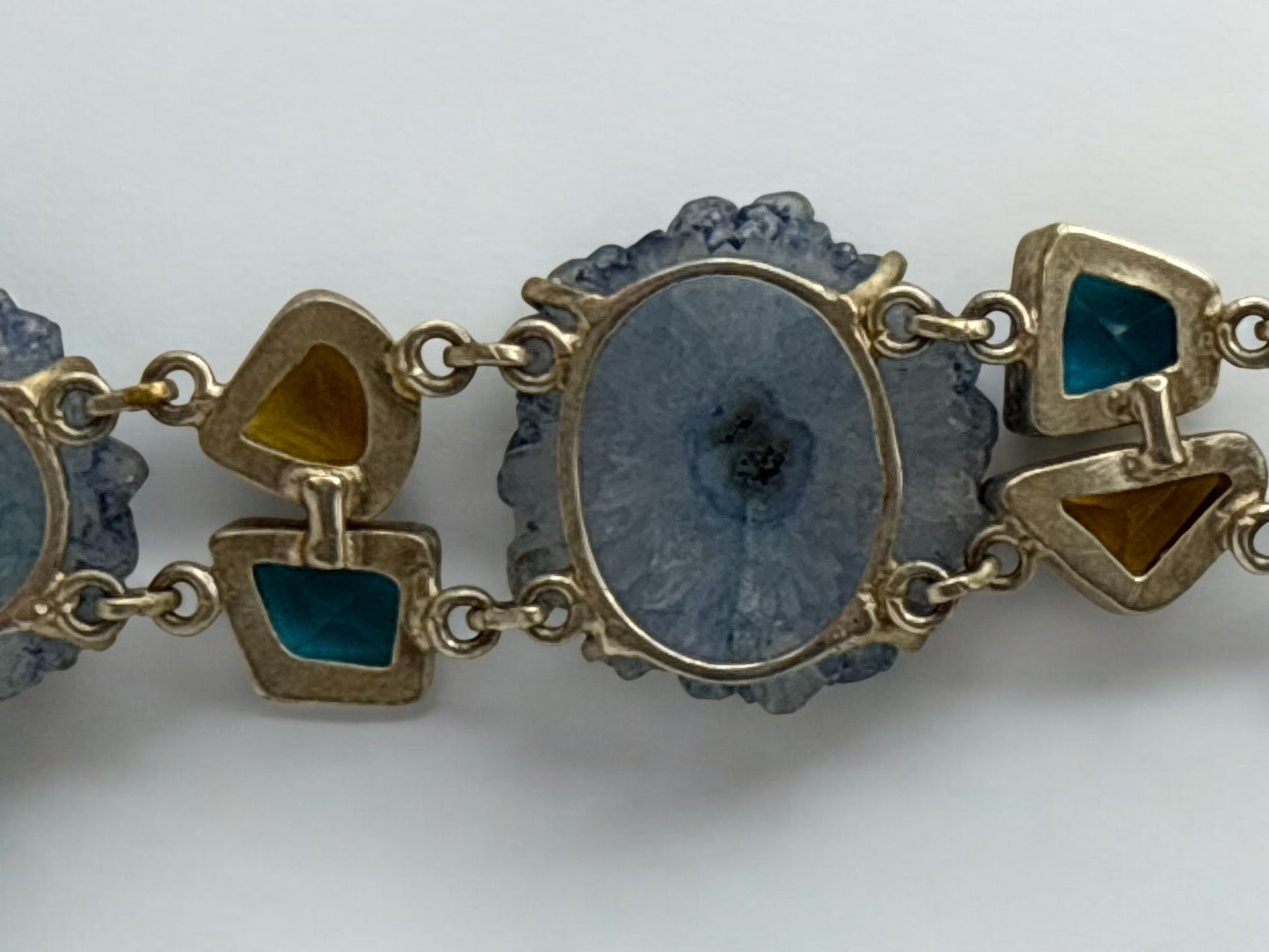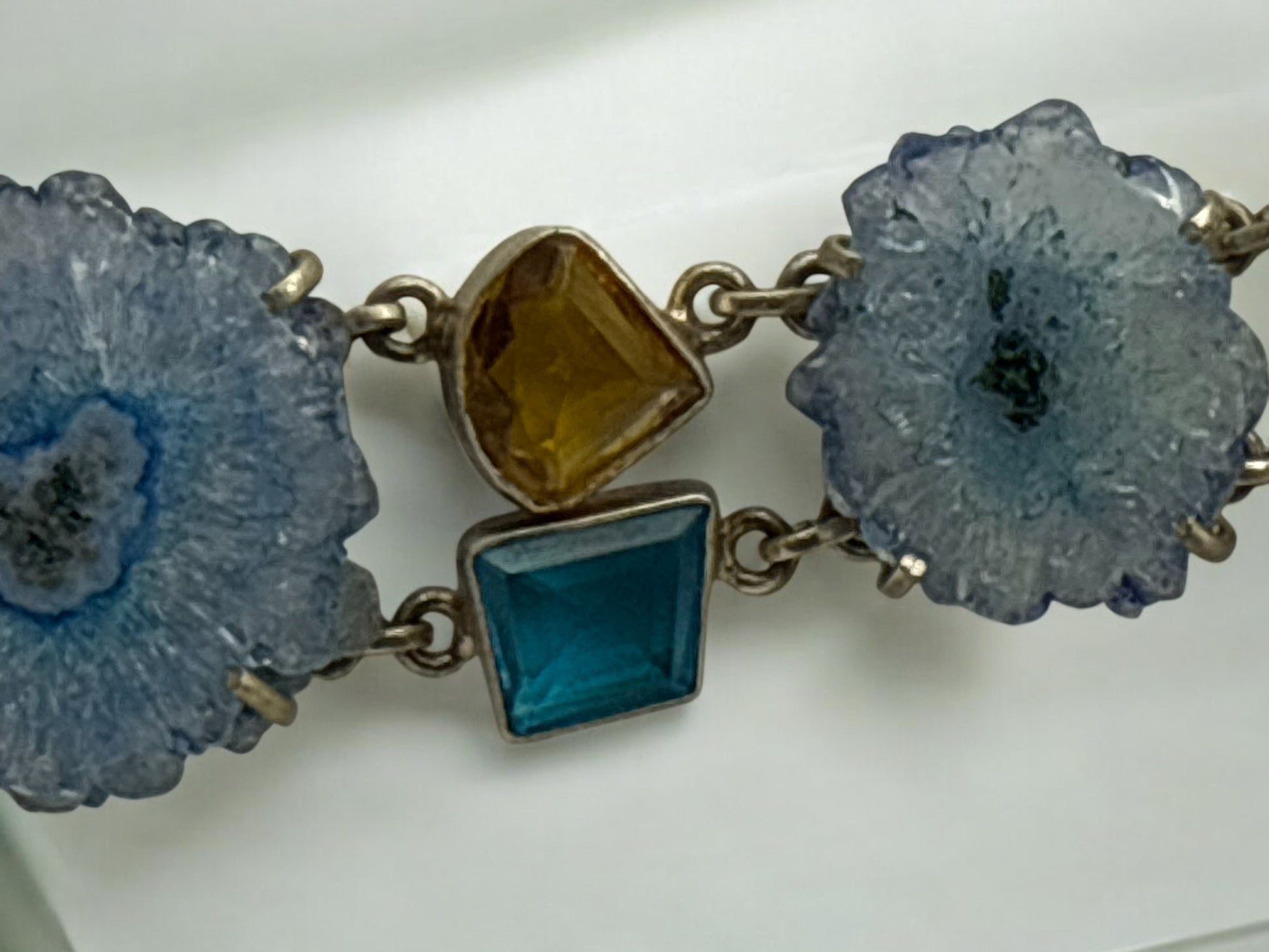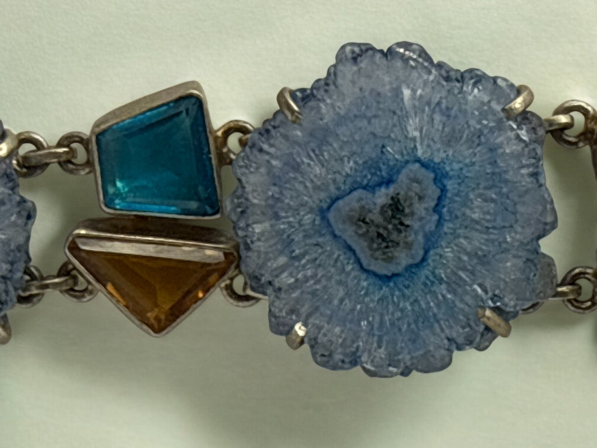 Striking and artfully designed, this Blue Solar Quartz Gemstone Bracelet features natural solar quartz slices with beautiful crystalline centers, accented by vibrant blue and warm amber-toned gemstone details. The organic textures and geometric stone shapes create a bold yet elegant contrast, giving the bracelet a modern, artisan feel. Set in silver-tone metal and finished with a secure toggle-style closure and extender chain, this statement bracelet is perfect for elevating both casual and dressy looks with unique, one-of-a-kind character. | Details: Statement bracelet design; Natural blue solar quartz slices; Mixed blue and amber-toned gemstone accents; Silver-tone metal setting; Toggle closure with extender chain; Medium weight with dimensional texture; Each piece is unique with natural variations; Nickel & lead free