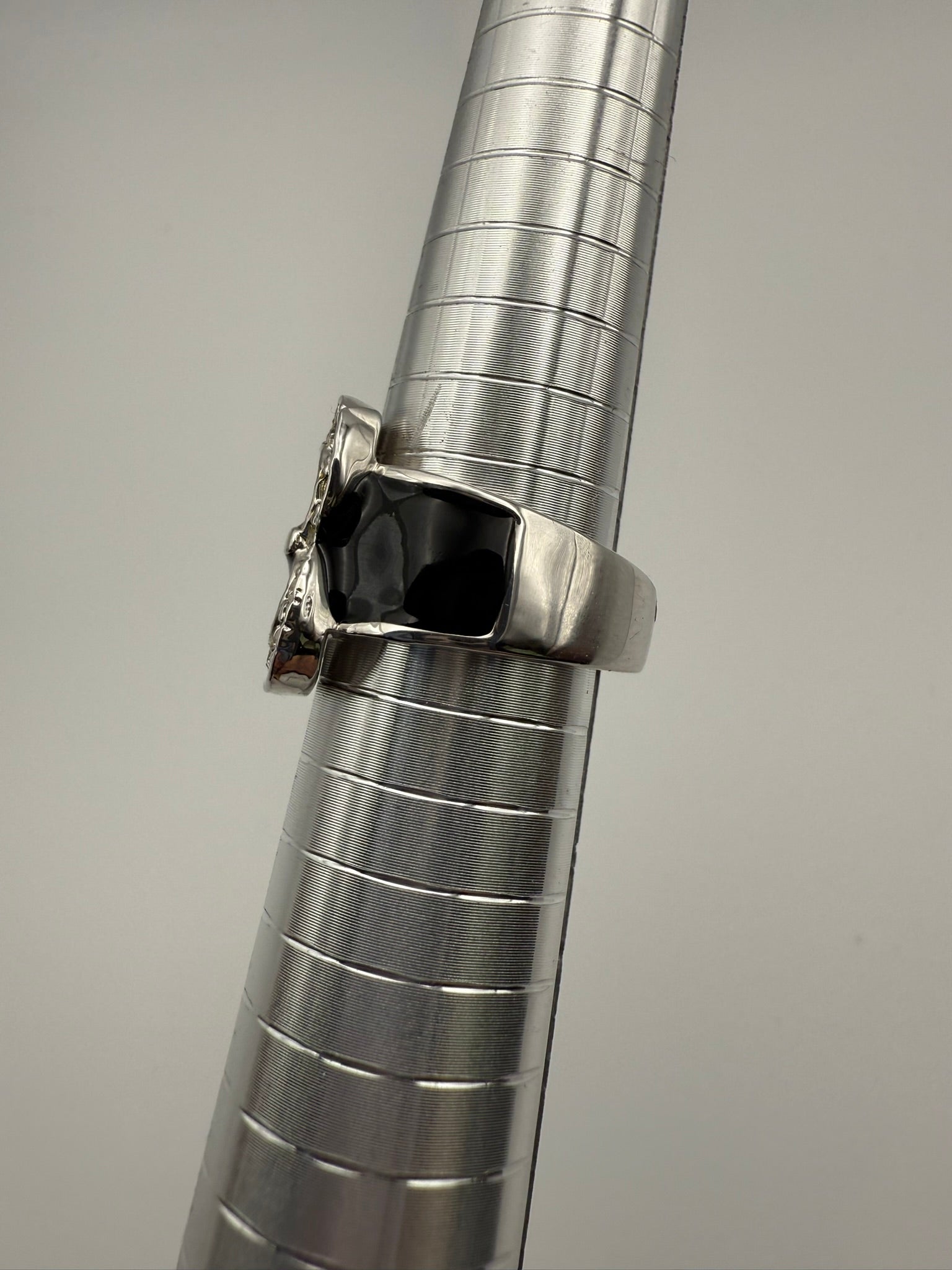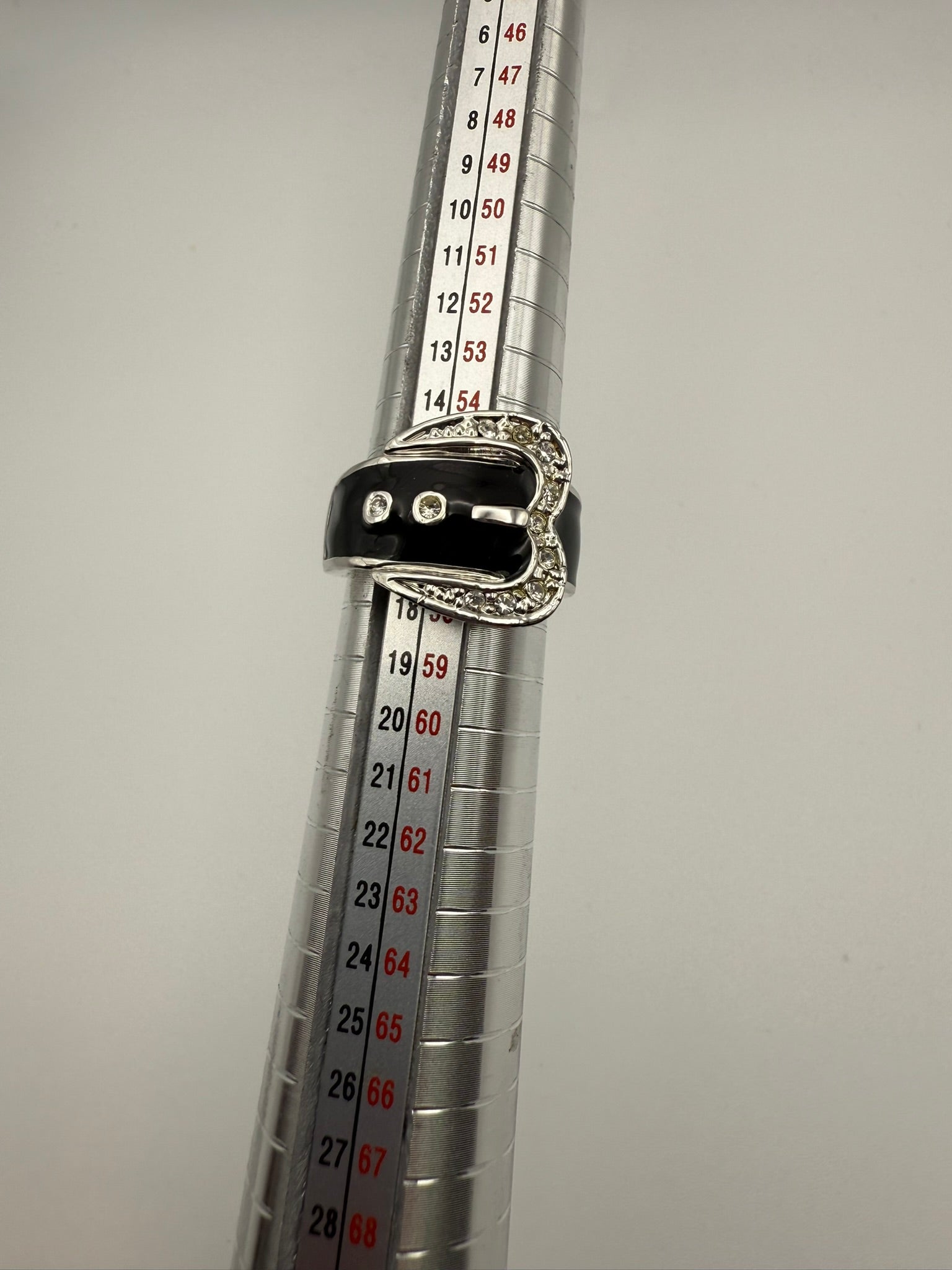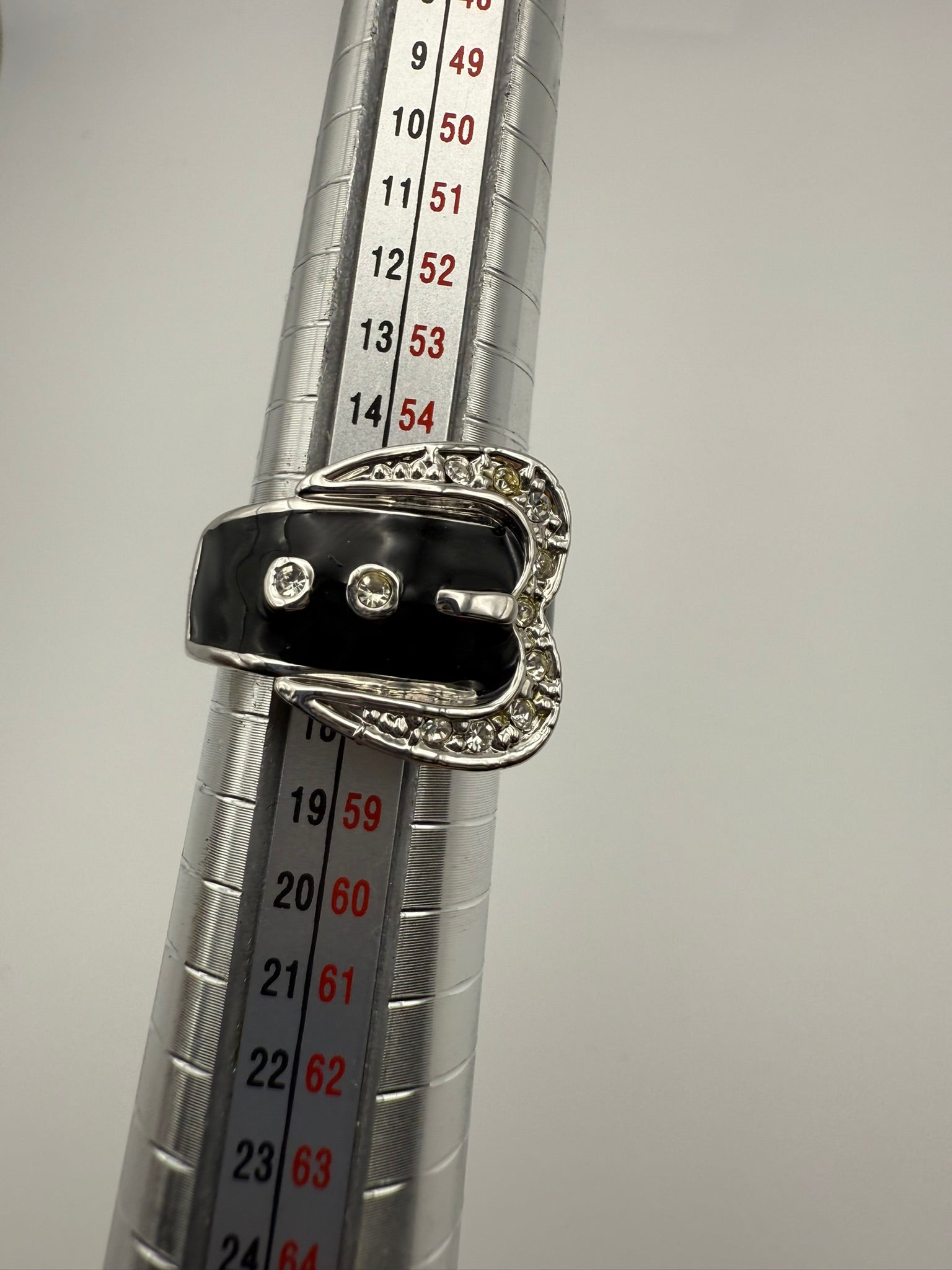 This signed Camille Lucie buckle ring features glossy black enamel framed by a silver-tone buckle design accented with clear crystals. The sculptural buckle detail adds character without overwhelming the hand, while the smooth enamel band keeps the look sleek and wearable. A signature Camille Lucie piece with subtle edge, this ring balances bold design with everyday sophistication.