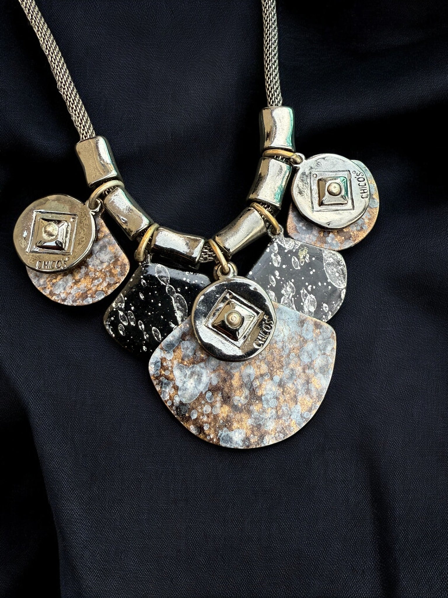 This necklace delivers modern edge with an artisanal feel. Featuring a sleek silver-toned cord chain, the design is anchored by layered geometric pendants with textured, stone-inspired detailing. The mix of soft metallic shine and organic patterning gives this piece a refined industrial vibe—bold, but effortlessly wearable.