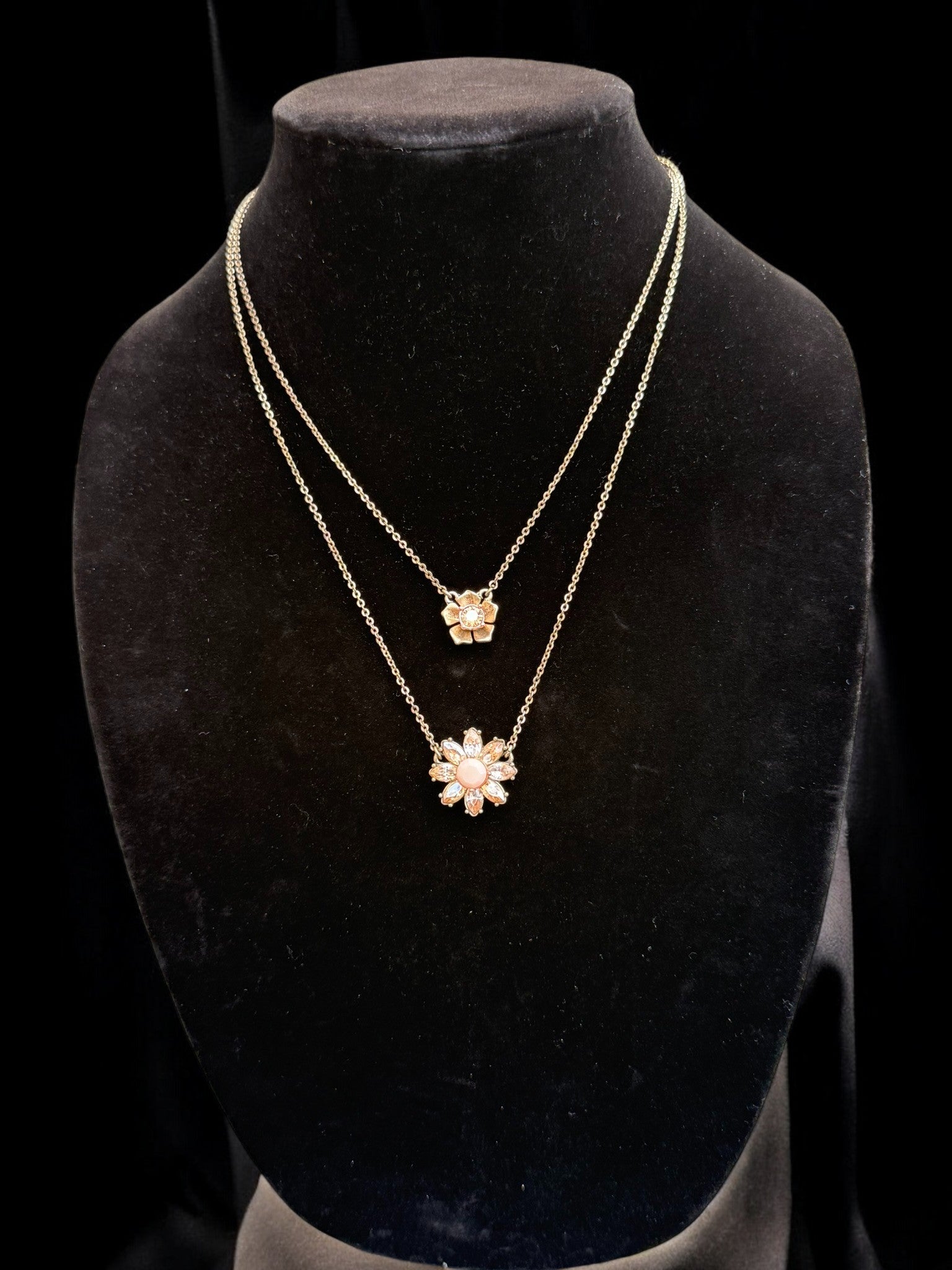 The Golden Bloom Layered Necklace is a delicate celebration of soft femininity and effortless elegance. Featuring two perfectly balanced gold-toned chains, this layered piece showcases a petite floral charm above a radiant sunburst-inspired bloom accented with a blush-toned center stone. Lightweight and refined, it’s designed to sit beautifully at the collarbone, adding just the right touch of sparkle without overpowering your look. Perfect worn alone or layered with other favorites, this necklace brings a subtle glow to everyday outfits while remaining polished enough for special moments.