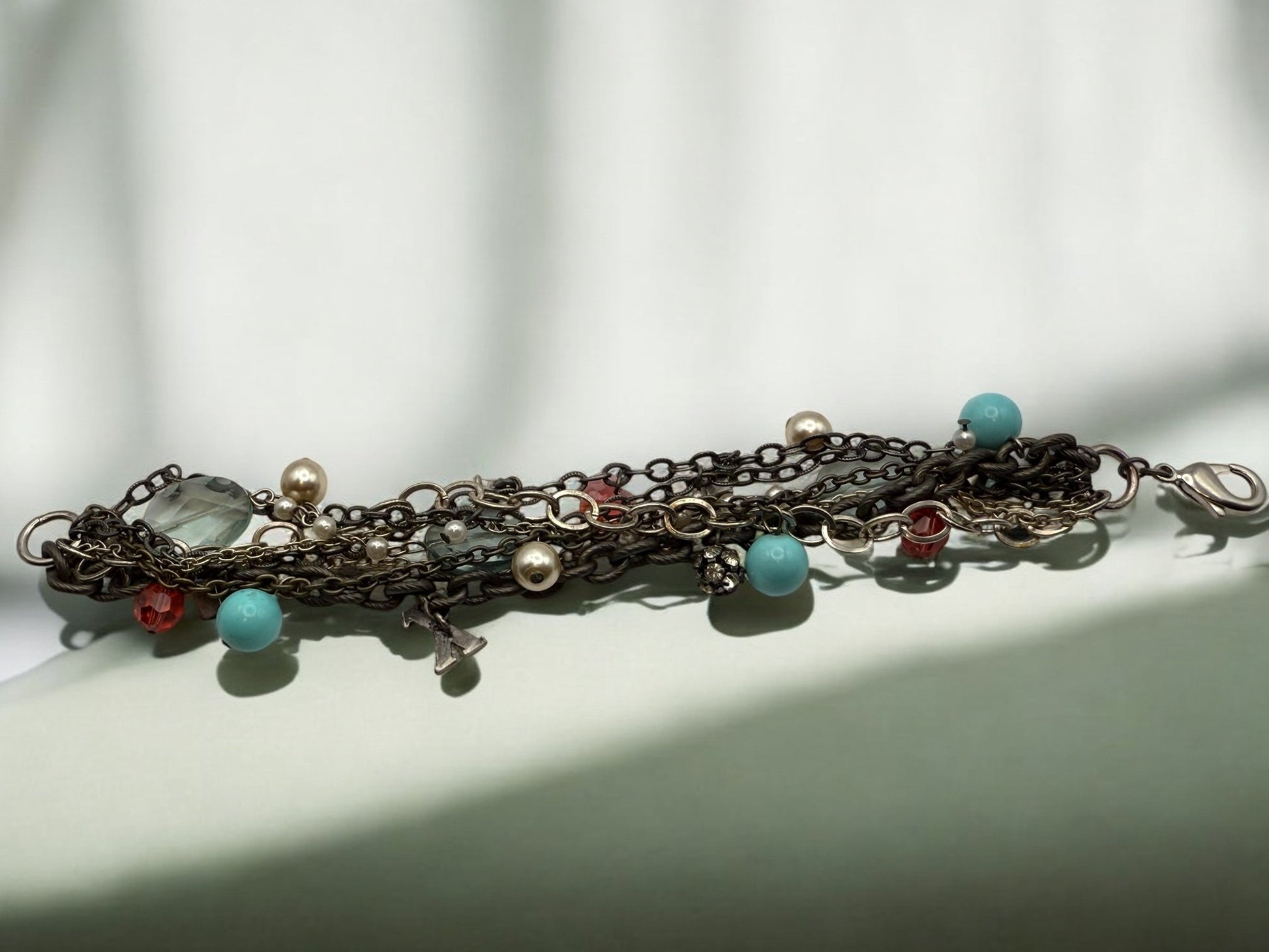 This effortlessly chic bracelet features a layered mix of silver- and gold-tone chains accented with soft aqua beads, warm amber crystals, and subtle pearl details. Designed with texture and movement in mind, the combination of twisted links and delicate chains creates a relaxed, stacked look in a single piece. Balanced between boho and refined, this bracelet adds an easy, collected elegance to everyday outfits while pairing beautifully with both casual and dressed-up styles.