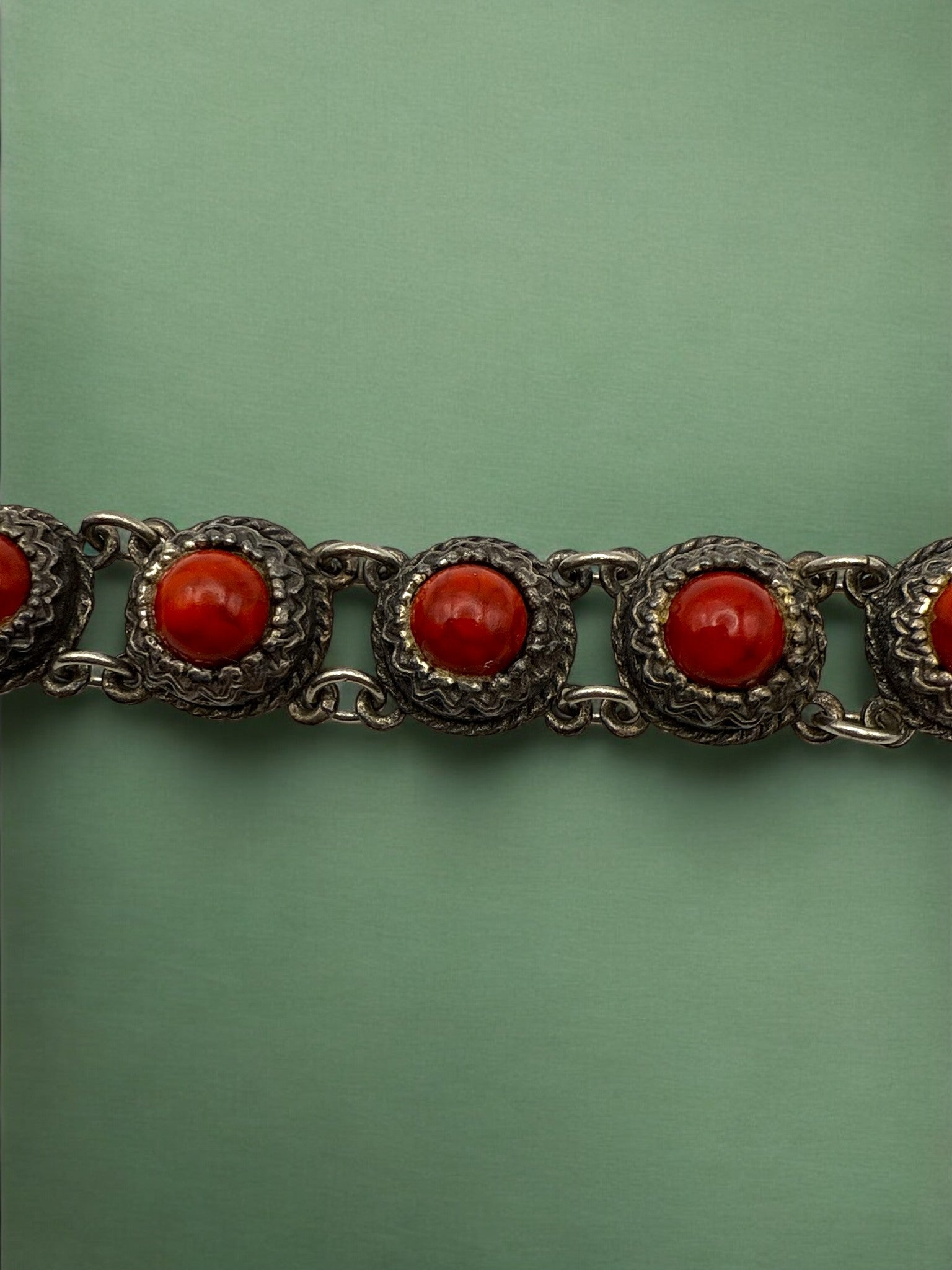 This striking bracelet features a series of rich red cabochon stones set in ornate antique silver-tone bezels, each framed with intricate vintage-inspired detailing. The repeating round links create a bold yet balanced silhouette, offering warmth, depth, and timeless character. Designed to make a statement while remaining effortlessly wearable, this bracelet adds a touch of old-world elegance and confident color to both everyday and elevated looks.