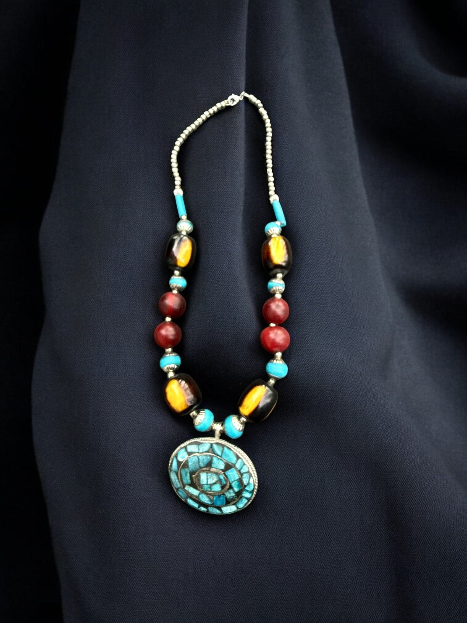 The Desert Mosaic Statement Necklace is a bold, artful piece inspired by earthy textures and vibrant Southwestern color palettes. Featuring a striking oval mosaic pendant framed in silver-tone metal, this necklace is accented with rich turquoise beads, warm amber-toned barrel beads, and deep red round beads for a layered, collected look. Each element is thoughtfully spaced to create balance, movement, and visual interest, making it a true focal piece. Perfect for elevating a simple outfit or adding a touch of boho soul to your everyday style, this necklace feels both grounded and expressive—an effortless statement with timeless character.