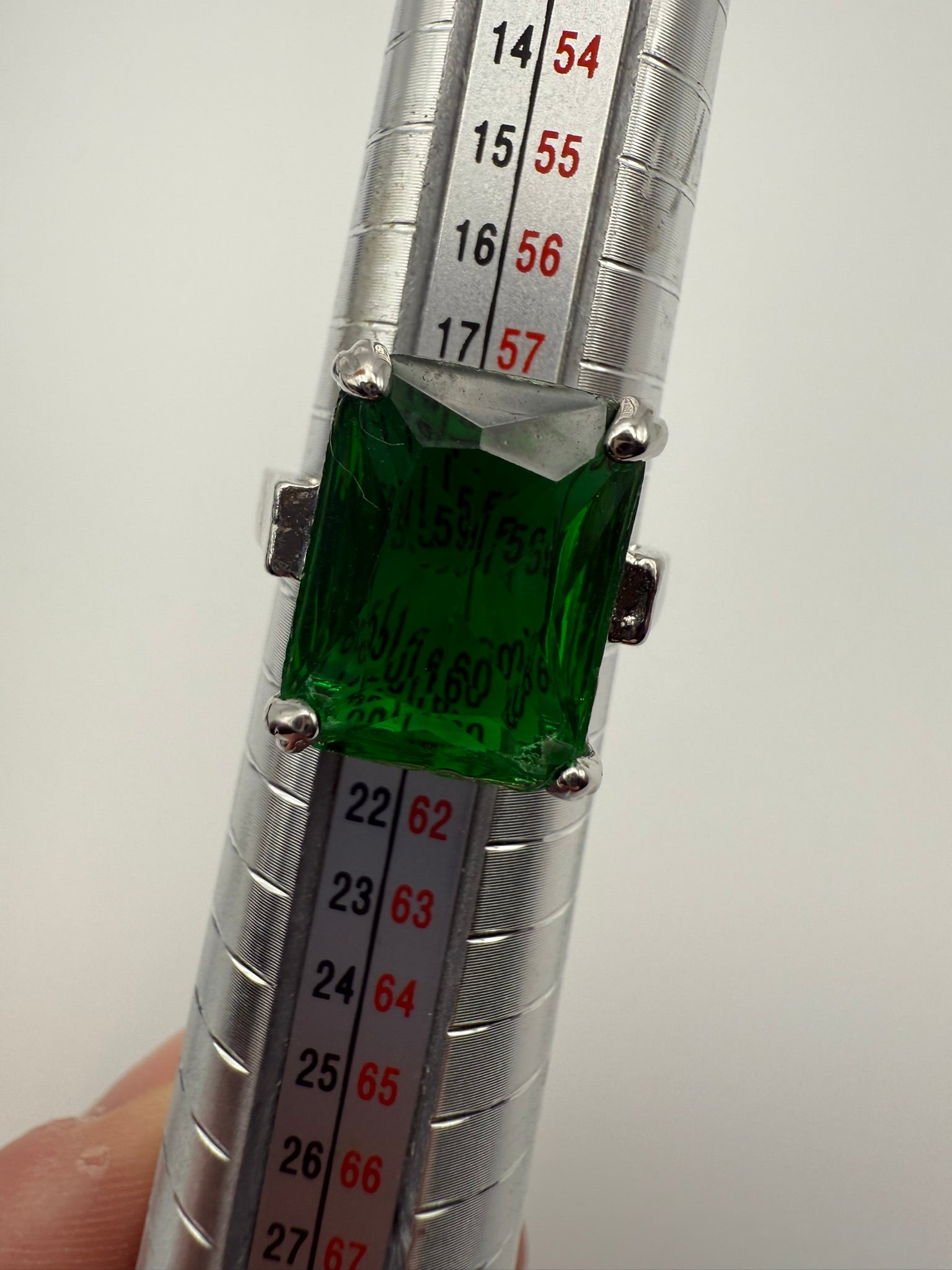 This striking ring features a bold rectangular emerald-green stone set in a sleek silver-tone band with a clean, architectural silhouette. The rich green hue catches the light beautifully, giving the piece a confident, luxe presence without feeling overdone. Equal parts classic and modern, this ring is perfect worn solo as a statement or layered with softer bands for contrast. A timeless piece designed for everyday glamour with just the right amount of drama.