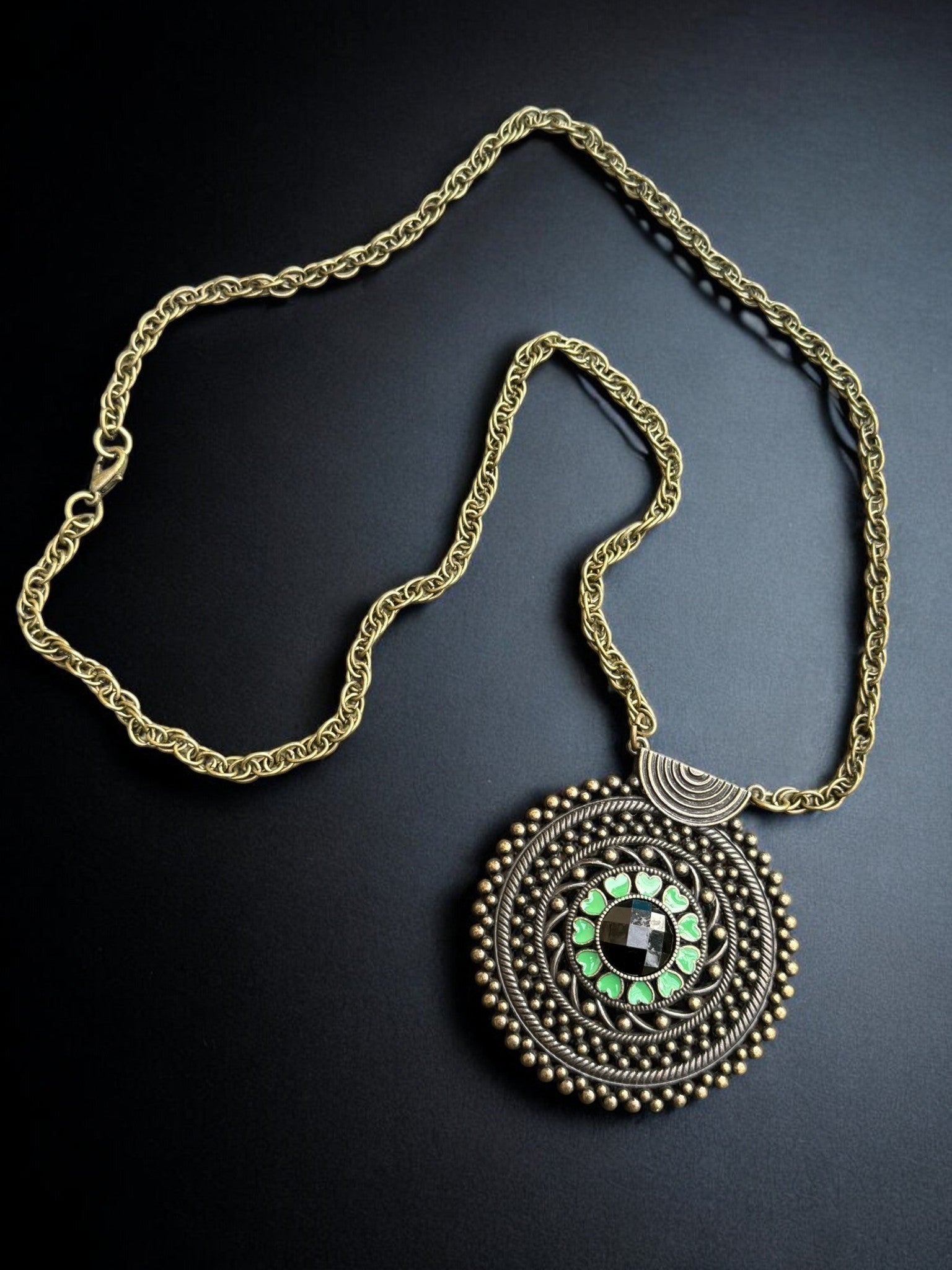 The Emerald Orbit Medallion Necklace is a striking blend of vintage elegance and modern boho charm. Designed with a rich gold-toned rope chain, this statement piece features an intricately detailed circular medallion framed in layered metallic textures and dotted accents. At the center, vibrant emerald-green enamel hearts surround a faceted mirror-style stone, catching the light with every movement. Bold yet refined, this necklace is perfect for elevating simple tops, flowing dresses, or layered looks—an effortless statement that feels both timeless and unique.