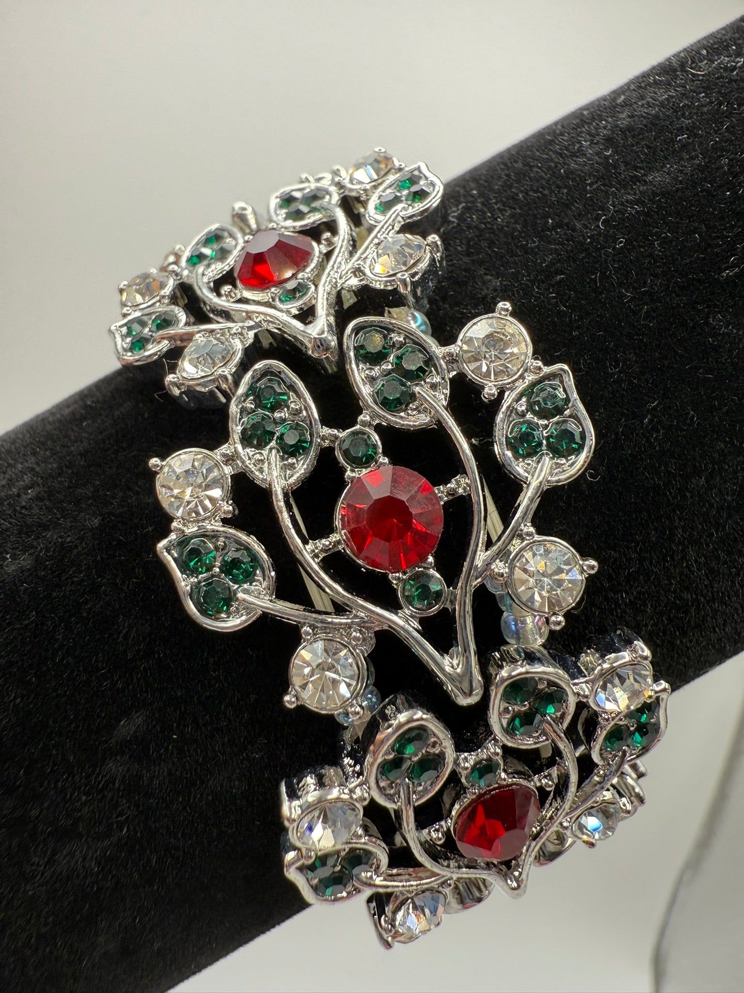 Dramatic and beautifully detailed, the Emerald Ruby Enchanté Bracelet features a flowing silver-tone design adorned with rich ruby-red stones, deep emerald accents, and sparkling crystal details. The layered, vine-inspired silhouette creates elegant movement and a romantic, old-world feel with a modern edge. Bold yet refined, this bracelet captures light from every angle, making it perfect for evening looks, special occasions, or elevating a simple outfit with vintage glamour. A true statement piece that feels timeless, luxurious, and unforgettable. | Details: Statement bracelet design; Silver-tone metal setting; Ruby-red, emerald-green, and clear crystal accents; Ornate flowing vine motif; Secure clasp closure; Medium-to-heavy weight with elegant structure; Each piece may vary slightly in stone placement; Nickel & lead free