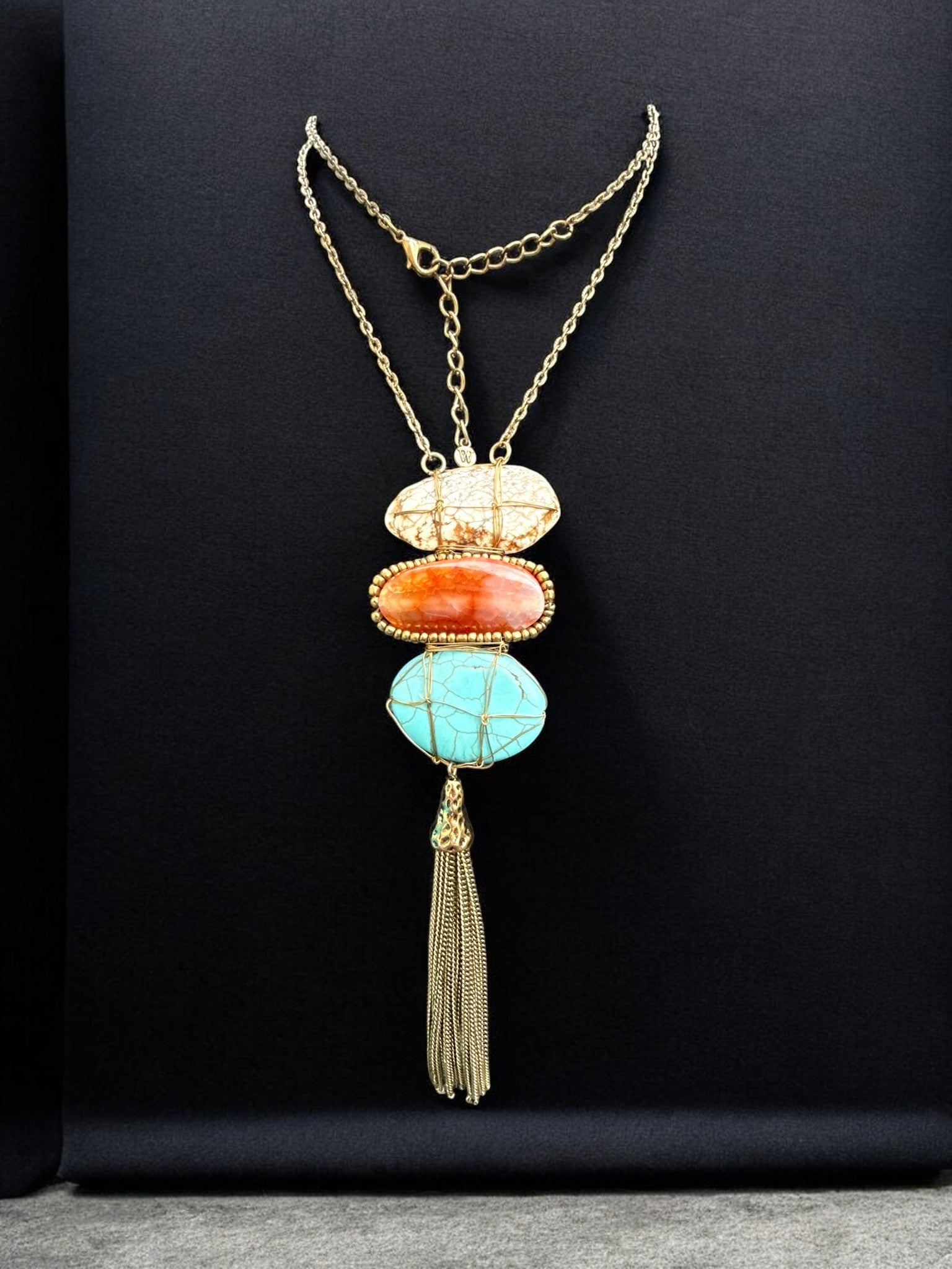 The Golden Canyon Tassel Necklace is a bold, earthy statement piece that blends rich color with effortless boho glamour. Featuring a stacked trio of marbled stones in warm ivory, sunset amber, and vibrant turquoise, each stone is delicately wrapped in gold-toned wire for an artisanal, one-of-a-kind feel. A cascading gold tassel adds movement and drama, creating a striking vertical silhouette that elongates the neckline. Finished on a coordinating gold chain with adjustable length, this necklace is perfect for adding warmth, texture, and Southwestern-inspired elegance to everything from denim and tees to flowing dresses.