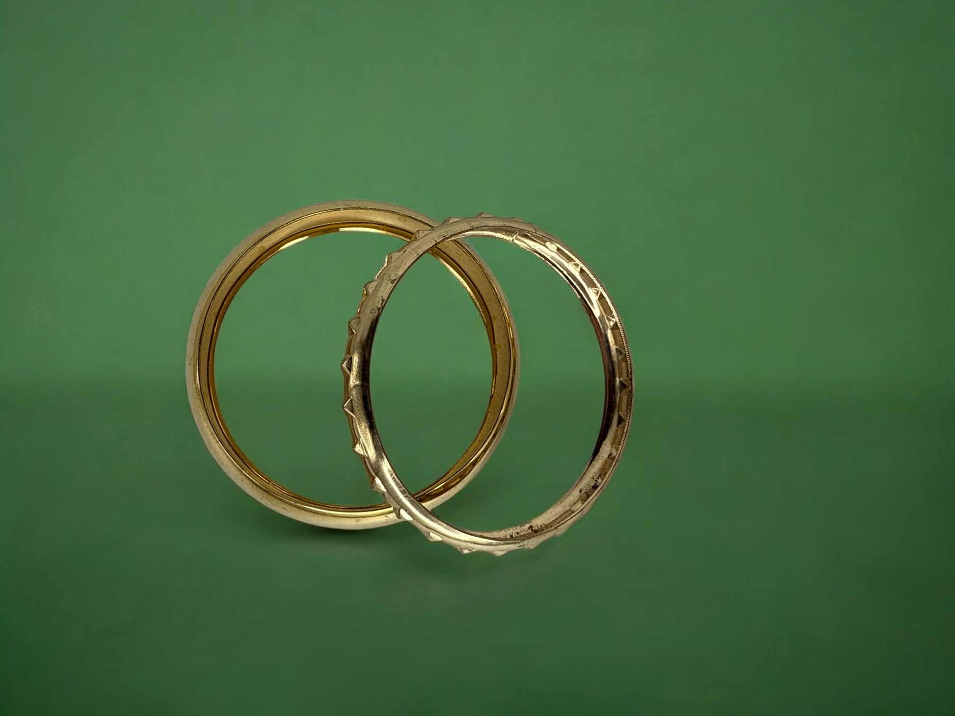 This chic two-piece bangle set features a mix of smooth polished gold-tone and textured geometric detailing for a perfectly balanced, everyday-luxe look. Designed to be worn stacked or styled solo, the contrasting finishes add subtle dimension and timeless appeal. Effortlessly versatile, this bangle set elevates everything from casual denim to dressed-up evenings with understated sophistication. | Details: Set of two coordinating bangles; Gold-tone metal finish; One smooth polished bangle and one textured geometric bangle; Slip-on style; Lightweight with a comfortable fit; Stackable design for versatile styling; Each piece may show light vintage wear; Nickel & lead free