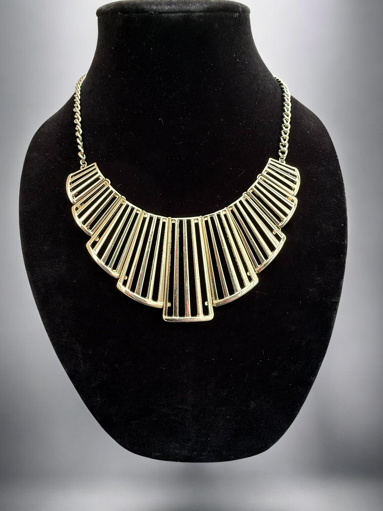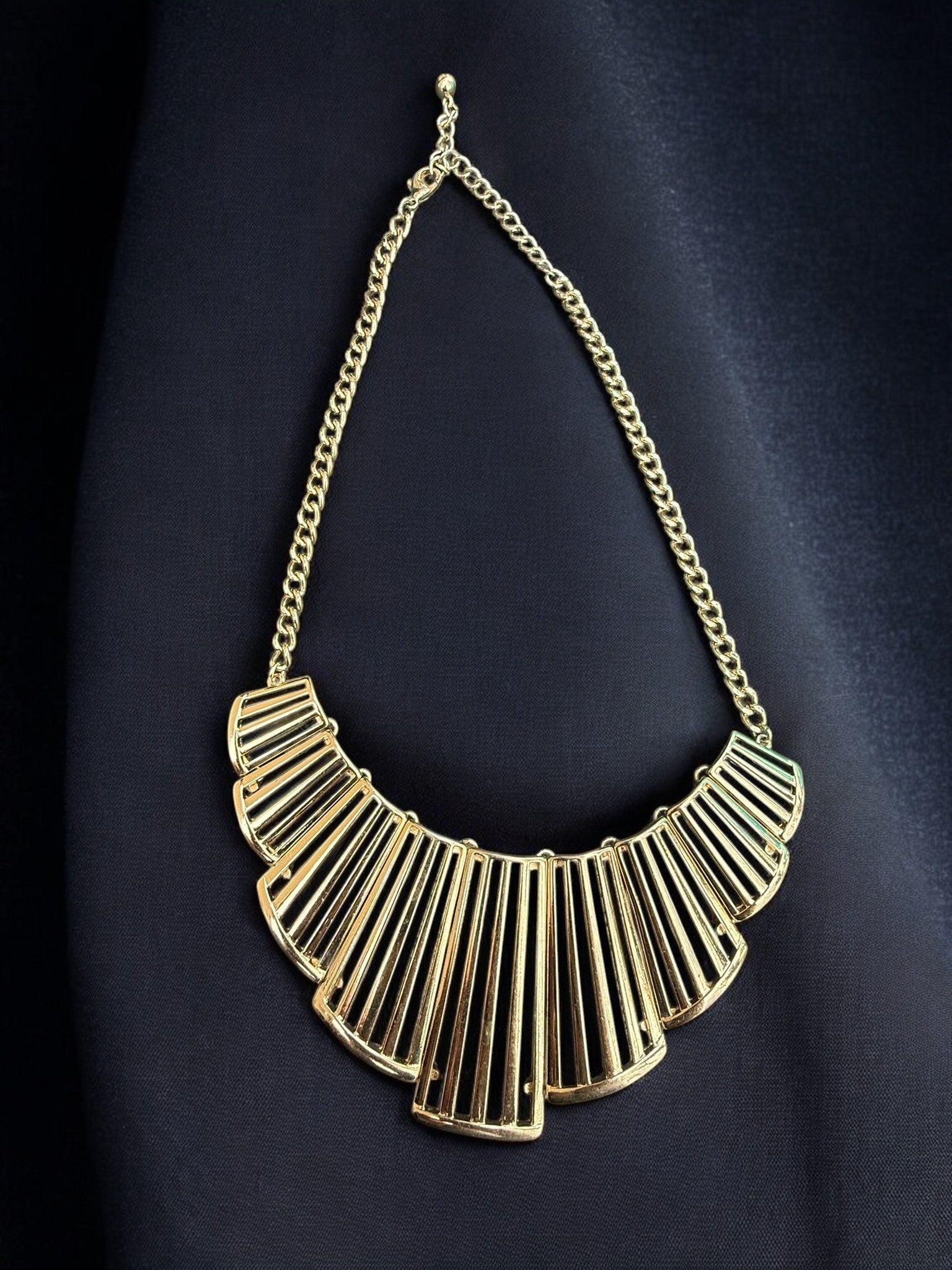 The Golden Sunburst Statement Necklace is a bold yet refined piece designed to instantly elevate any look. Featuring a fan-shaped arrangement of sleek gold-tone bars that radiate outward in a striking geometric pattern, this necklace creates the perfect balance between modern edge and timeless elegance. The structured pendant is anchored by a classic gold chain, allowing it to sit beautifully along the collarbone for maximum impact. Whether paired with a simple blouse or a dramatic evening outfit, this necklace delivers confident style with a polished, statement-making finish that feels both contemporary and chic.