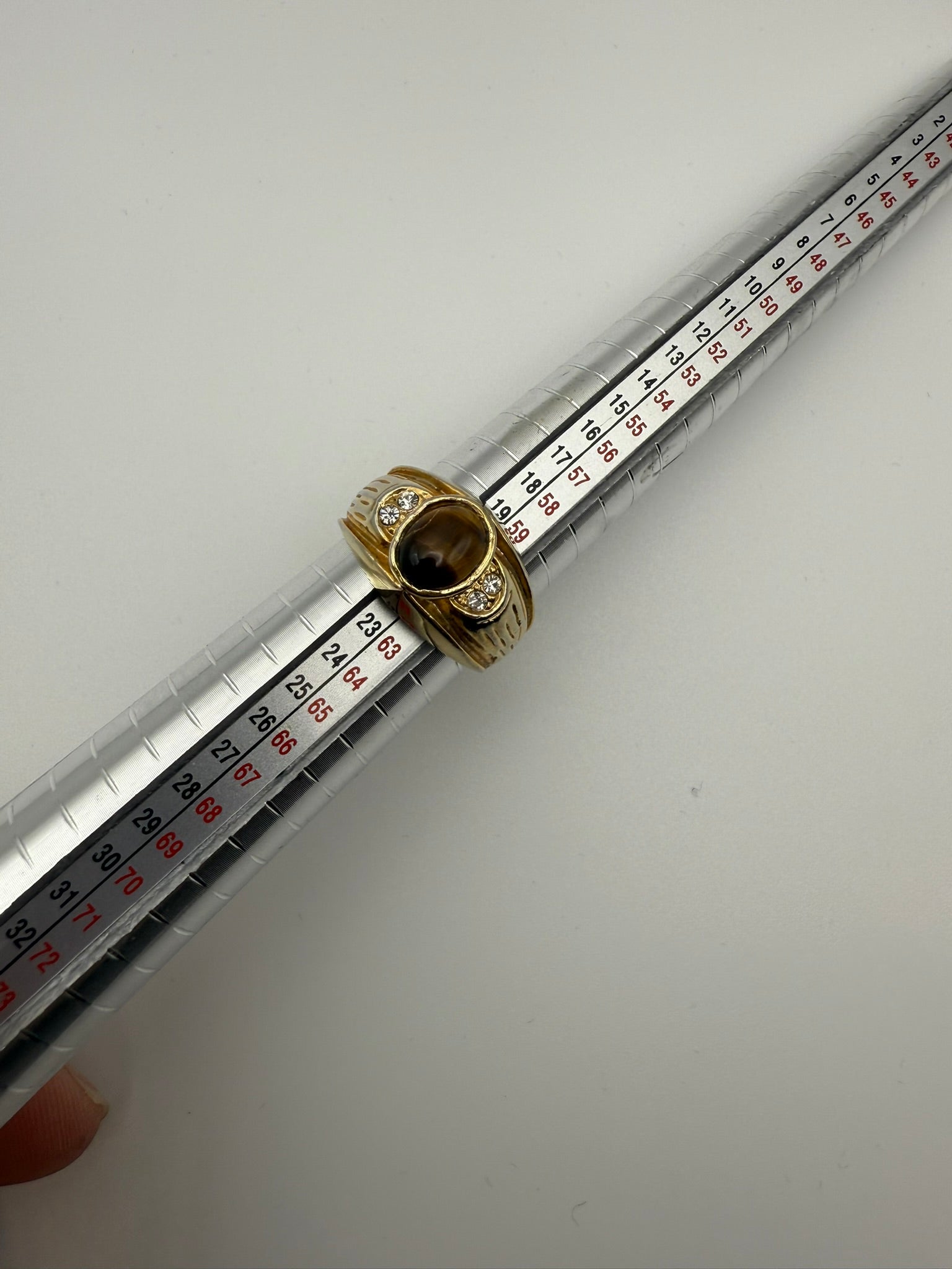 This bold statement ring features a rich tiger’s eye cabochon set in a warm gold-tone band, accented with sparkling clear crystals for added dimension and contrast. The natural stone displays beautiful depth and movement, while the textured band and sculpted details give the ring a strong, vintage presence. Confident and eye-catching, this ring is designed to stand alone, bringing grounded energy, warmth, and timeless character to any look.