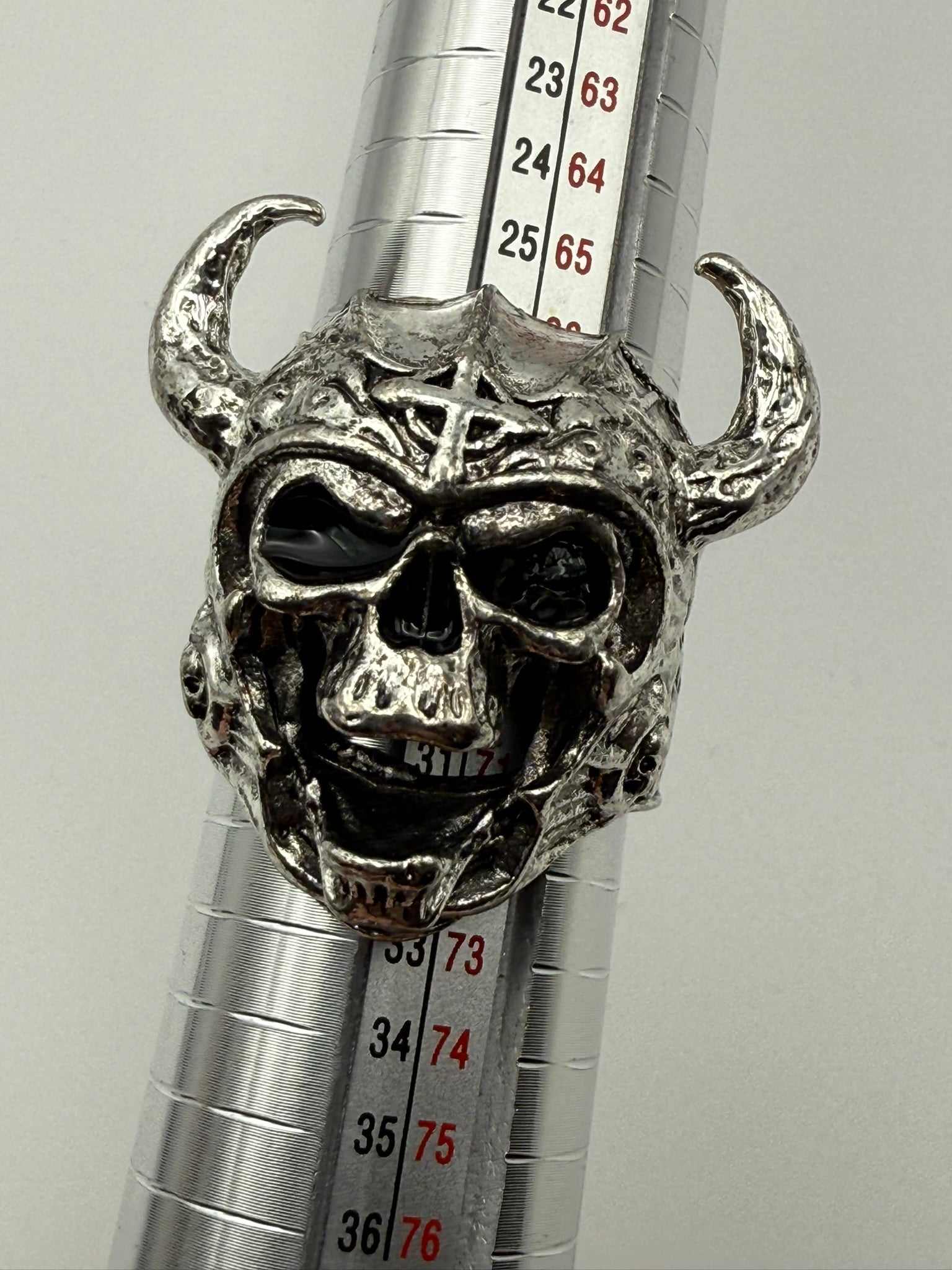 The Infernal Horned Skull Ring is a striking statement piece crafted with dramatic detail and raw edge. Featuring a sculpted skull crowned with curved horns and etched symbols across the brow, this ring channels dark mysticism and unapologetic strength. The textured silver-tone finish enhances every contour, giving it a worn, battle-forged look that feels powerful and intentional. Designed for those who embrace bold style and fearless self-expression, this ring stands alone as a commanding centerpiece that demands attention.