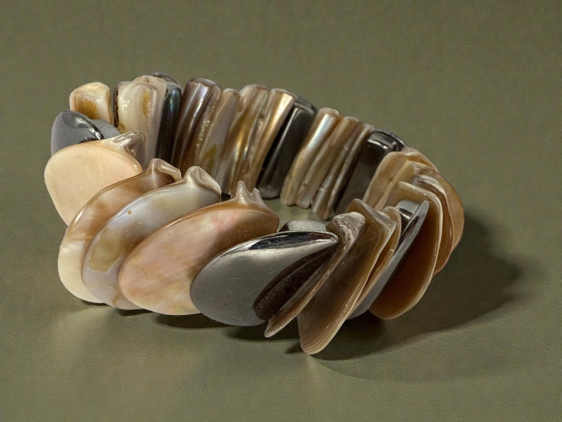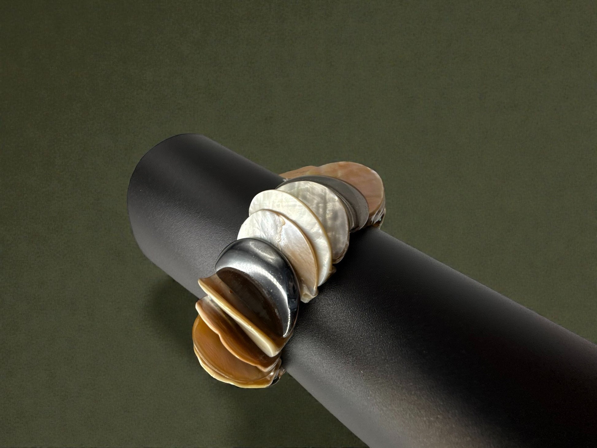 Inspired by the natural beauty of the sea, the Iridescent Tide Bracelet features layered shell-like discs in luminous pearlescent tones, warm amber hues, and soft metallic accents. Each organic shape catches the light differently, creating a fluid, effortless look that feels both relaxed and refined. Designed with a comfortable stretch fit, this statement bracelet blends coastal elegance with everyday luxury—perfect for stacking or wearing solo as a subtle standout. Earthy, radiant, and endlessly wearable. | Details: Statement stretch bracelet; Layered shell-inspired discs; Iridescent pearl, amber, and metallic tones; Comfortable elastic fit; Lightweight with natural movement; Each piece may vary slightly in color and shape