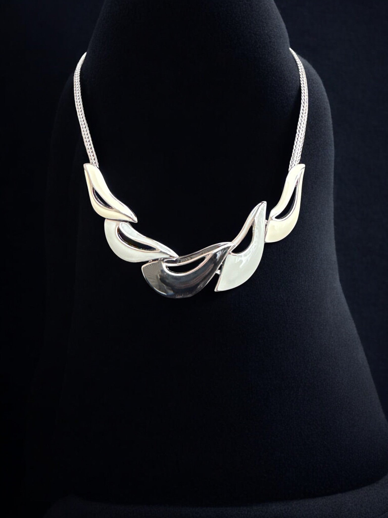 The Liquid Luxe Sculpted Necklace features a series of fluid, high-shine silver-tone forms that flow together like molten metal, creating a striking yet effortlessly wearable statement. The sculptural centerpiece is balanced by a sleek woven chain, giving the necklace a modern, architectural feel with a soft, organic edge. Designed to sit gracefully along the neckline, this piece adds instant sophistication to both casual and elevated looks—perfect with a crisp white tee, a tailored blazer, or an evening silhouette. Bold without being overwhelming, it embodies Subtle Boujee’s signature blend of contemporary design and everyday luxury.