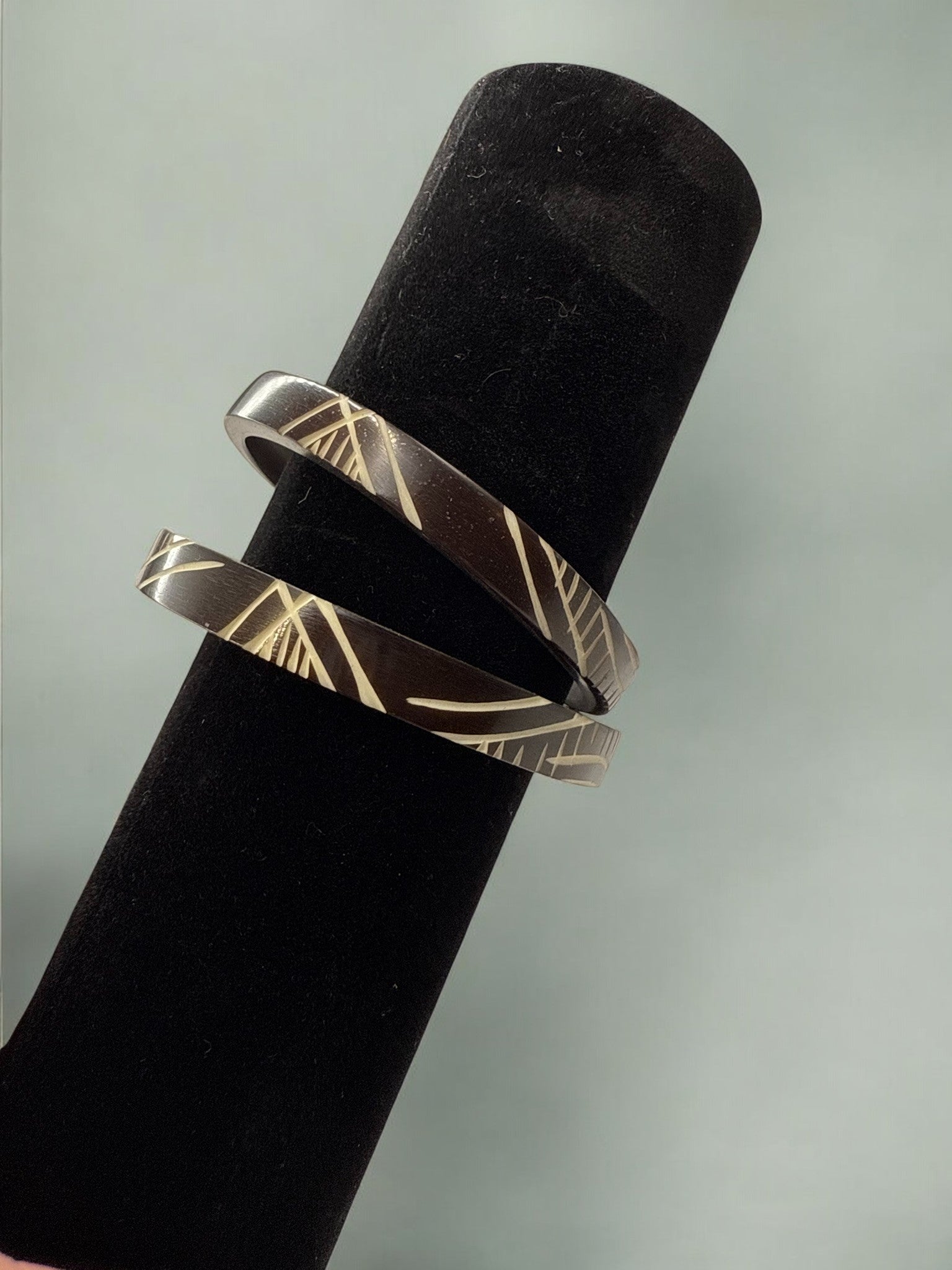 Bold and graphic, the Midnight Carved Bone Bangle Set features a pair of black bangles adorned with hand-etched ivory-tone tribal linework. The matte black finish contrasts beautifully with the carved geometric details, creating a striking, artisan look with global influence. Designed to be worn stacked or individually, these bangles add effortless edge and boho sophistication to any outfit. Lightweight yet statement-making, they are perfect for everyday wear or styling with layered jewelry. | Details: Set of two matching bangles; Black carved bone-style material; Hand-etched ivory-tone tribal pattern; Slip-on bangle design; Lightweight with smooth interior for comfort; Can be worn stacked or separately; Each piece may vary slightly due to handcrafted nature; Nickel & lead free