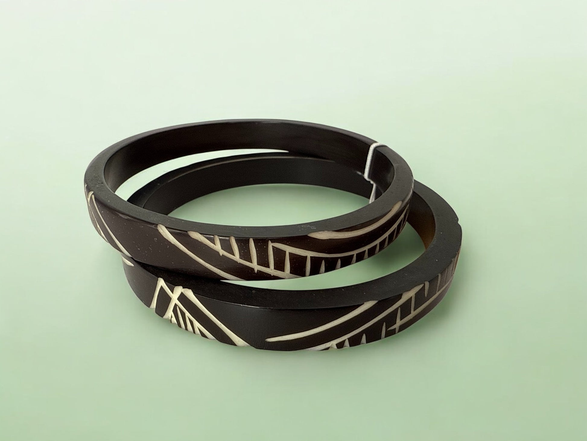Vintage Midnight Carved Bone Bangle Set 8.25"