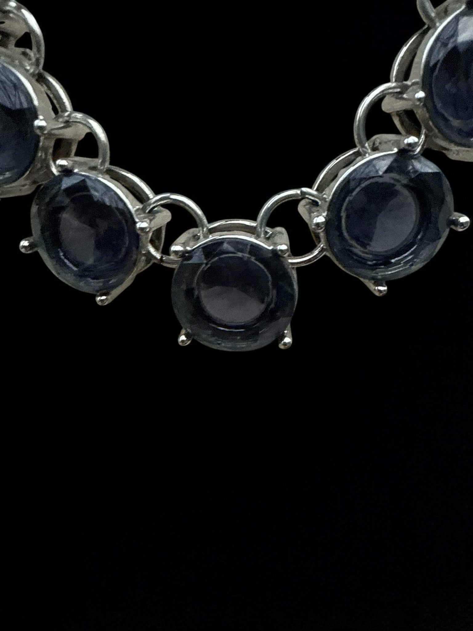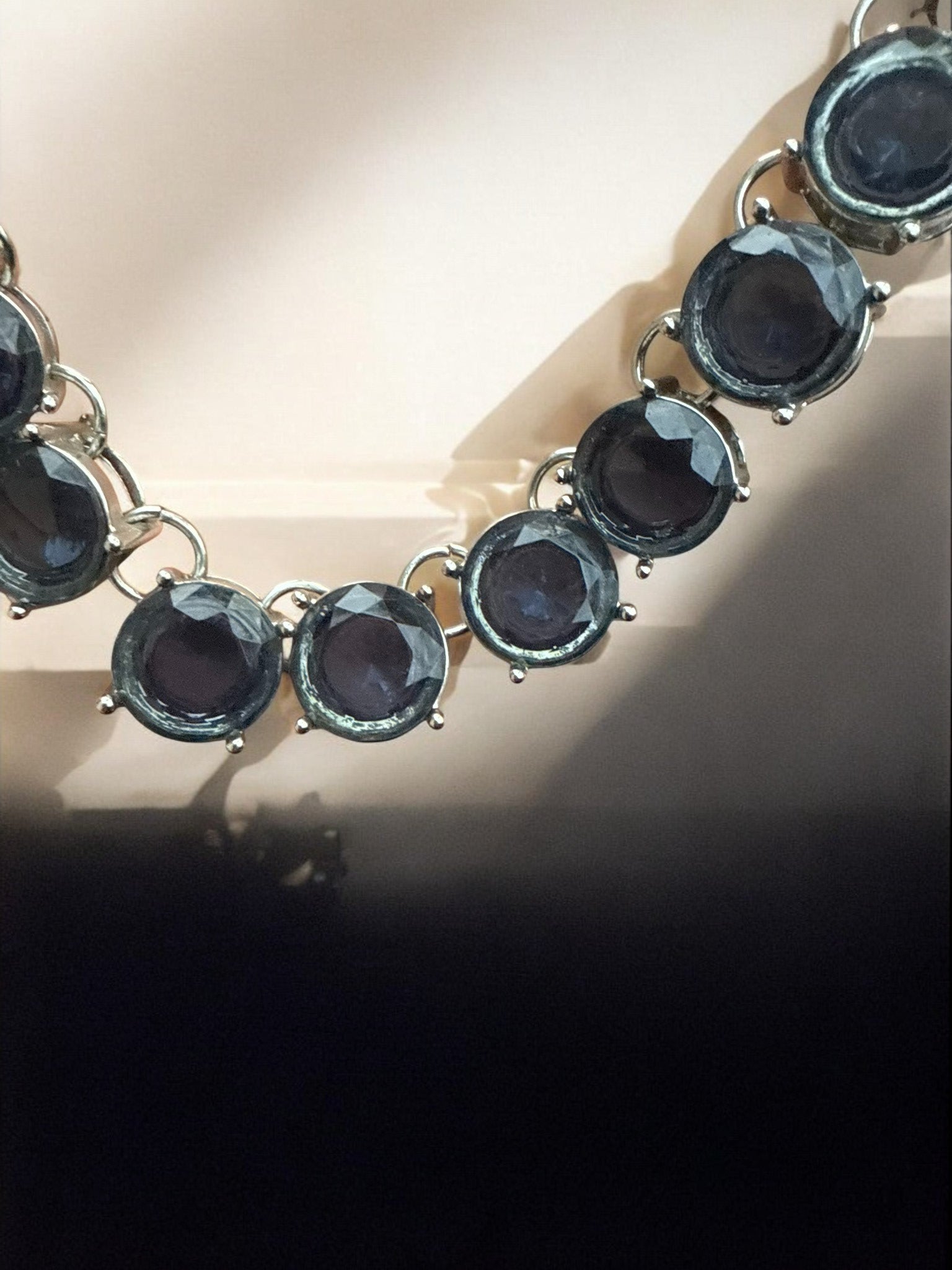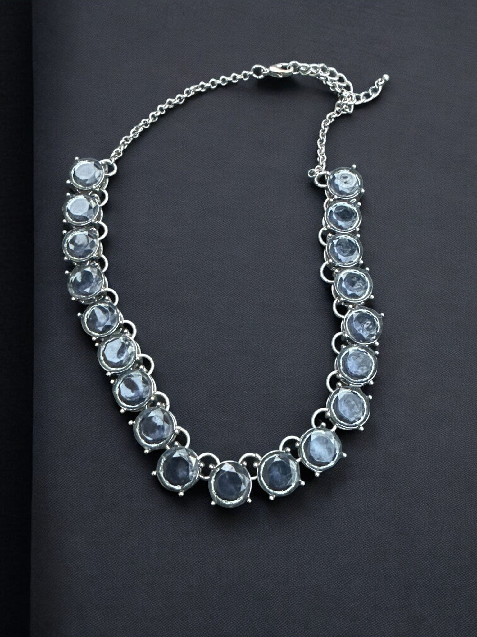 The Midnight Halo Necklace showcases a striking row of faceted smoky-gray stones, each set in a sleek silver-tone bezel and linked to create a fluid, luminous silhouette. The soft depth of the stones catches the light beautifully, offering just enough shimmer without overwhelming your look. Finished with an adjustable silver chain for versatile styling, this necklace sits effortlessly at the collarbone and transitions seamlessly from daytime polish to evening sophistication. A timeless statement piece designed for those who love subtle drama with refined elegance.