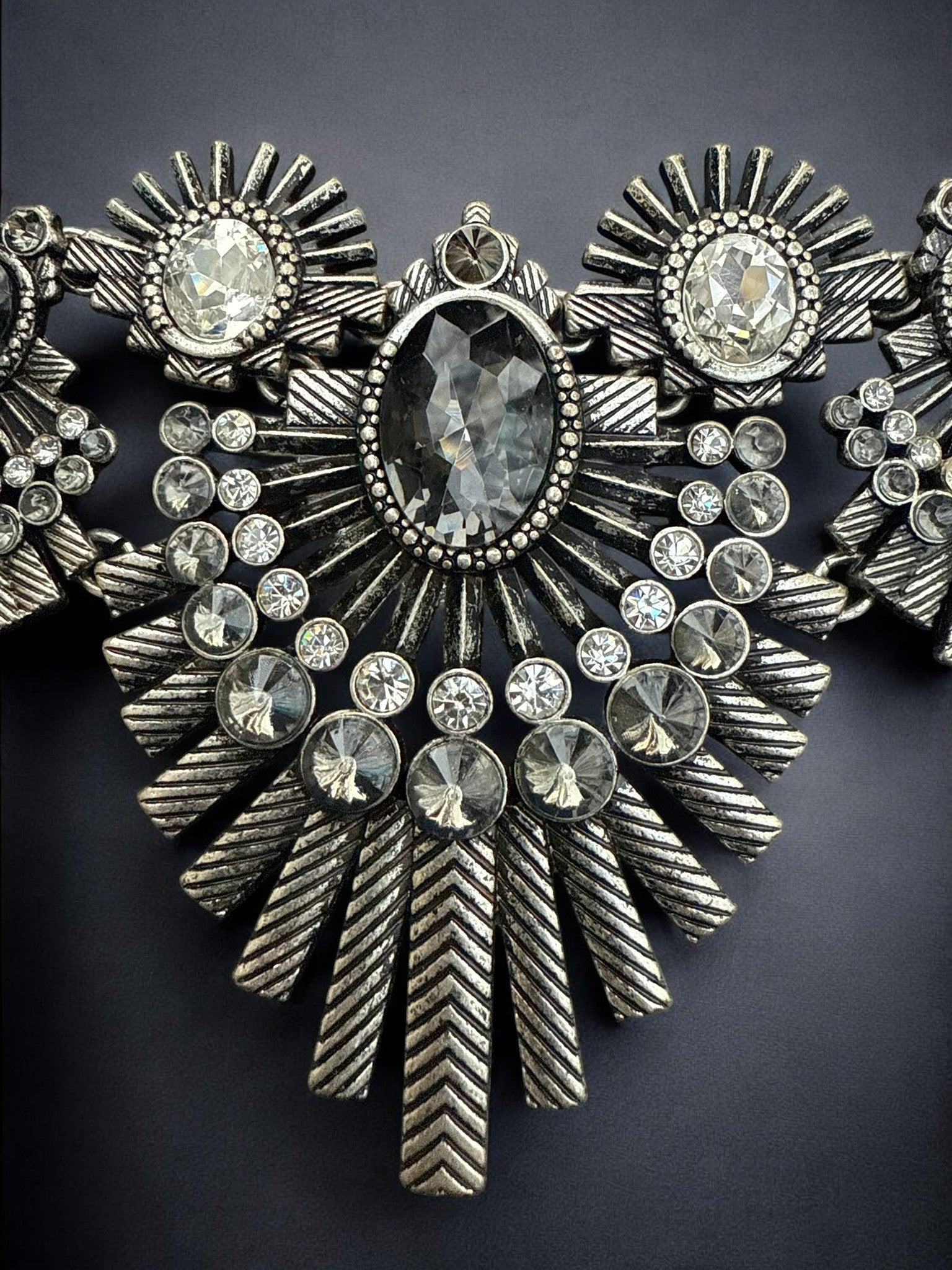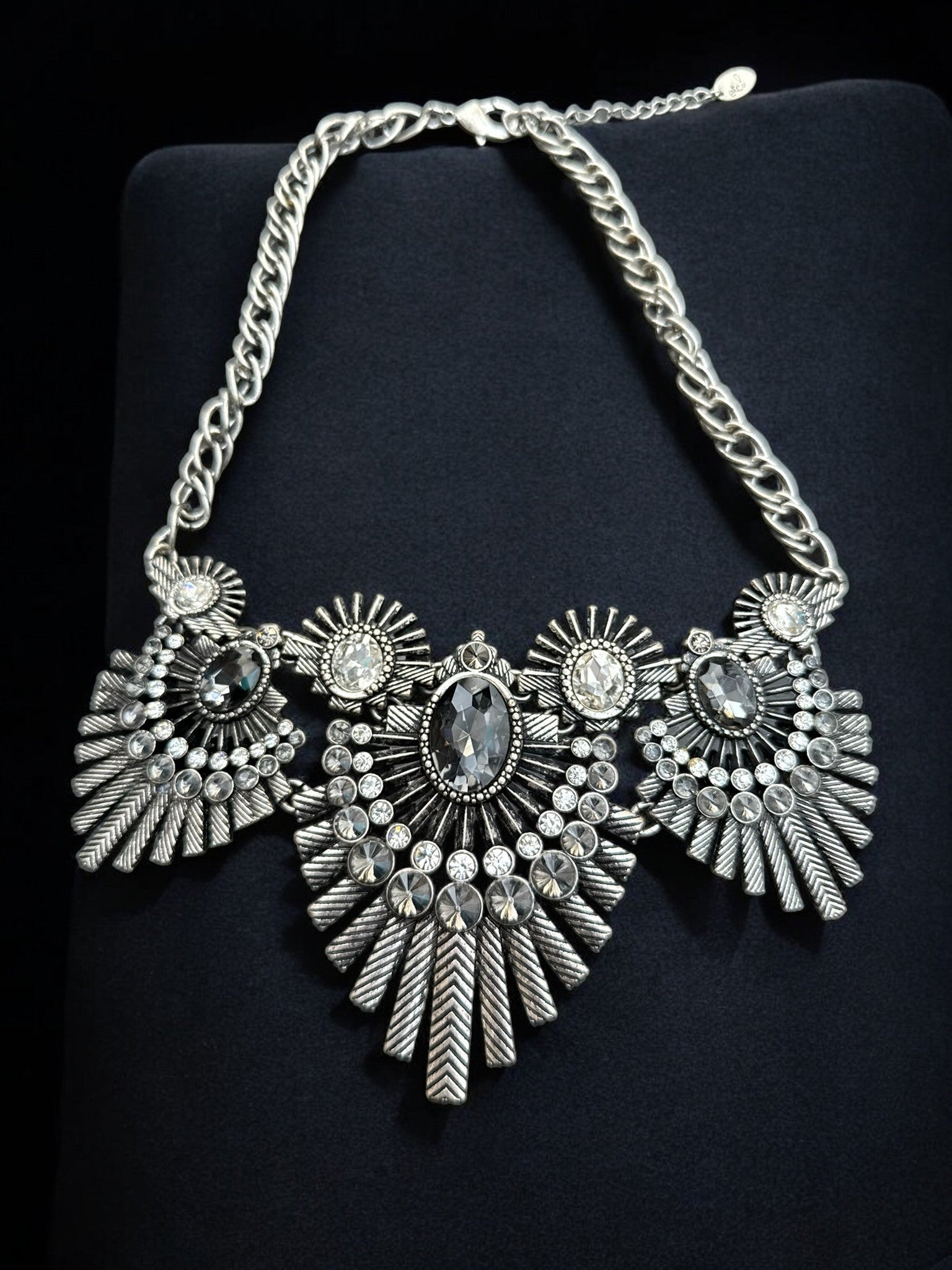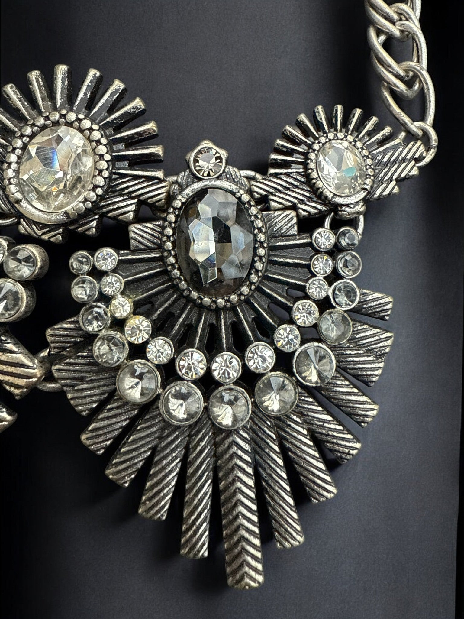The Midnight Radiance Statement Necklace is a striking, high-impact piece designed to command attention. Crafted in an antiqued silver tone, this bold necklace features an intricate arrangement of faceted crystal stones framed by dramatic sunburst-inspired metalwork. The layered design creates depth and movement, with a luminous central stone anchoring the look and cascading crystal accents catching the light from every angle. Finished with a sturdy chain that balances its ornate detail, this necklace blends vintage glamour with modern edge, making it the perfect statement piece for evening wear, special occasions, or elevating a simple black top into something unforgettable.