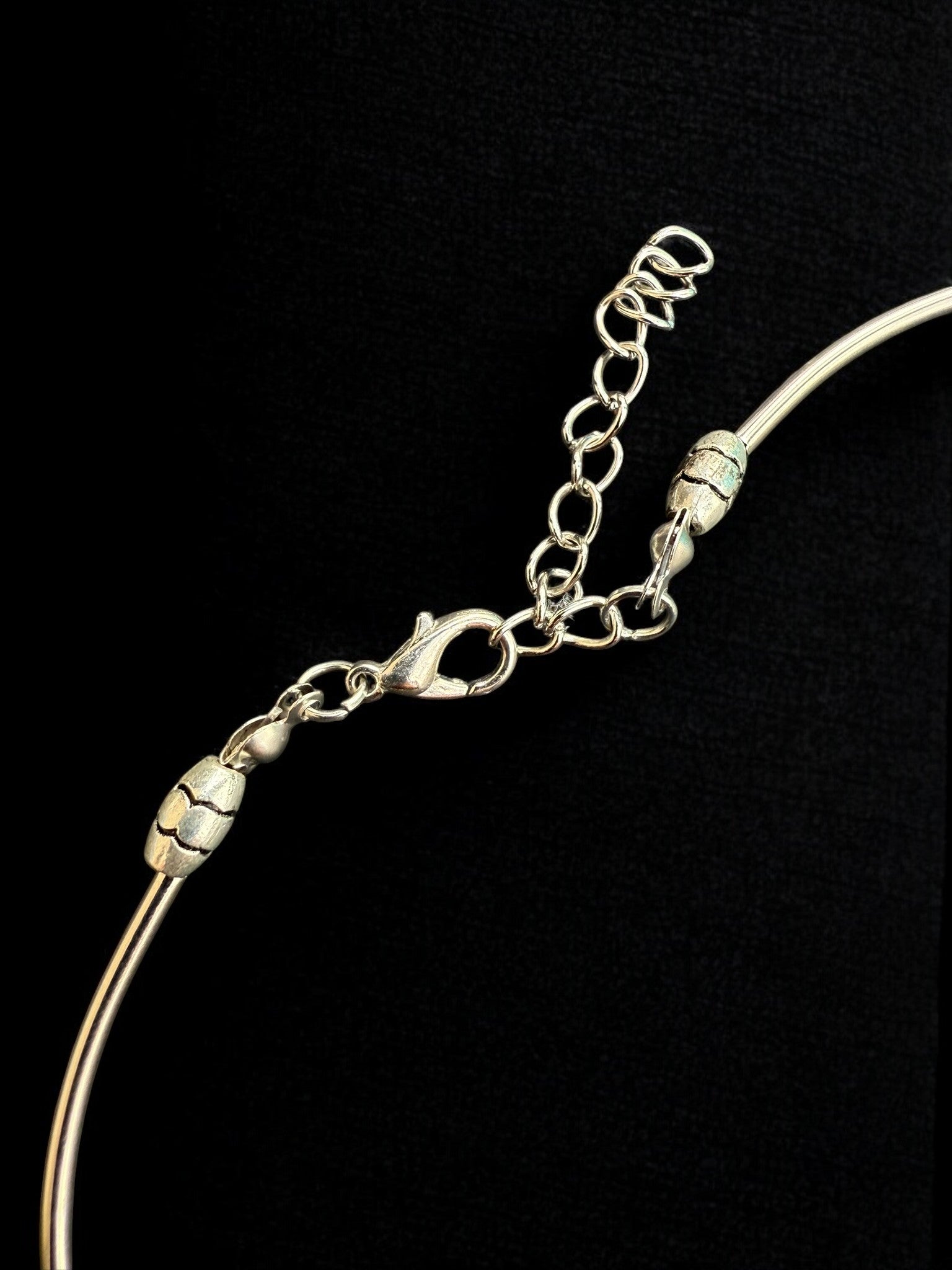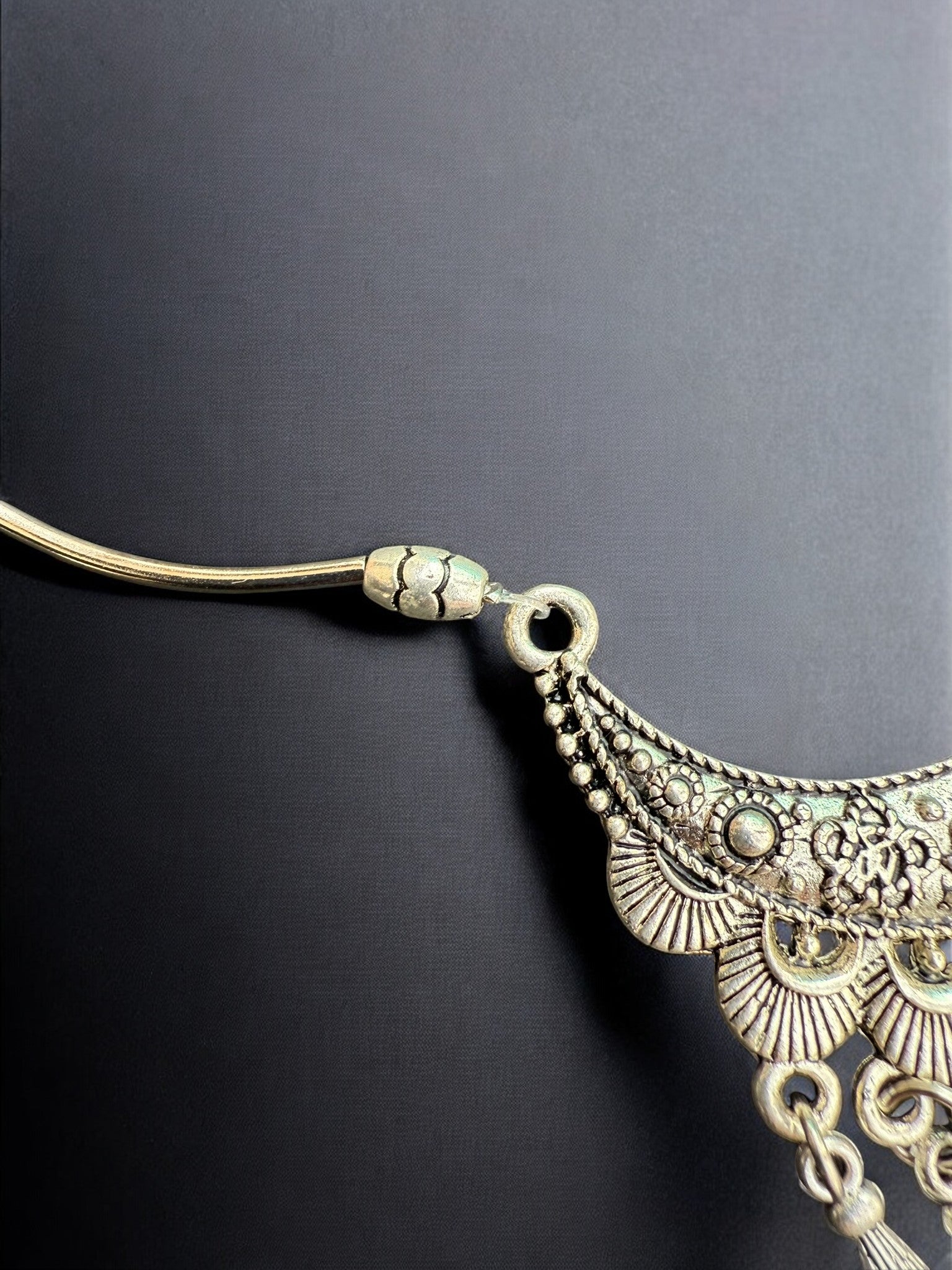 The Moonrise Fringe Necklace features a beautifully detailed crescent-shaped centerpiece adorned with delicate texturing and softly dangling fringe charms that create subtle movement with every step. Set on a sleek silver-tone chain with sculpted bead accents, this piece blends vintage inspiration with a free-spirited, boho elegance. Eye-catching yet lightweight, it’s perfect for adding character to a simple blouse or layering with other favorites for an effortlessly styled look that feels both timeless and soulful.