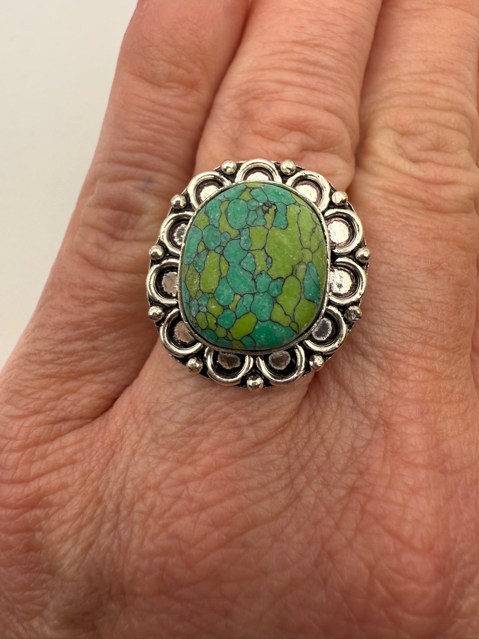 This statement ring features a striking mosaic-style turquoise stone in layered shades of soft green and blue, creating a natural cracked pattern that makes every piece one of a kind. Framed by an ornate silver-tone scalloped setting with vintage-inspired detailing, the oval cabochon sits bold and centered for maximum impact. Earthy yet refined, this ring blends boho soul with everyday luxury—perfect worn solo as a statement or paired with mixed metals for a collected, effortless look.