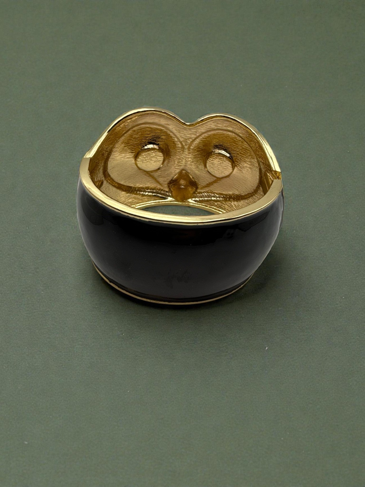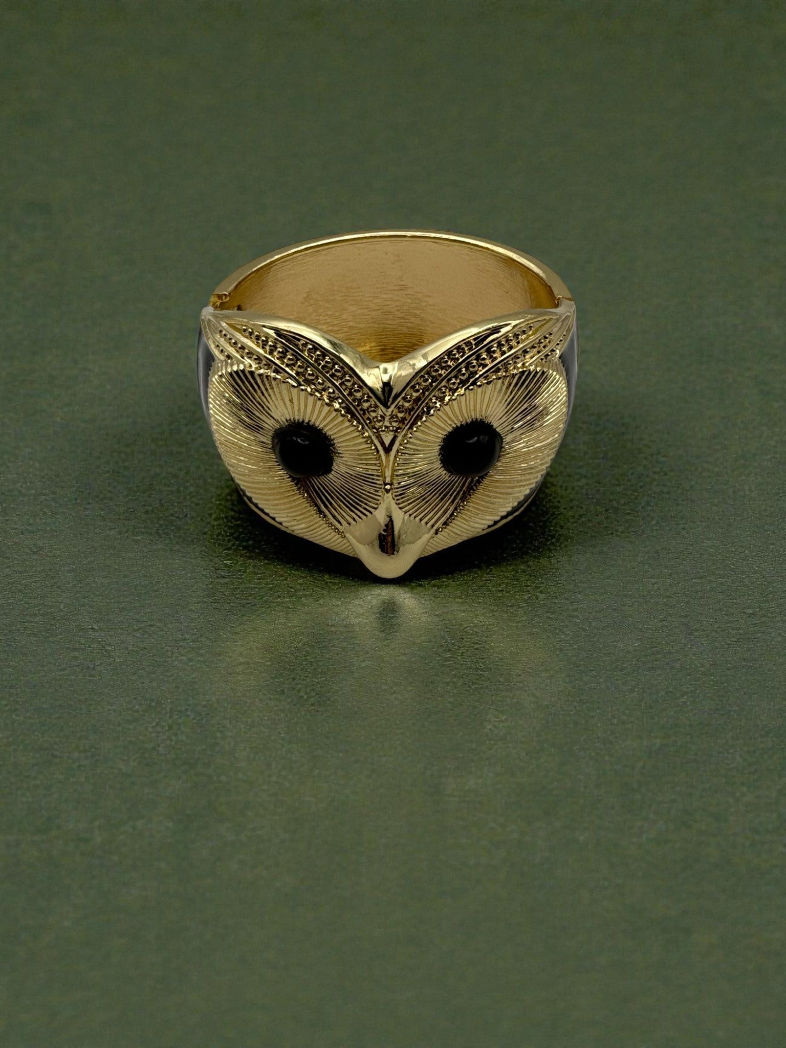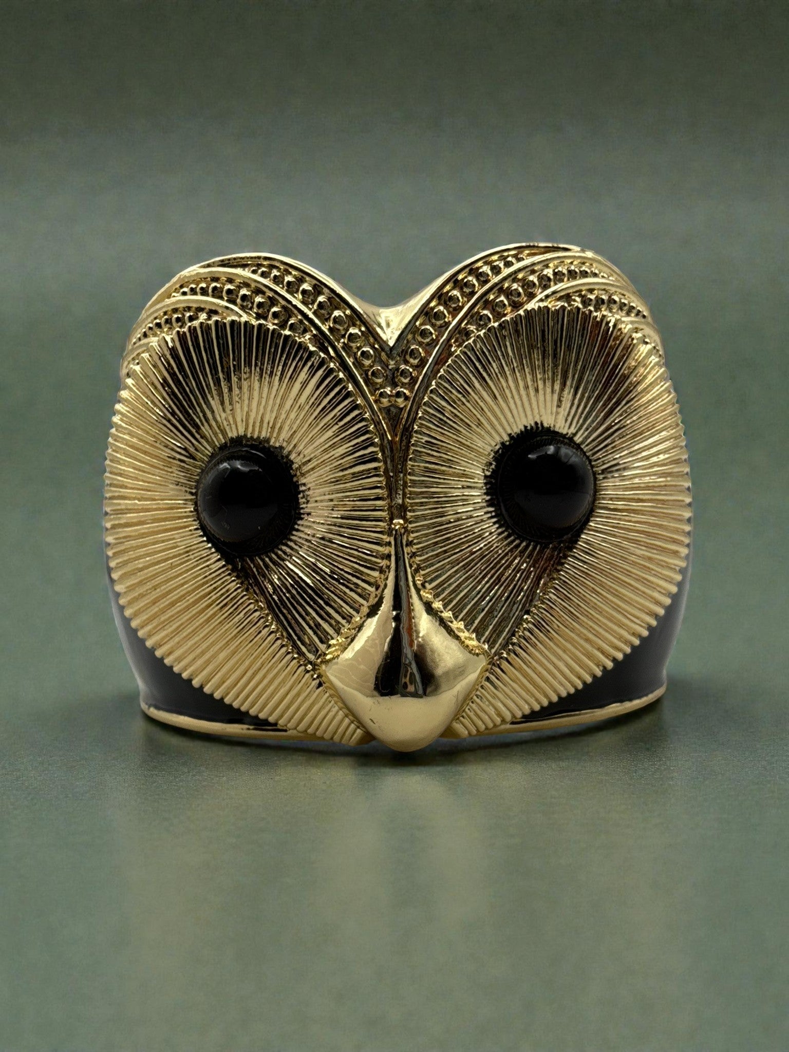 Mysterious, powerful, and unapologetically chic, the Nocturne Owl Cuff is a statement piece that commands attention without saying a word. Featuring an intricately sculpted owl face in high-shine gold with striking black stone eyes, this wide cuff symbolizes wisdom, intuition, and quiet confidence. The bold silhouette balances elegance with edge, making it the perfect accessory for both daytime polish and evening drama. Designed for the woman who leads with instinct and style, this cuff is more than jewelry—it’s a presence. | Details: Wide statement cuff design; Gold-tone metal finish; Sculpted owl motif with black stone eyes; Hinged closure for comfortable wear; Lightweight yet bold feel; Nickel & lead free
