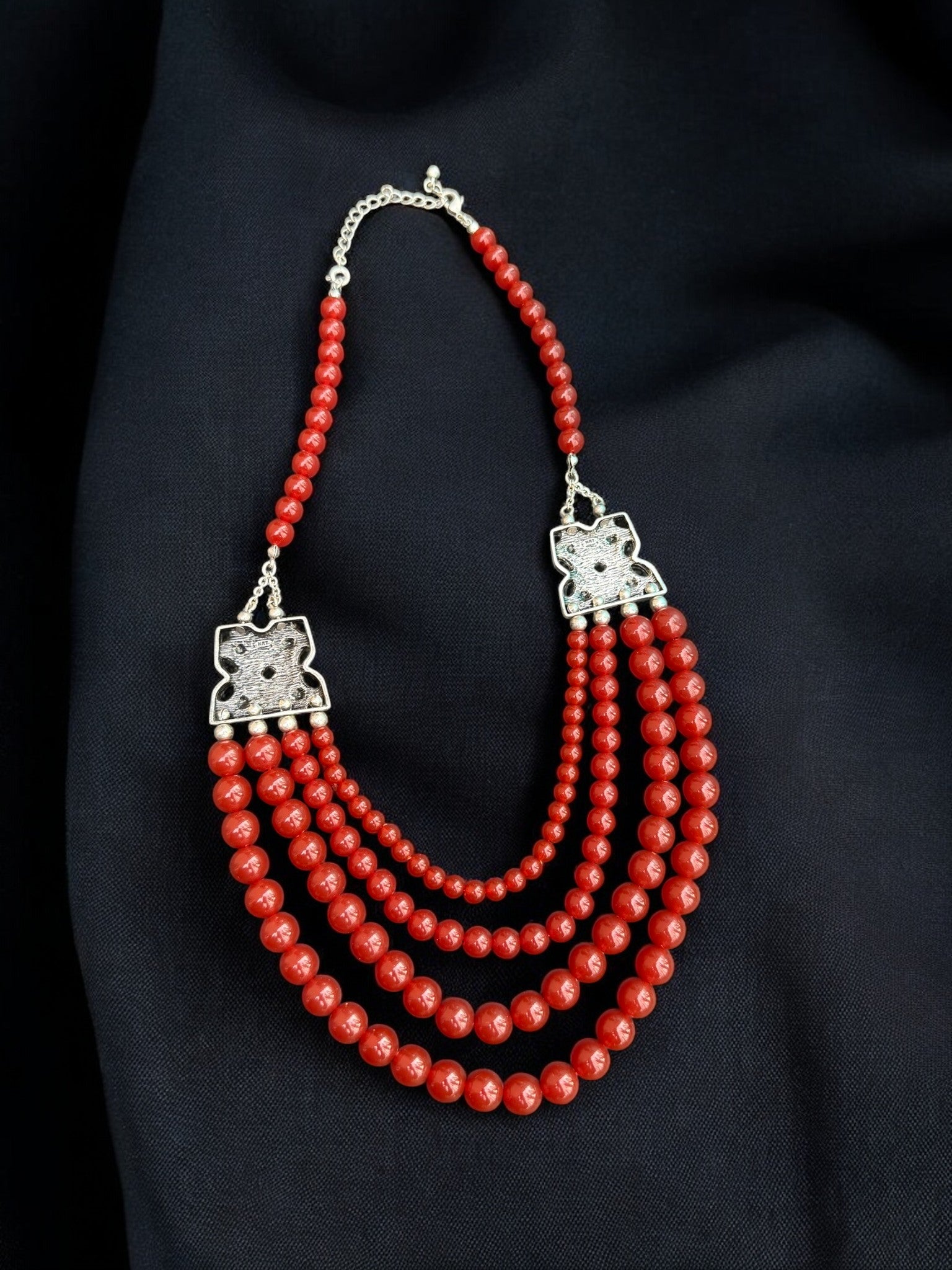 The NRT Scarlet Empress Necklace is a striking, vintage statement piece signed by NRT, celebrated for bold, collectible designs. Featuring cascading strands of rich red beads, this necklace delivers dramatic depth and fluid movement, while ornate silver-tone connectors add an elegant, old-world contrast. The vibrant scarlet hue paired with the intricate metalwork creates a powerful, confident look that elevates everything from a simple black dress to a dressed-up casual ensemble. Signed and distinctive, this necklace is perfect for collectors and style-forward wearers who appreciate vintage craftsmanship with unmistakable presence.