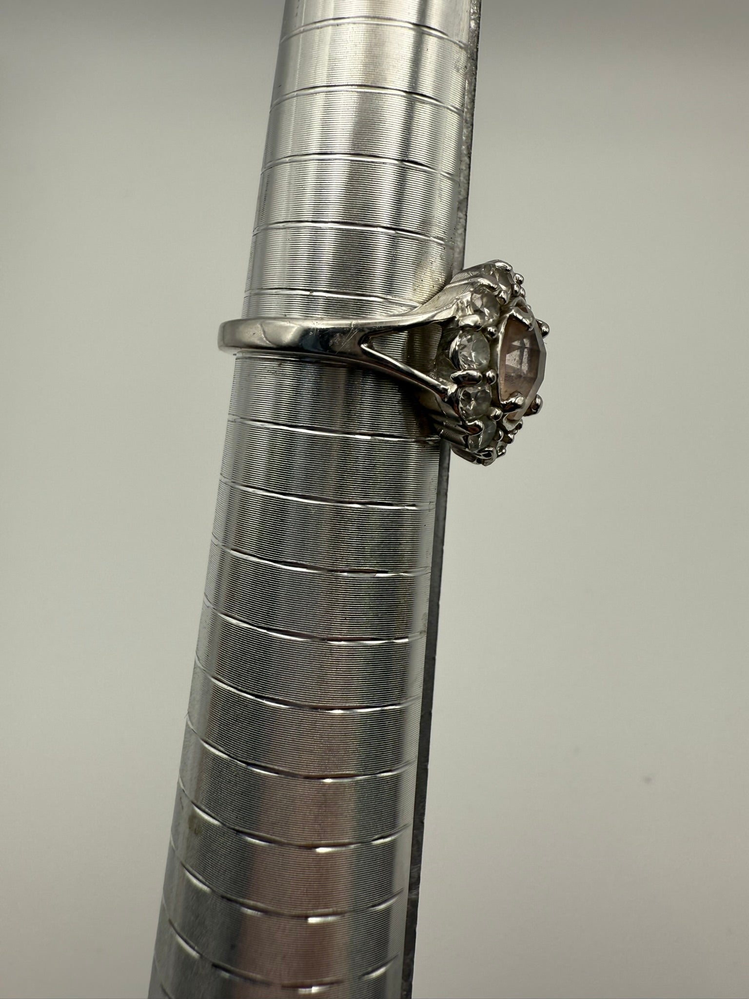 This elegant vintage ring features a softly faceted round center stone in warm pinky-peach tones, framed by a delicate halo of clear accent stones. The silver-tone setting adds a timeless finish, while the balanced scale keeps the look refined rather than bold. Subtle sparkle and classic proportions make this piece perfect for everyday wear or effortless layering.