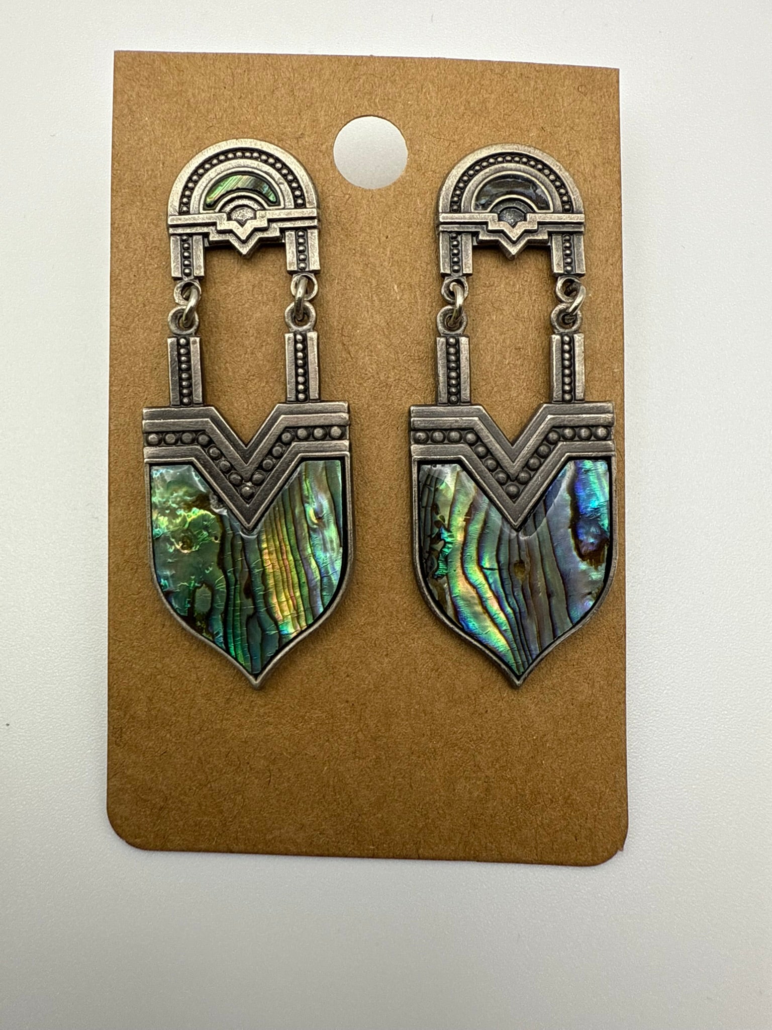 A rare statement piece for the collector at heart, these Richard Nuri signed earrings showcase bold Southwestern artistry with luminous abalone shell inlays. Each shield-shaped drop reflects shifting tones of emerald, teal, and midnight blue, framed in intricate silver-tone metalwork that highlights the craftsmanship behind the design.