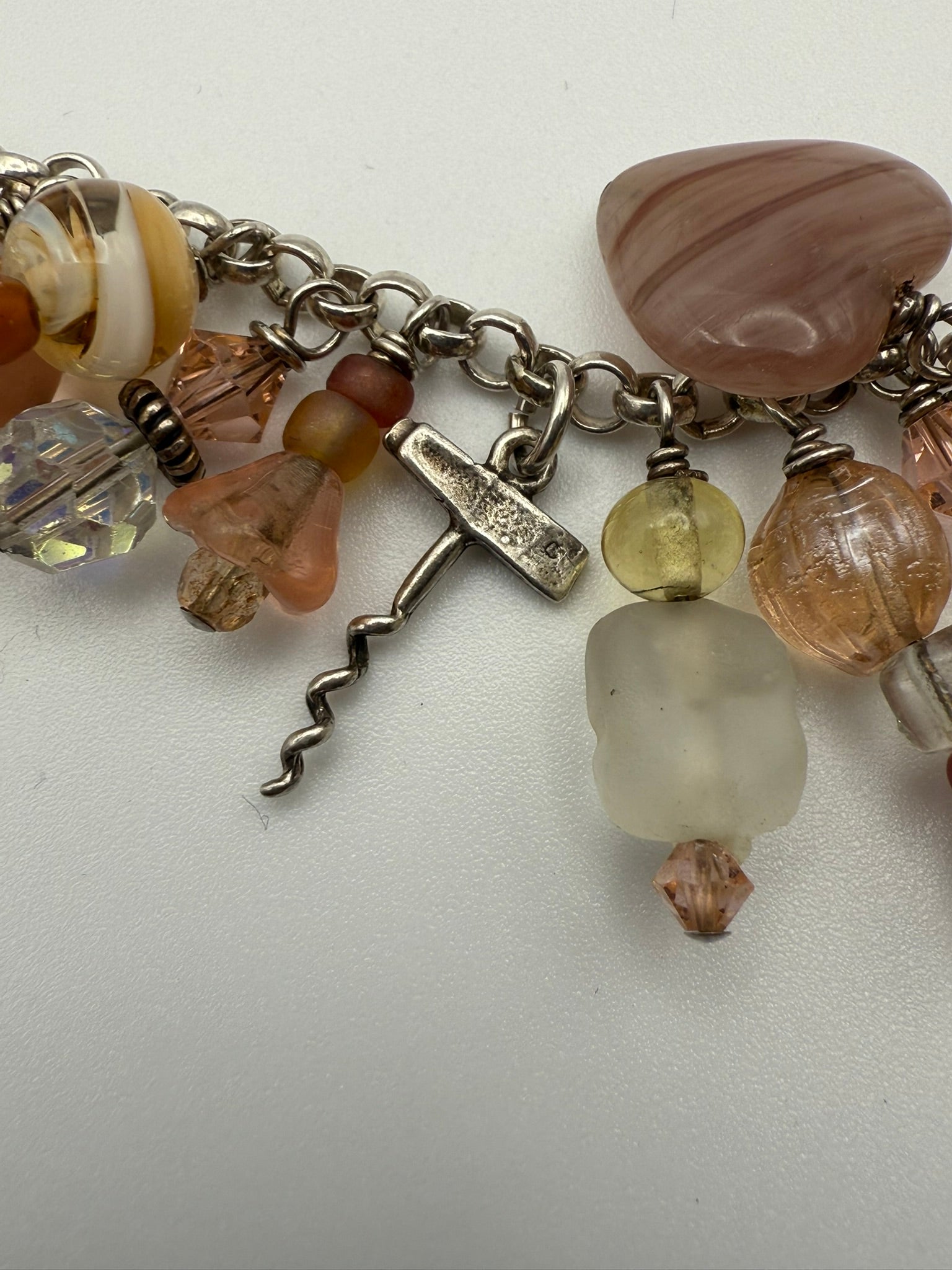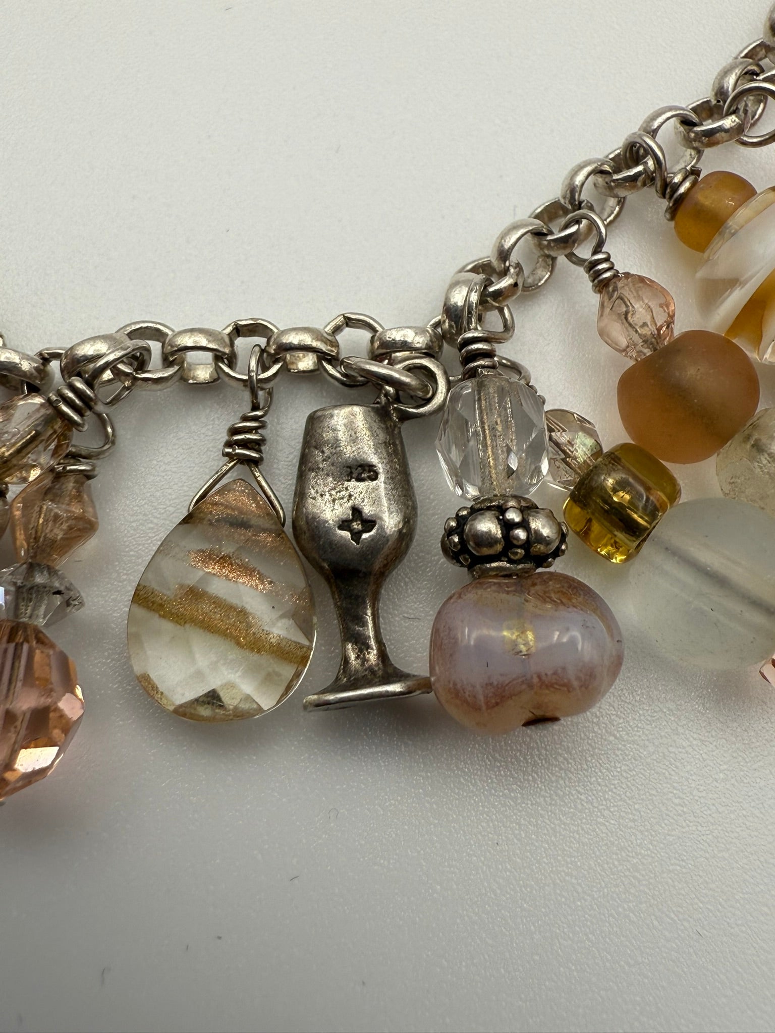 Rosé Reverie Wine Charm Bracelet features a silver-tone chain adorned with an artful mix of blush, amber, and soft neutral glass beads, accented with subtle crystal details and a playful wine bottle charm. Designed with a collected-over-time feel, the layered charms create beautiful movement and texture while celebrating wine-lover style. Expressive yet elegant, this bracelet adds a touch of whimsy and warmth to everyday looks and makes a perfect statement piece for tastings, gatherings, or gifting.