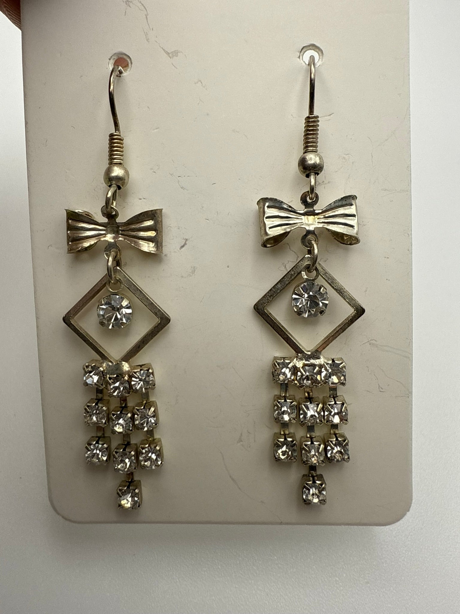 Delicately feminine with timeless sparkle, these vintage silver-tone earrings feature sculpted bow details paired with geometric open frames and cascading crystal drops. Faceted clear stones catch the light with every movement, creating an elegant shimmer that feels both playful and refined. Inspired by classic Art Deco styling, they’re the perfect statement for evening wear, weddings, or adding a touch of old-world glamour to a modern look.
