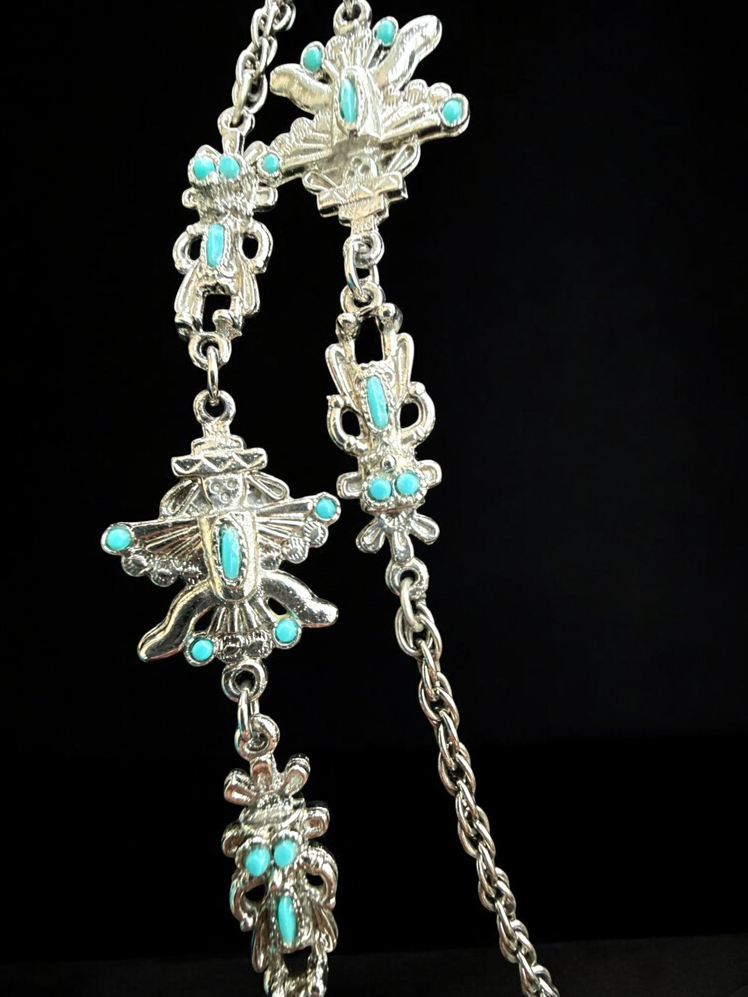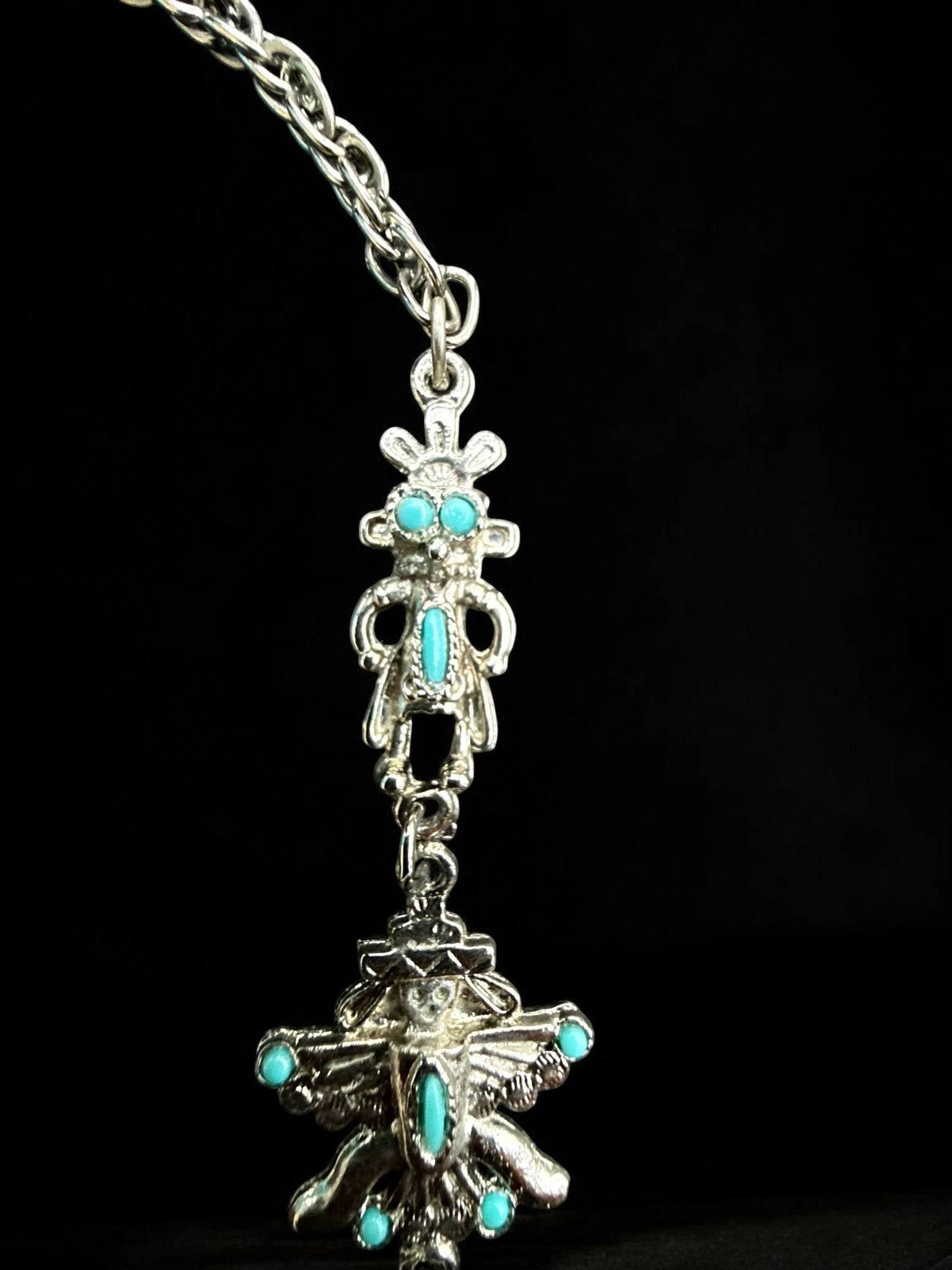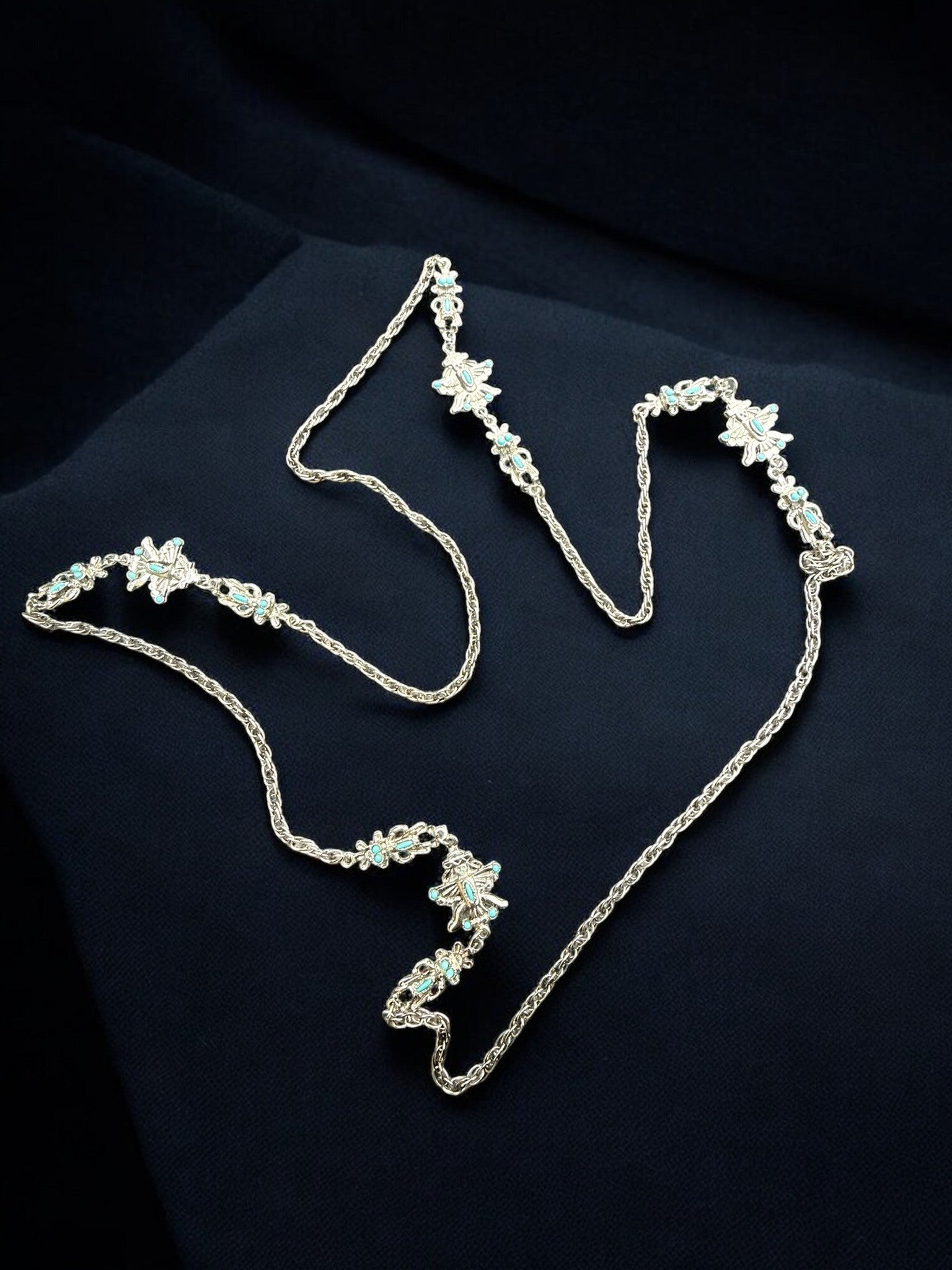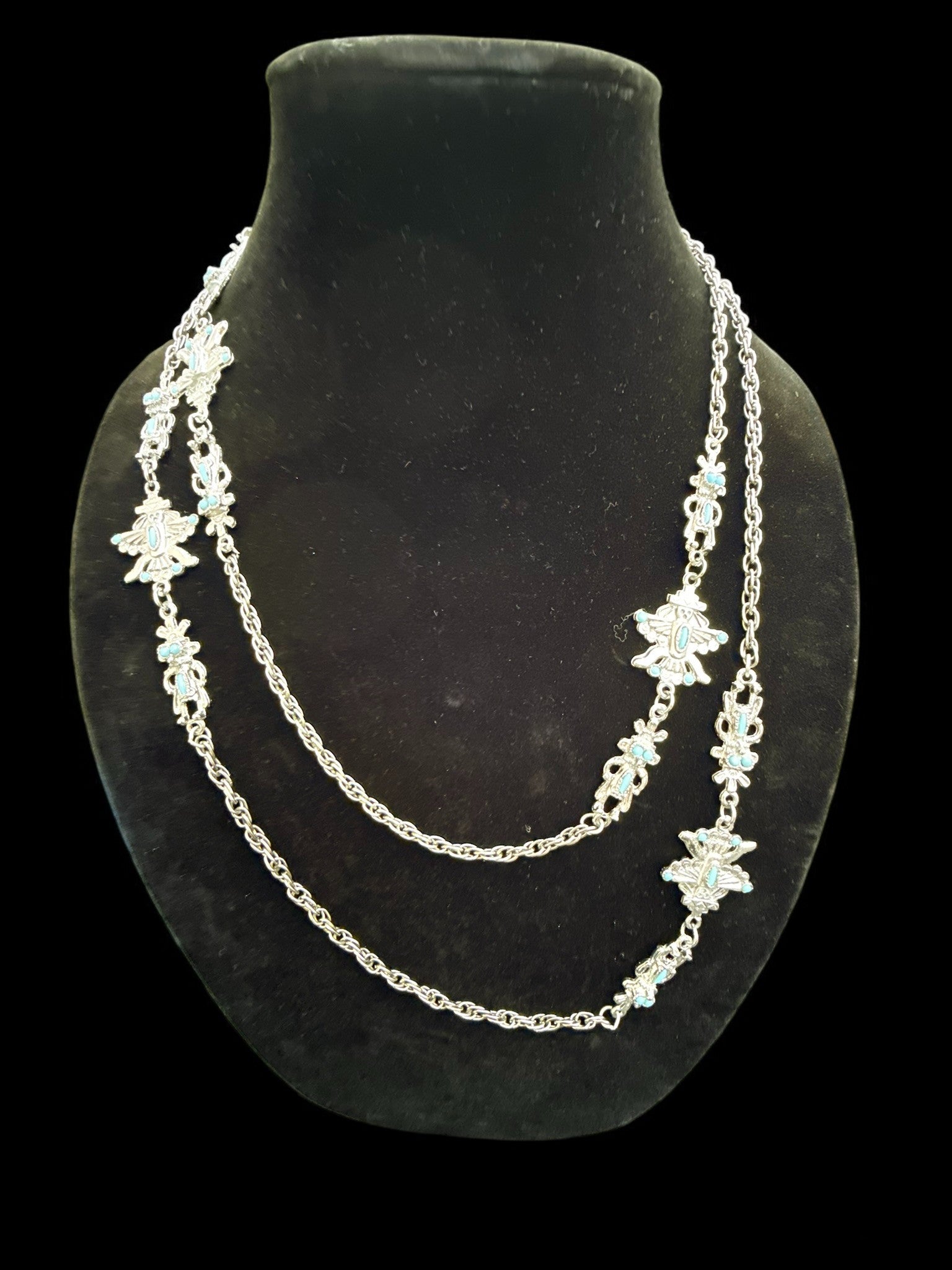 The Silver Sky Thunderbird Necklace is a striking statement piece rooted in Southwestern symbolism and timeless silver style. Crafted in a silver-tone finish, this double-strand necklace features detailed Thunderbird motifs accented with soft turquoise stones along the chain. The Thunderbird, a symbol of strength, protection, and power, adds bold character while the layered silver chains create effortless movement and dimension. Perfect for elevating a simple tee, flowy dress, or denim-on-denim look, this necklace blends vintage soul with modern boho edge—an eye-catching piece for those who love jewelry with meaning and presence.