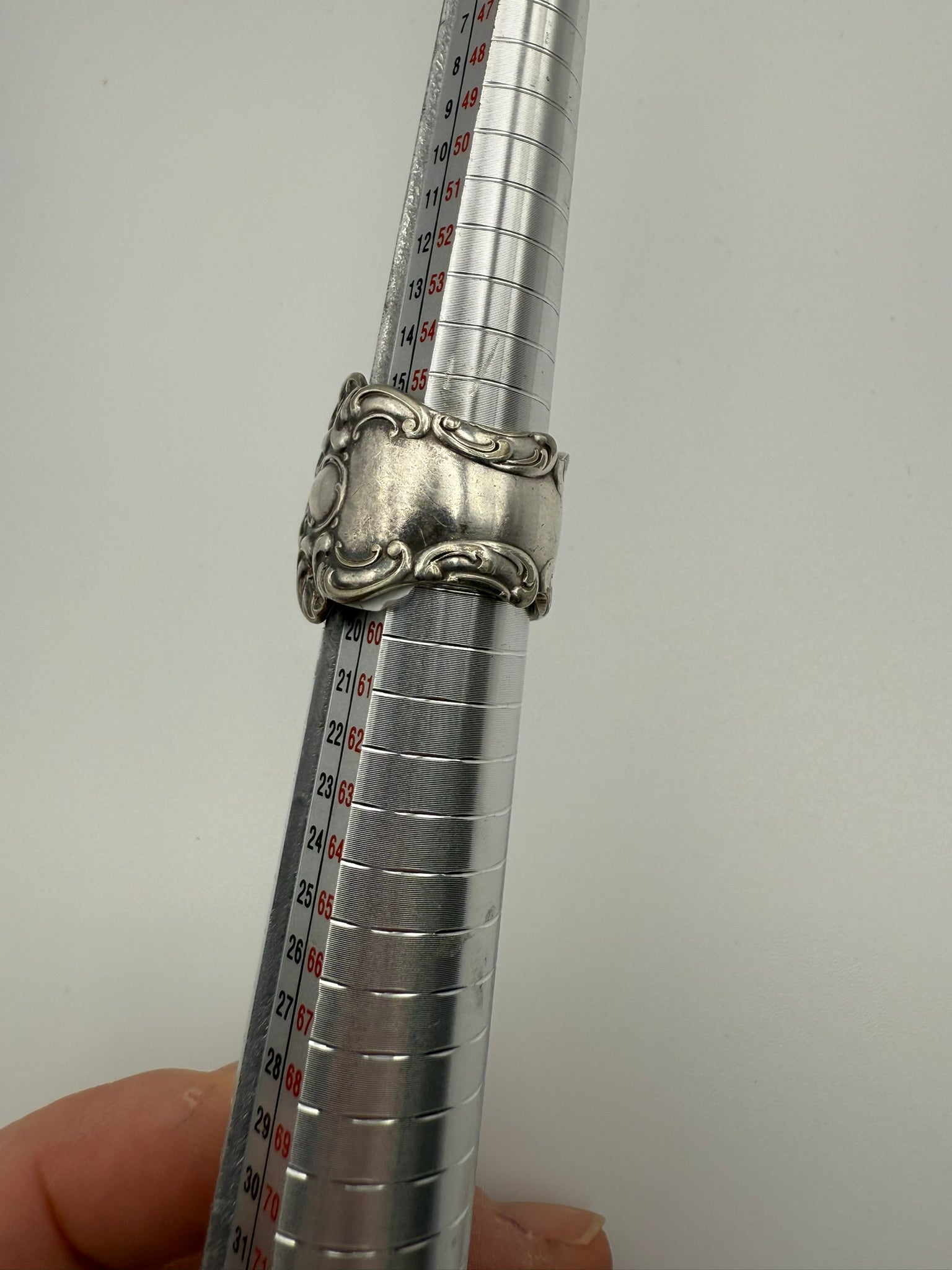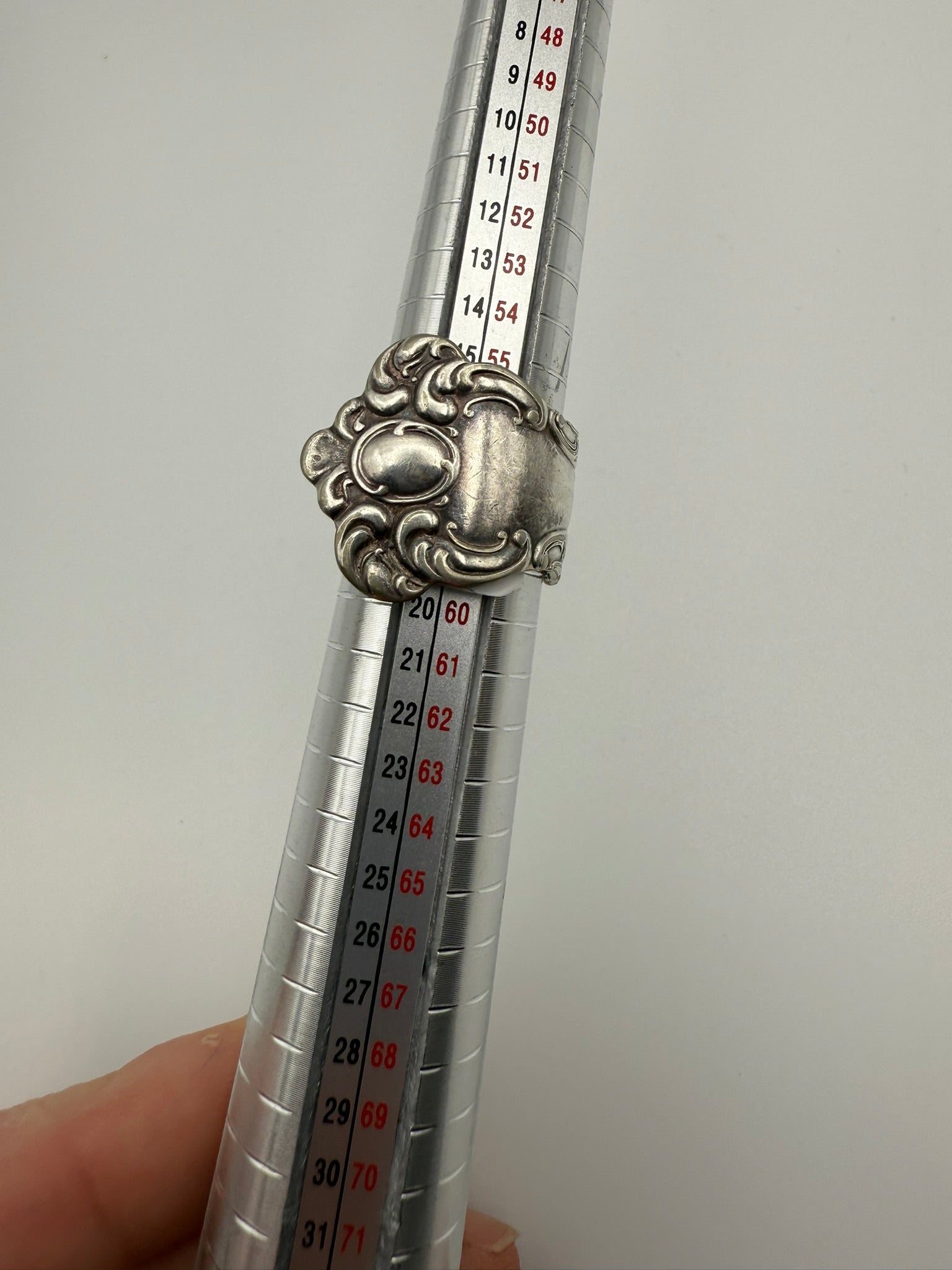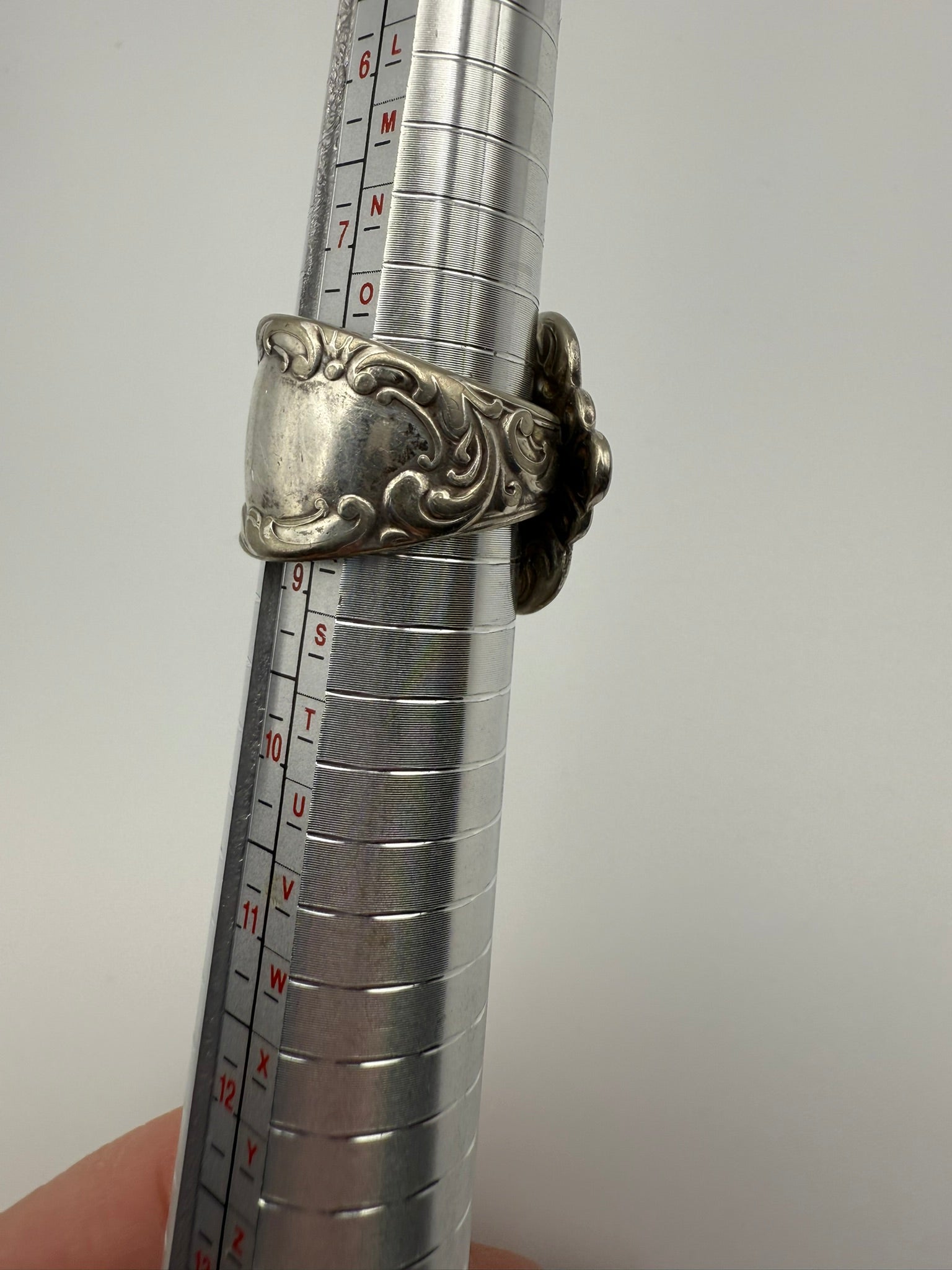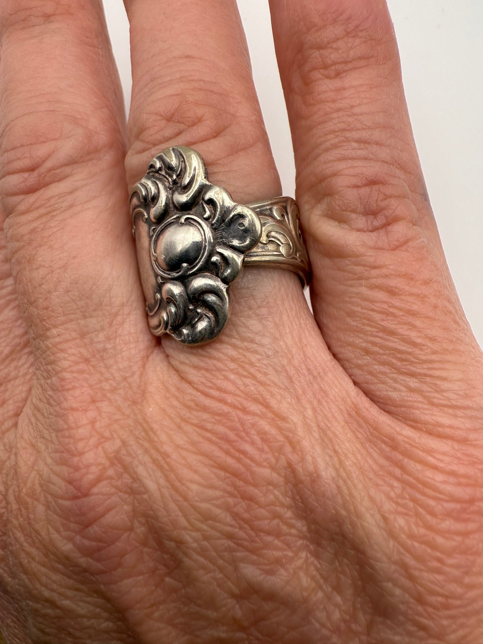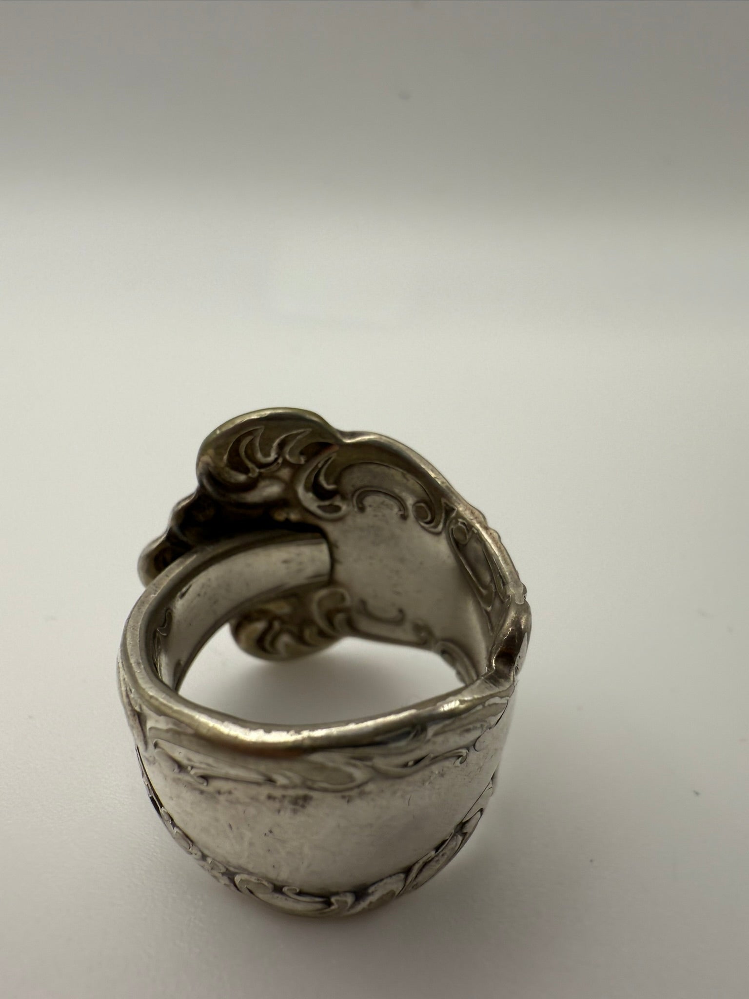 This vintage silver spoon ring features an ornate handle design wrapped seamlessly into a wearable statement piece, showcasing classic baroque-style scrollwork and timeless craftsmanship. Repurposed from a vintage spoon, the detailed patterning and sculpted curves give this ring a one-of-a-kind, heirloom feel. Bold yet refined, it’s perfect for lovers of vintage jewelry, eclectic styling, and pieces with a story—each ring carrying subtle variations that make it uniquely yours.