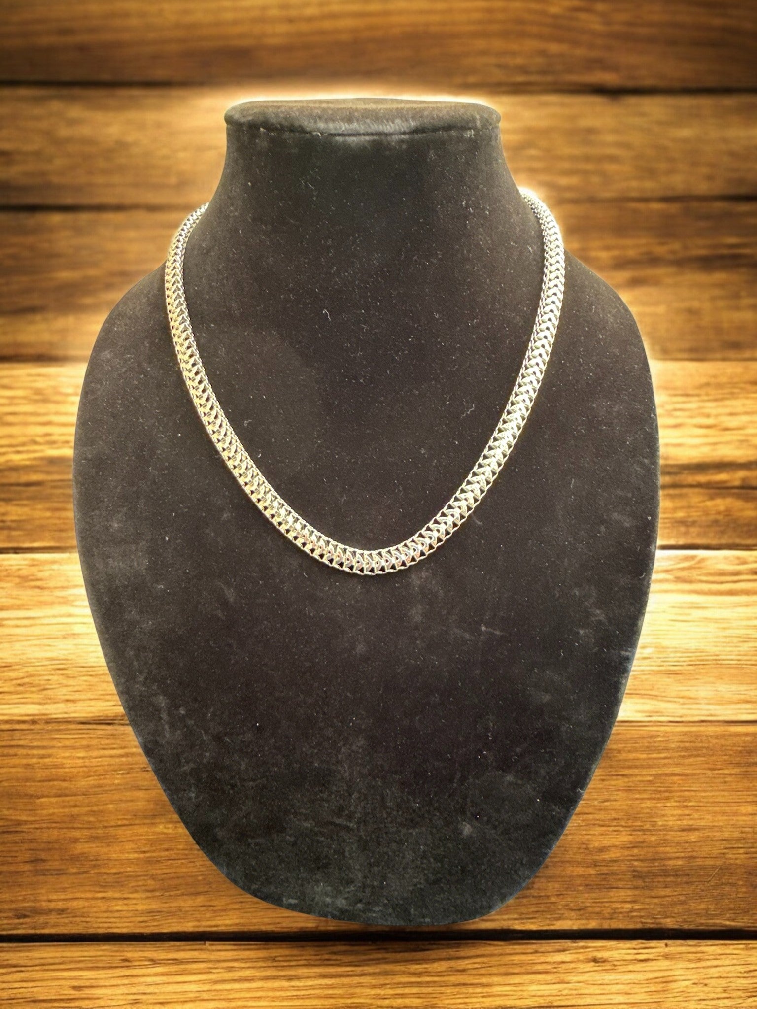 This timeless vintage silver-tone necklace features an intricate woven link design that creates beautiful texture and fluid movement along the neckline. With its smooth, polished finish and classic silhouette, this piece offers understated elegance that transitions effortlessly from everyday wear to evening styling. Perfect worn alone for a clean, minimalist look or layered with other chains for added depth, this versatile vintage staple brings quiet sophistication and enduring style to any jewelry collection.