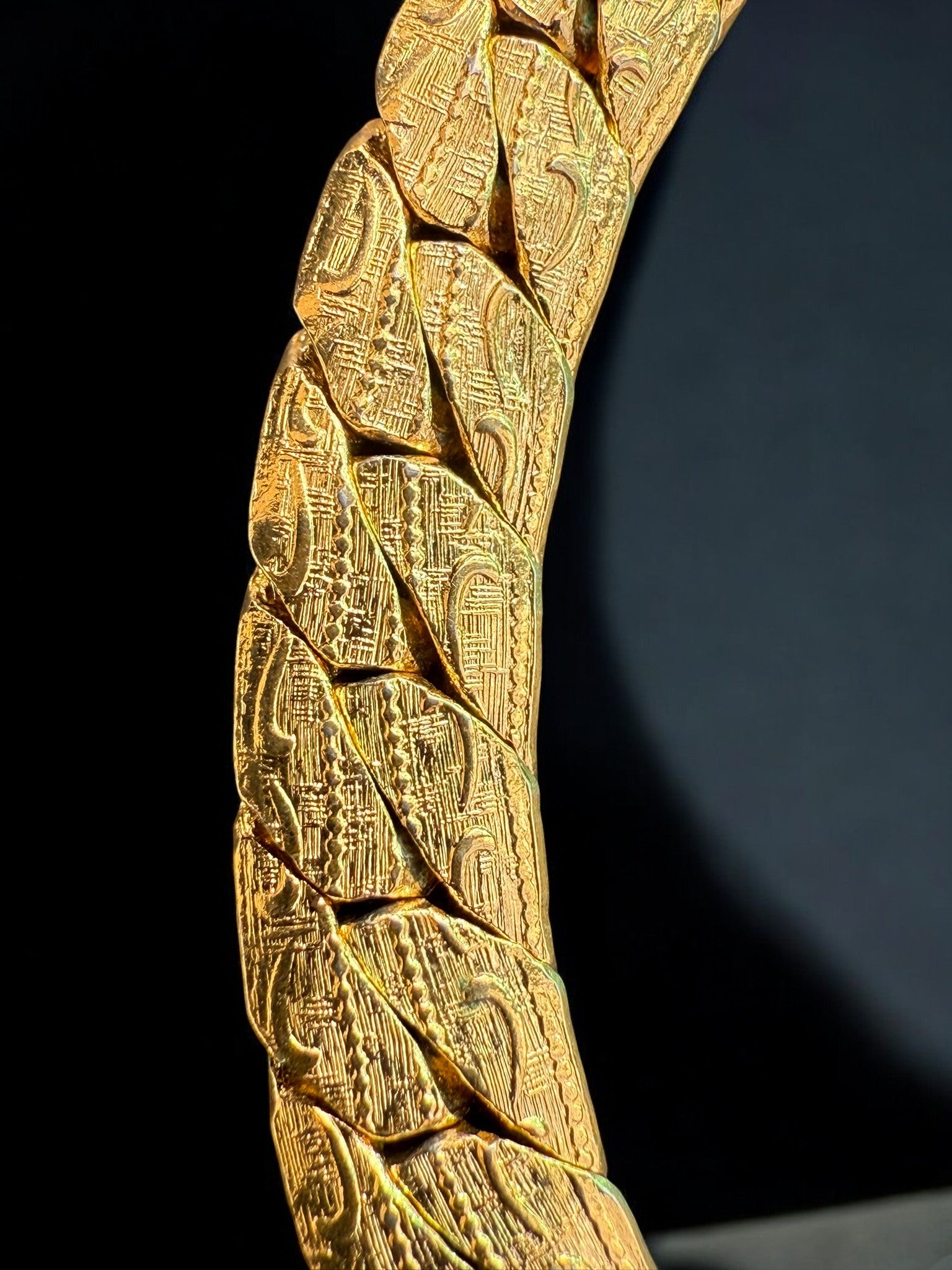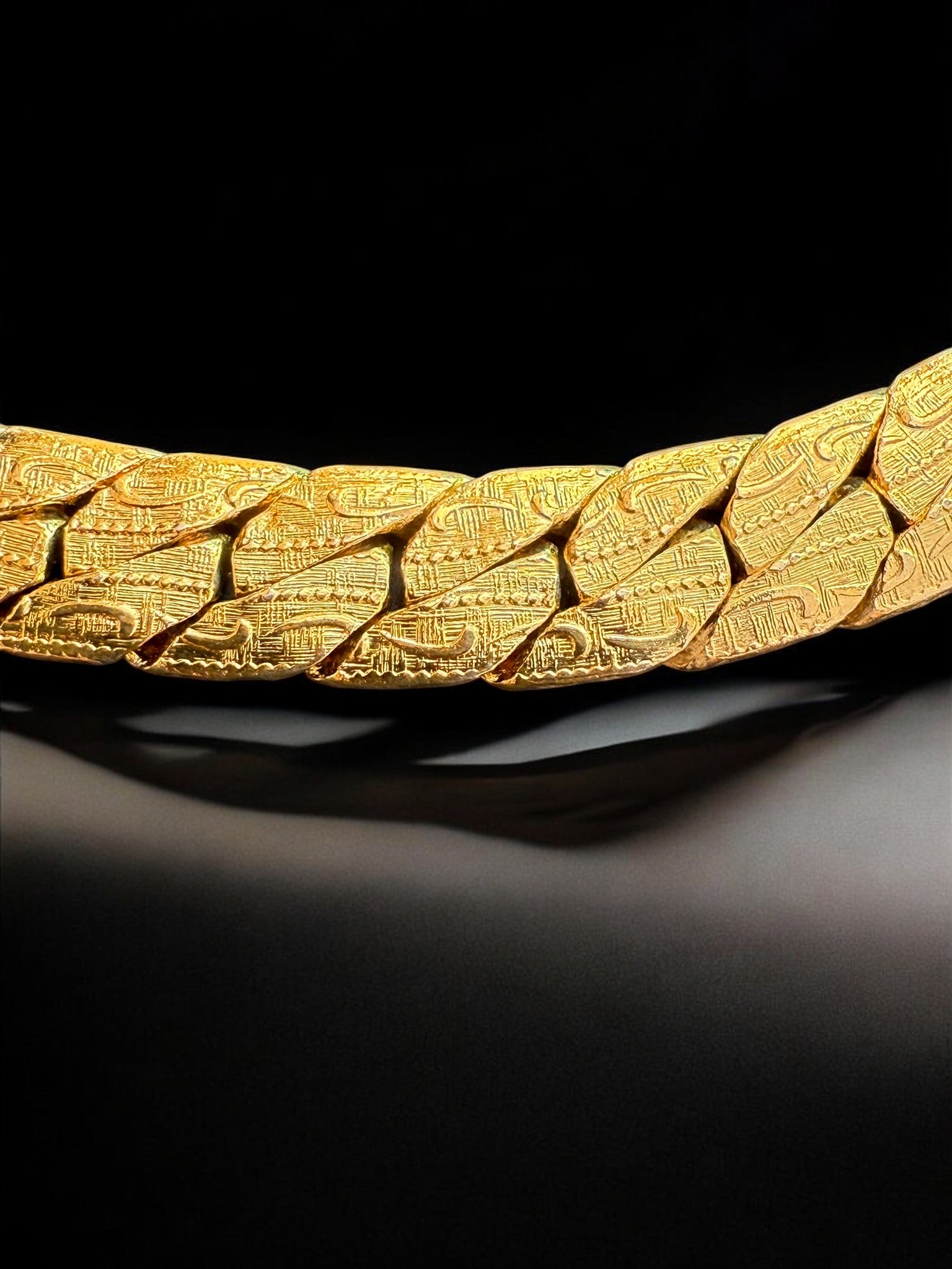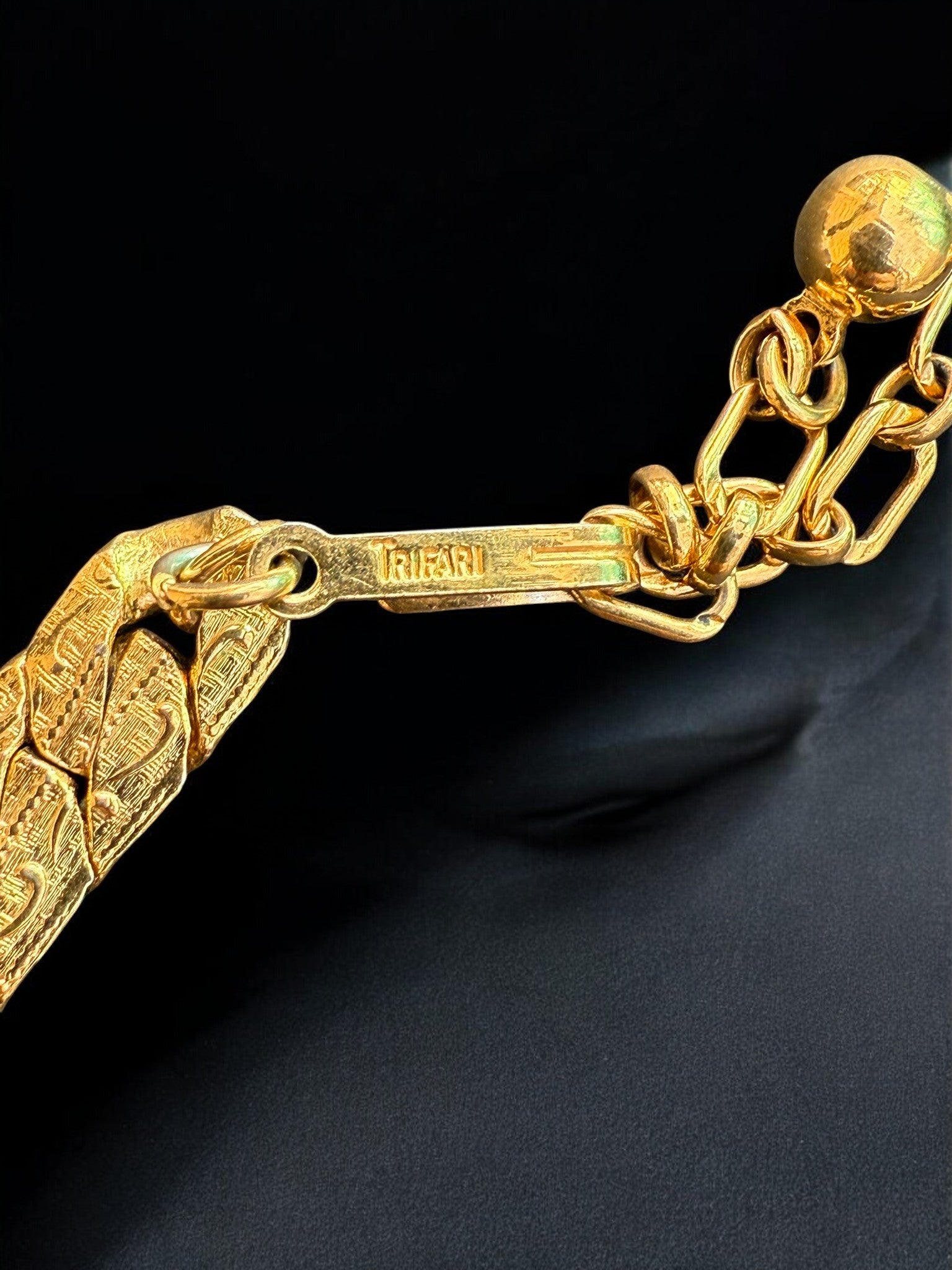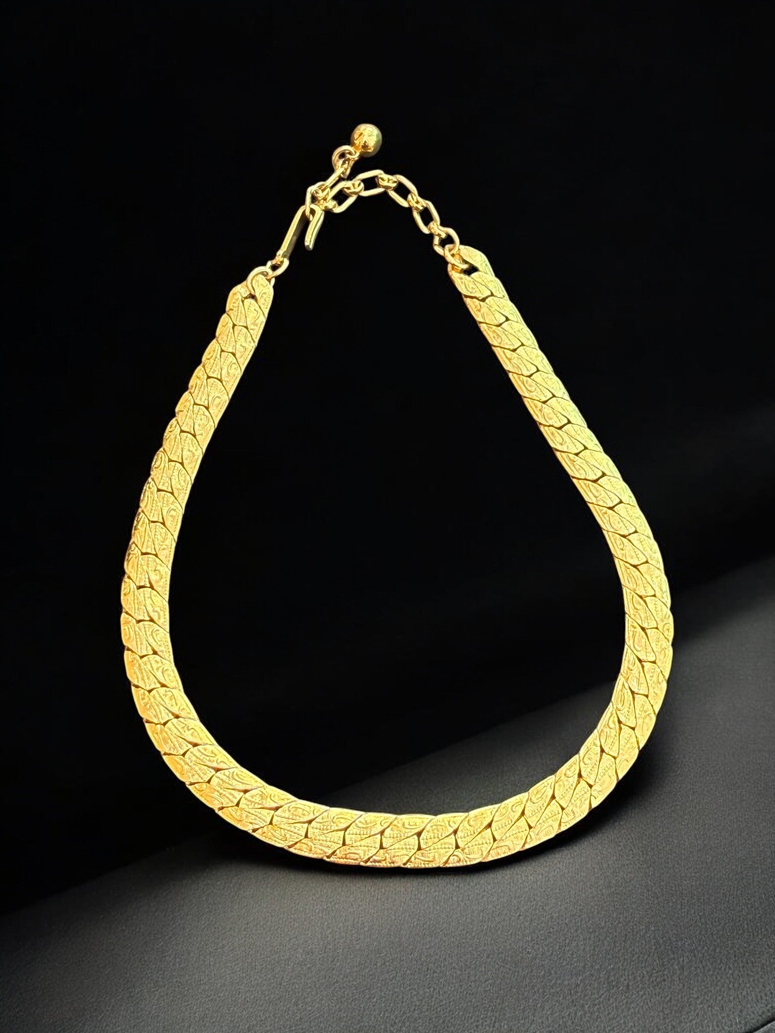The Trifari Serpent Choker is a sleek, statement-making piece that hugs the neckline with effortless confidence. Featuring a richly textured, scale-inspired design, this gold-tone choker reflects light beautifully, creating a smooth, luminous finish that feels both bold and refined. Its structured silhouette delivers a timeless vintage appeal while remaining modern enough for everyday wear. Perfect worn alone for a clean, elevated look or layered with longer chains for added drama, this choker embodies understated luxury with a powerful edge.